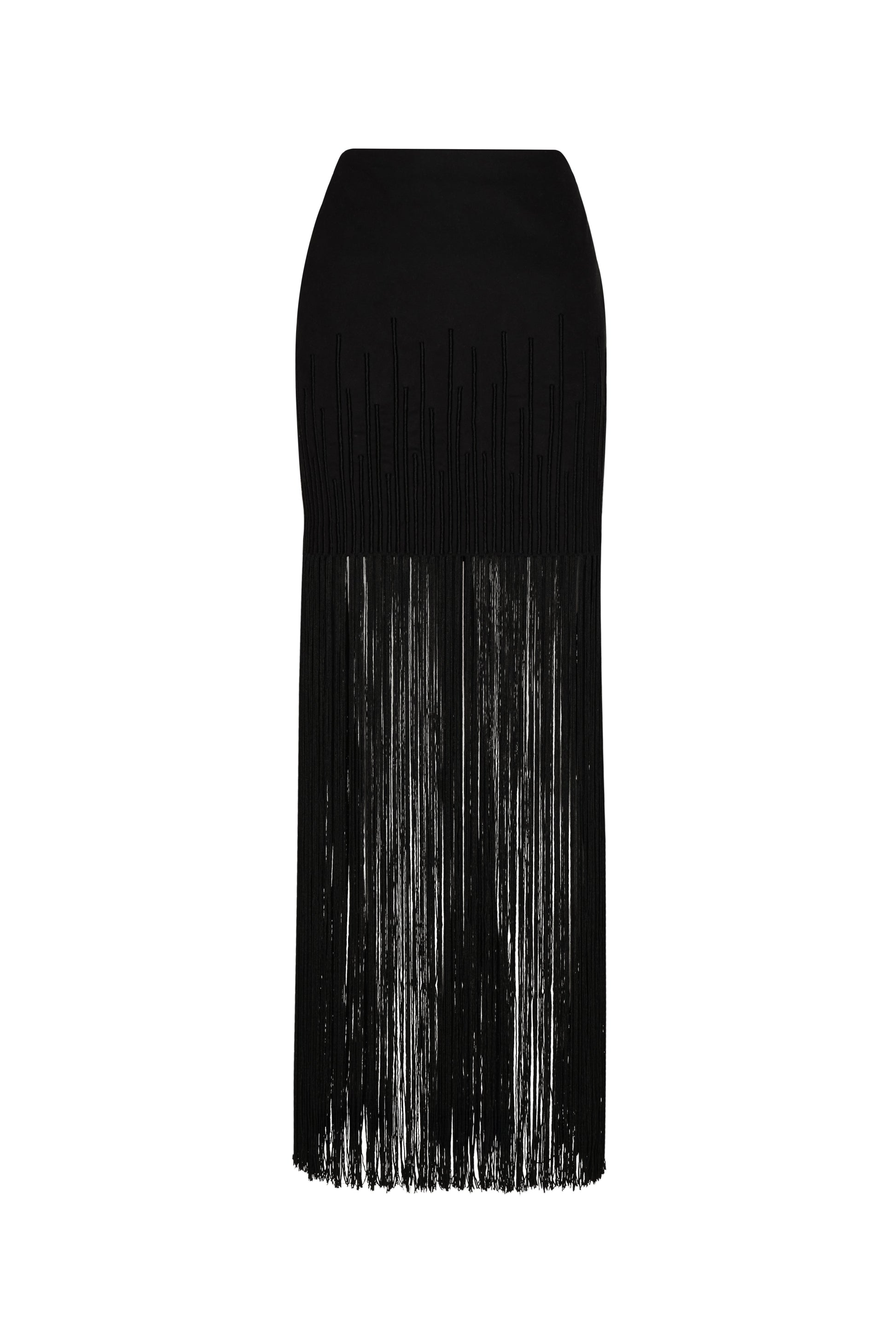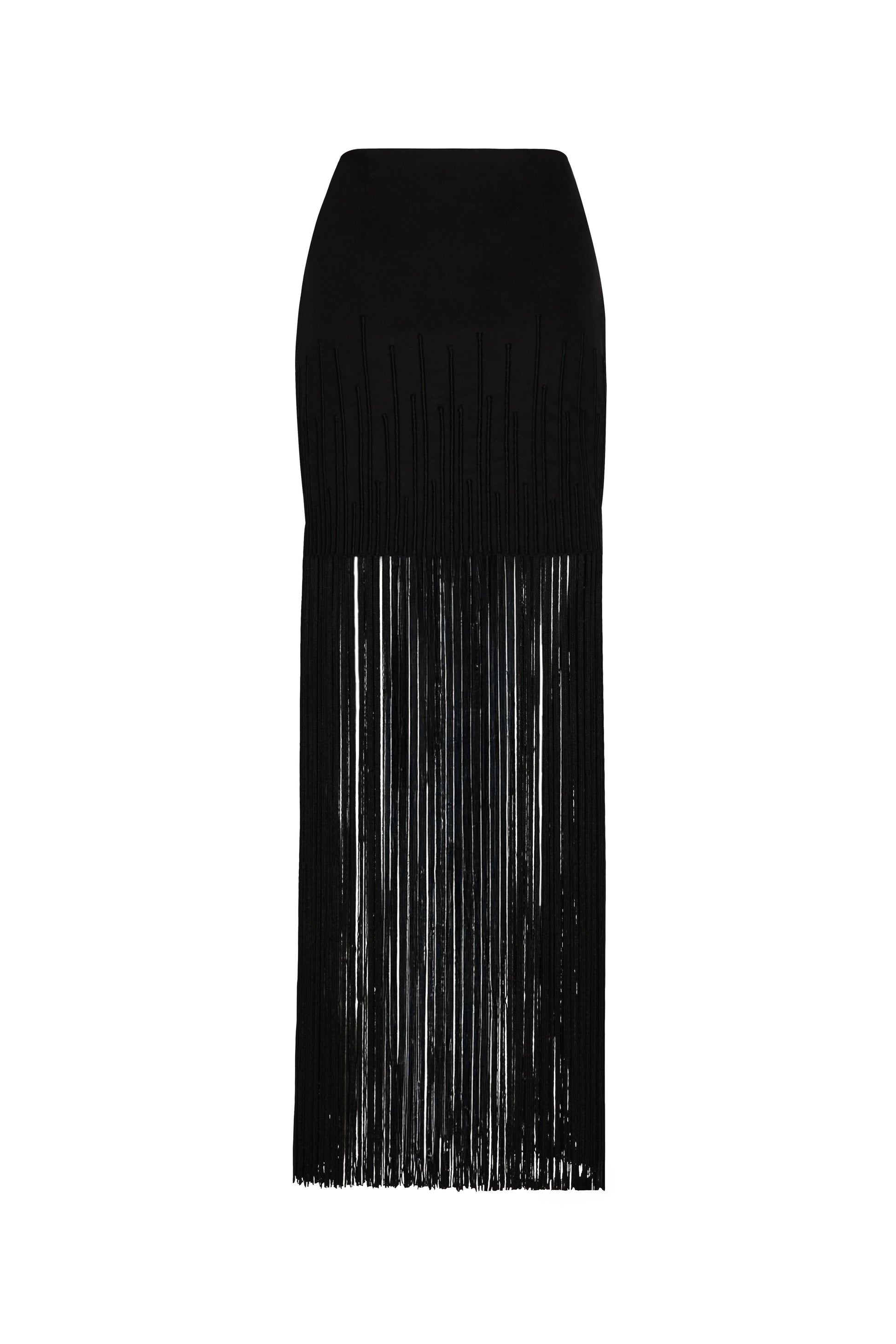 Aurora Sutil is an Black skirt with embroidery and long fringes. An elegant design that moves smoothly.