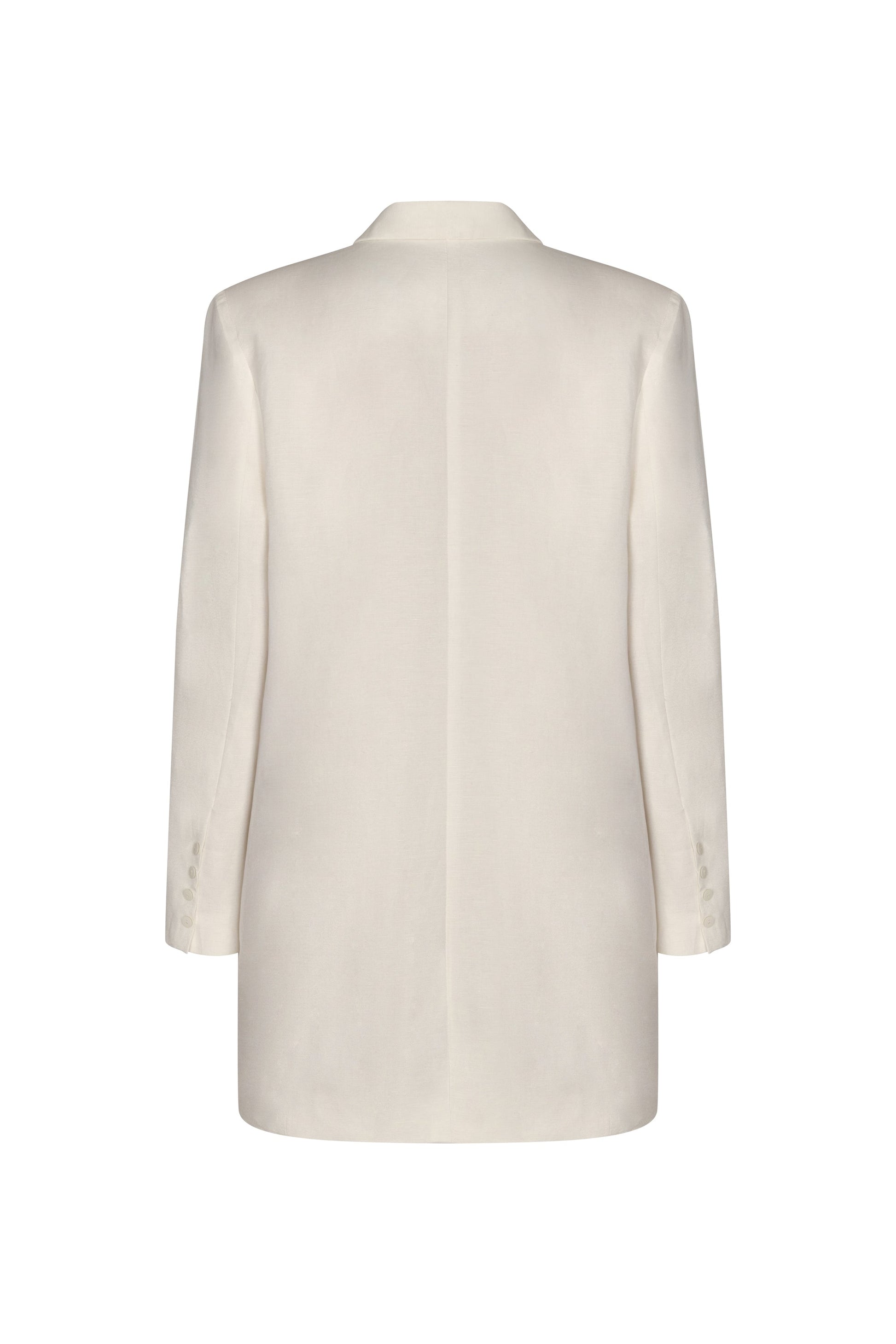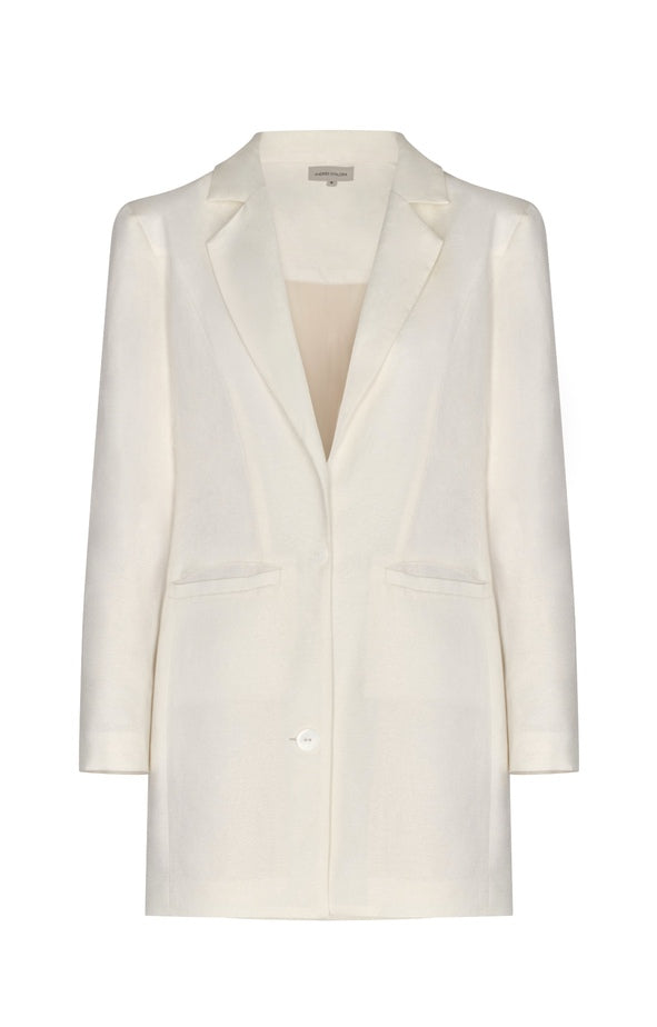 Short blazer in an off-white hue, crafted from 100% linen. It features a straight cut, classic lapels, and a hip-length silhouette. A lightweight garment with a defined structure.