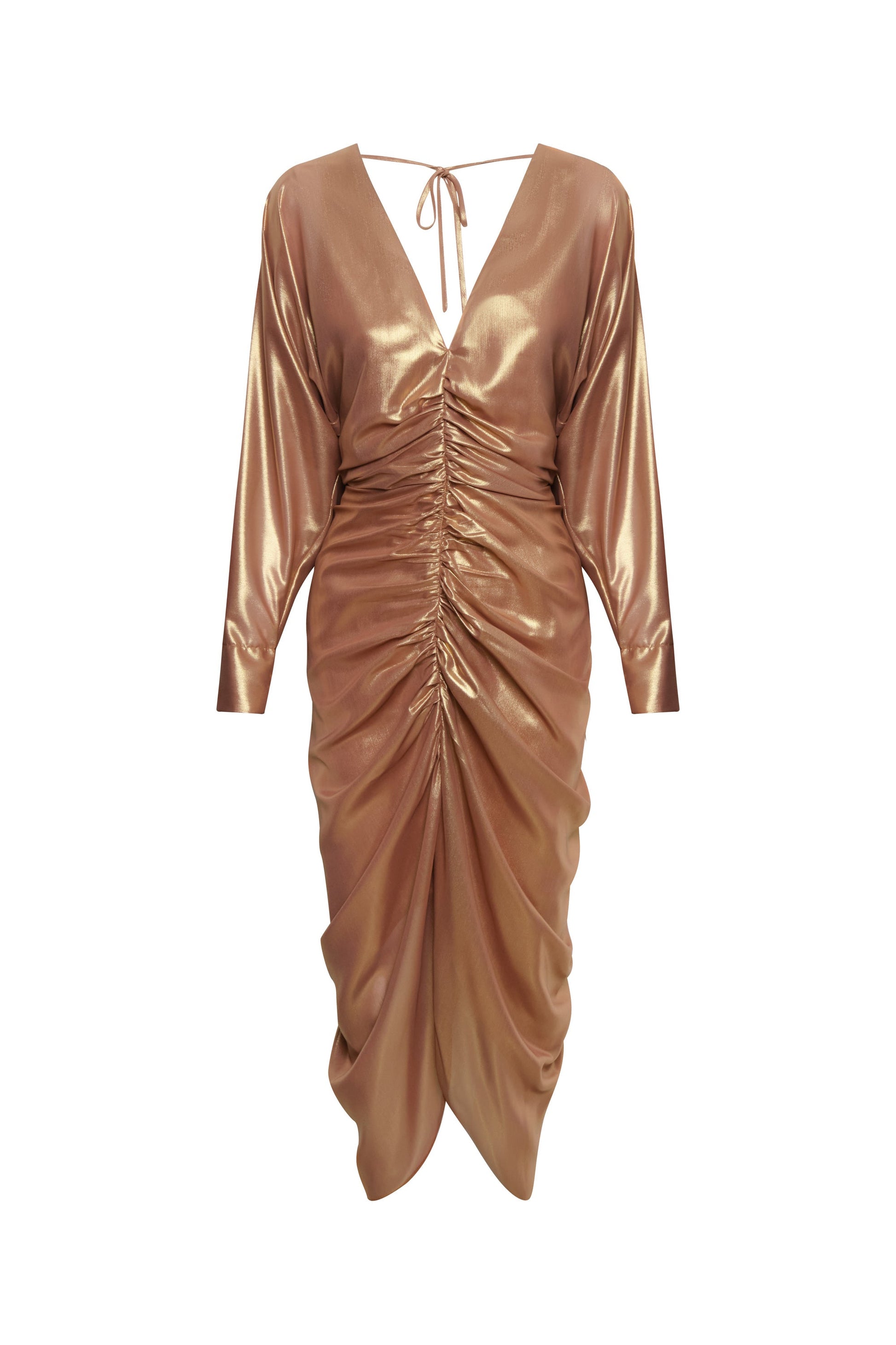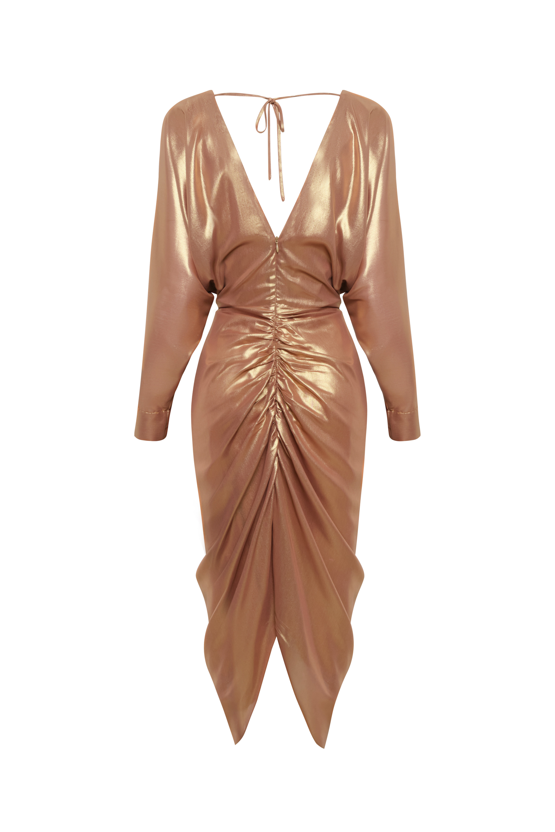 "Reflejo Timido" is a copper-toned caftan crafted from chiffon with a metallic finish. Inspired by the soft glimmer of nature, it envelops the silhouette with light and fluidity.