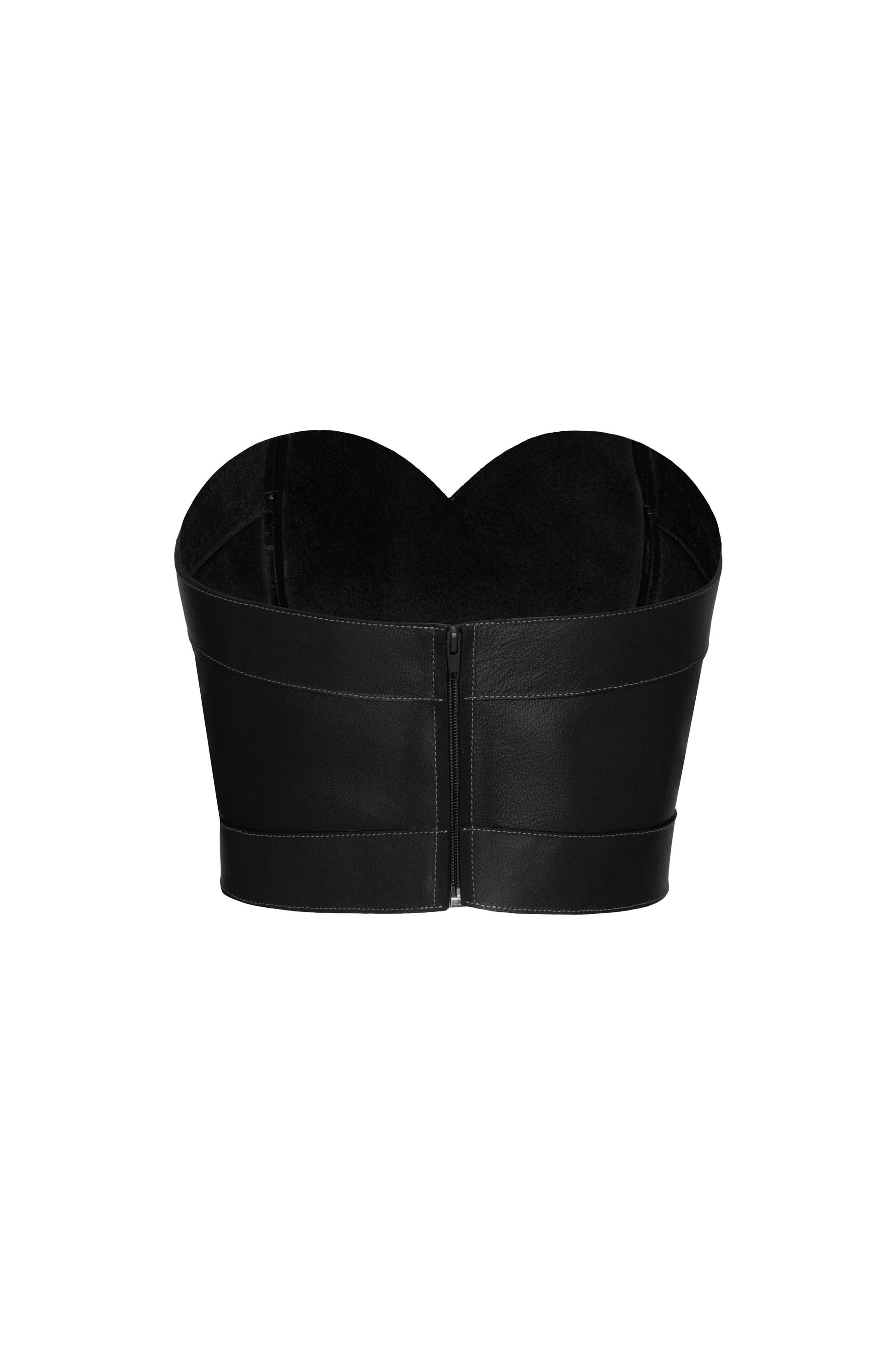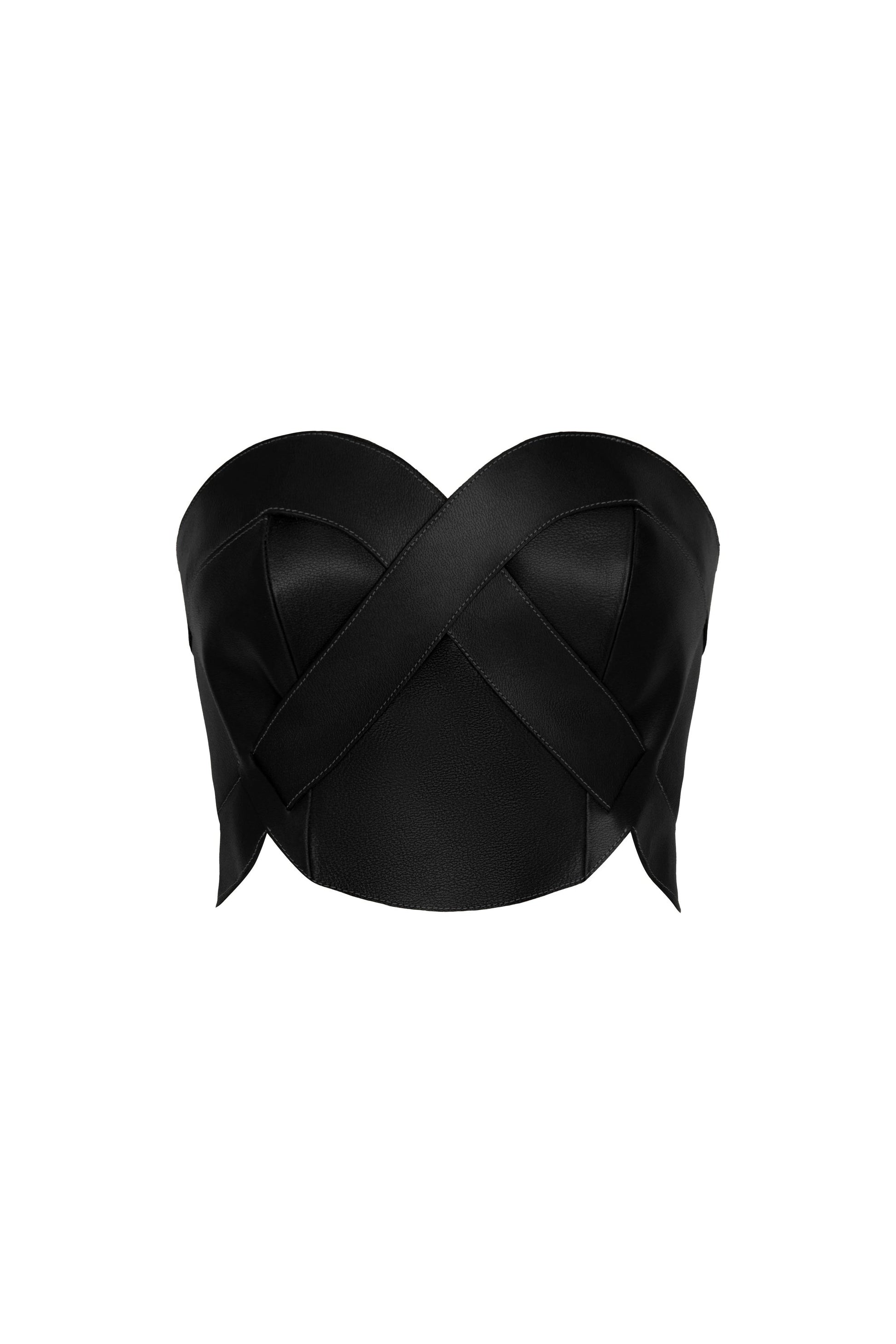 "Eco Claro" is a black leather top that stands out for its simplicity and elegance. Inspired by the organic power of nature, its structured design highlights the silhouette with a modern and refined touch.