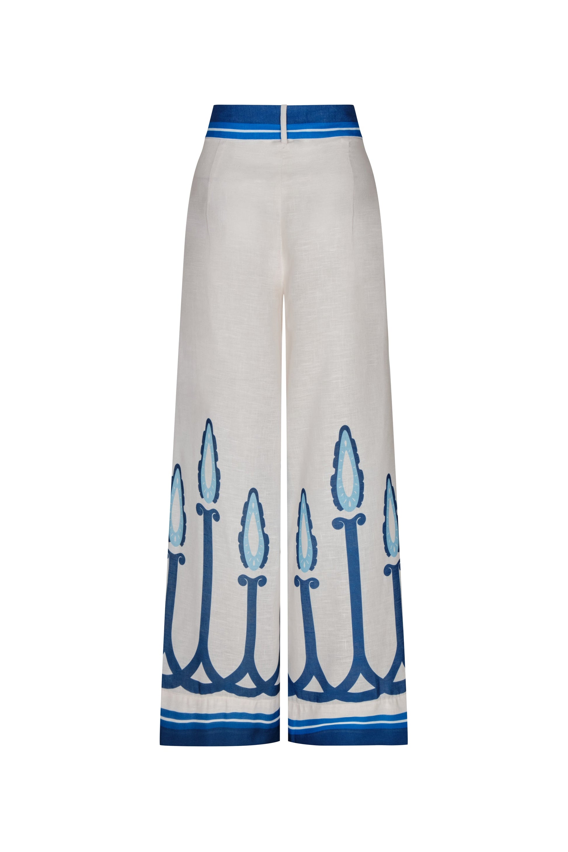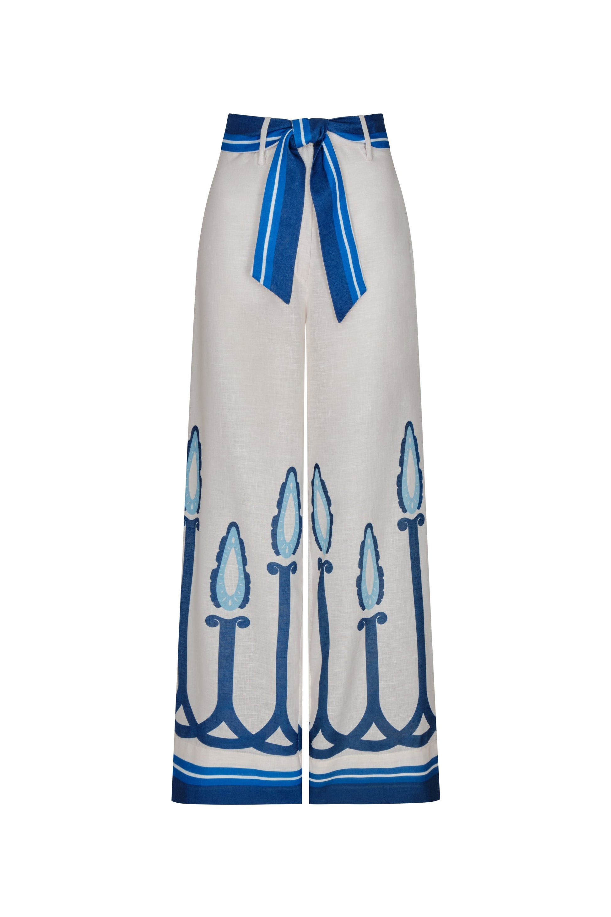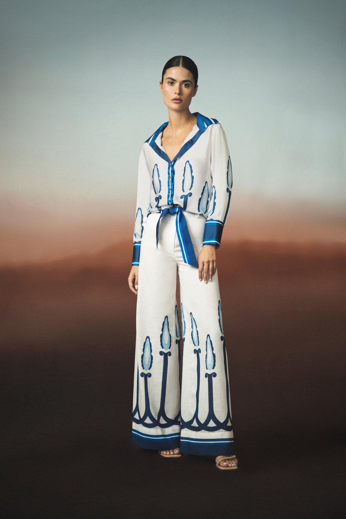 Susurro Ancestral: Pant with belt made from 100% linen. The Blue Torches print runs through the garment like a ceremony of ancient shapes and vibrant lines. A piece of subtle presence and timeless spirit.