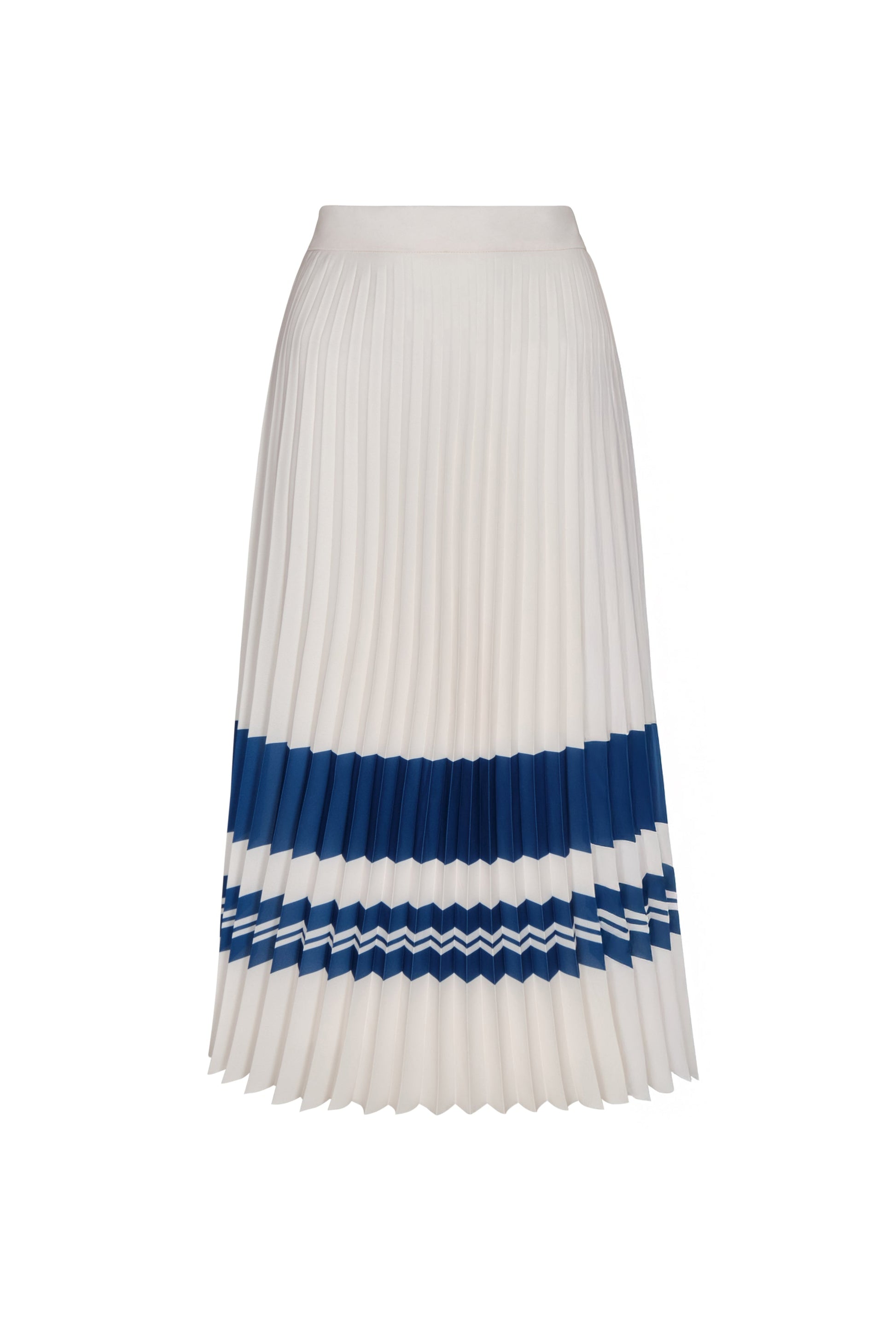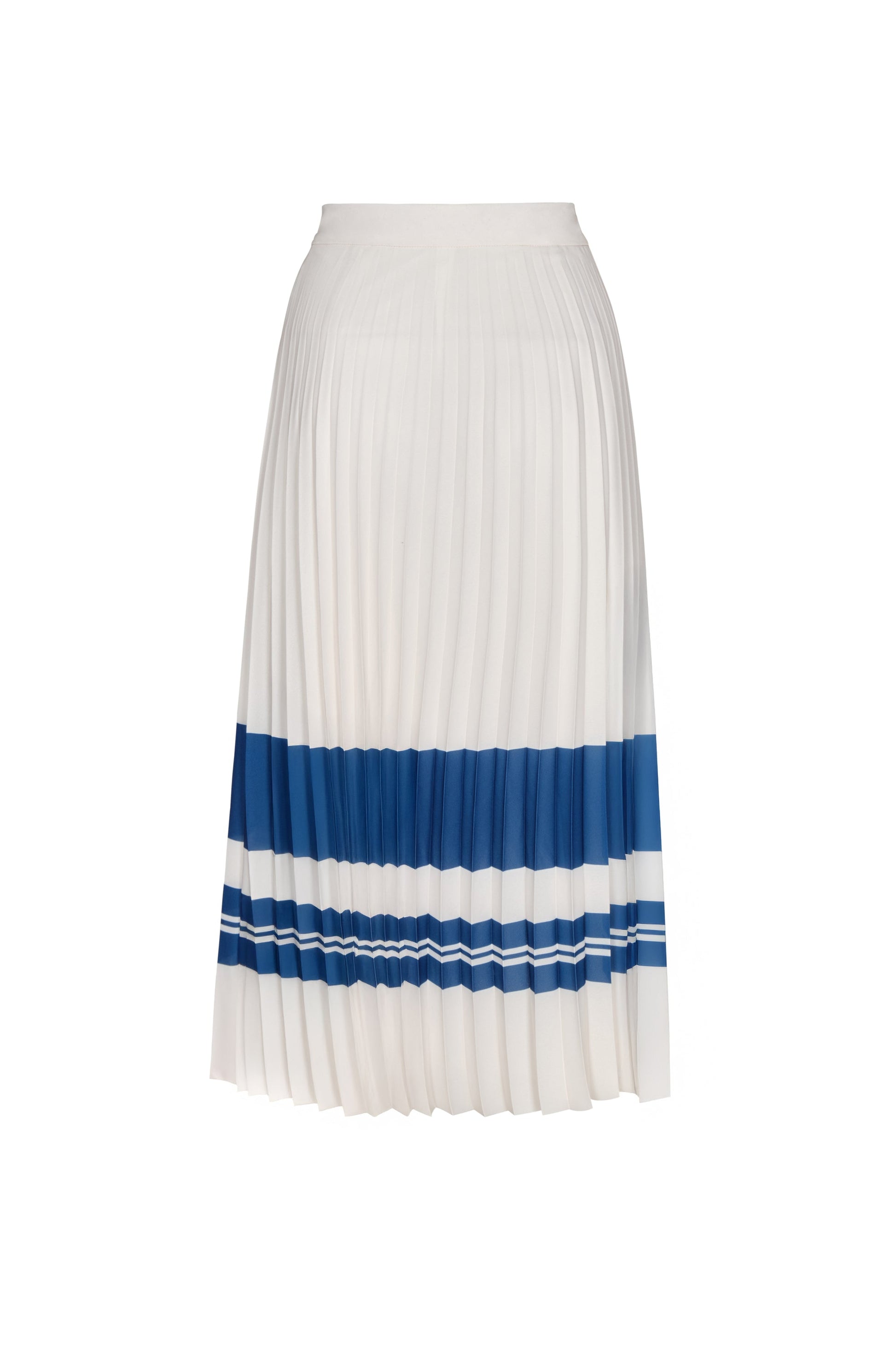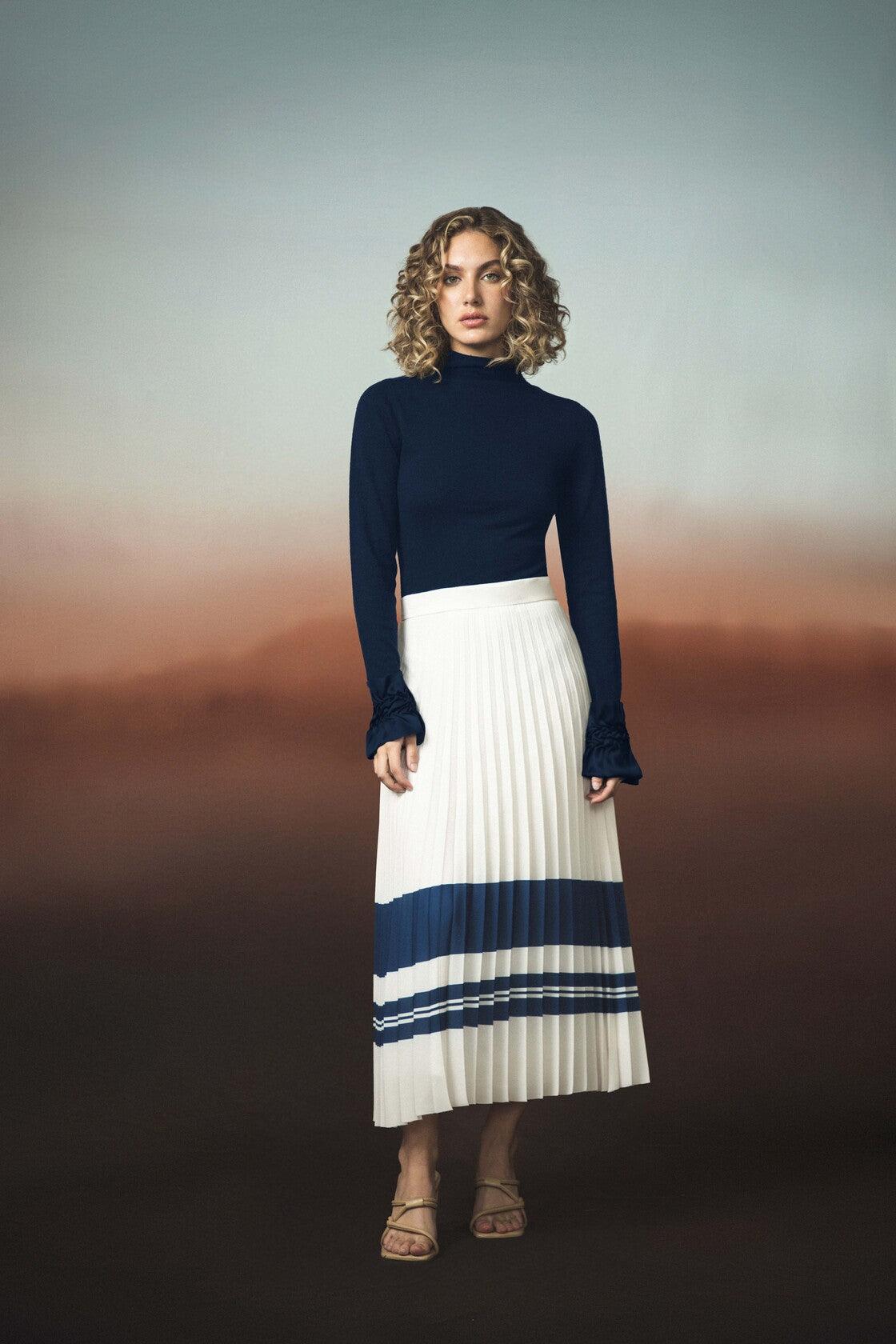 Gesto Integro: is a pleated midi skirt with blue stripes. Its light and flowing design makes it perfect for adding a special touch to any look.