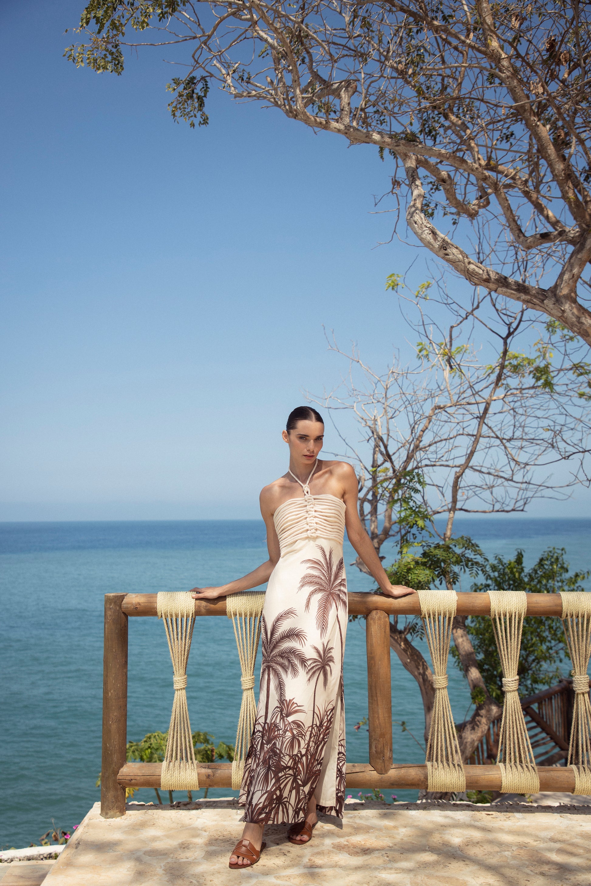 Midi dress crafted in 100% linen, featuring a sophisticated design with delicate ruching at the bodice and an evocative palm tree print in Mocha Paradiso. Its sleek silhouette and halter neckline detail make it a versatile and elegant piece