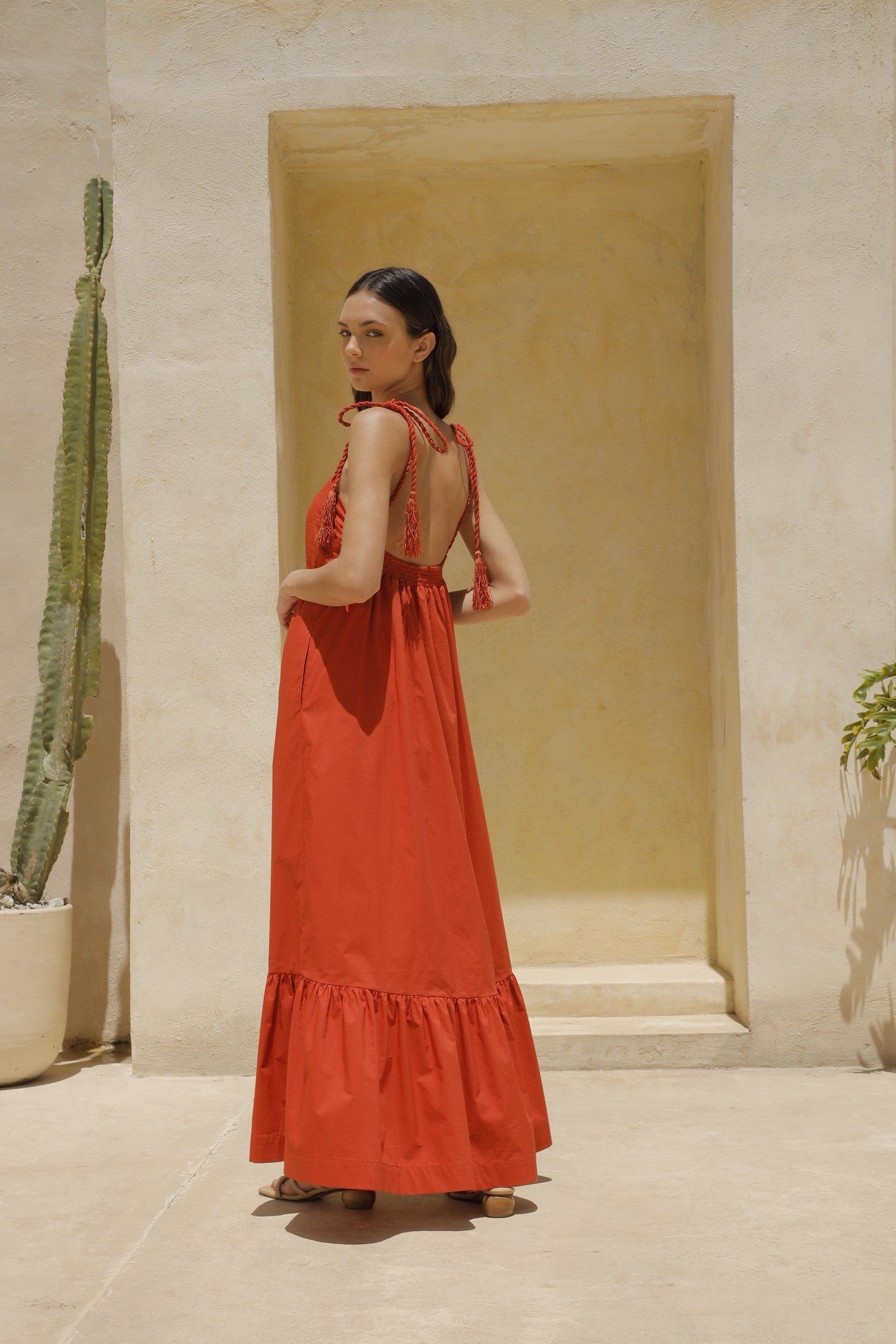 The Terakota dress, in cotton poplin, evokes the warmth of Jaipur with its terracotta hue. An elegant silhouette that reflects the timeless beauty of India.