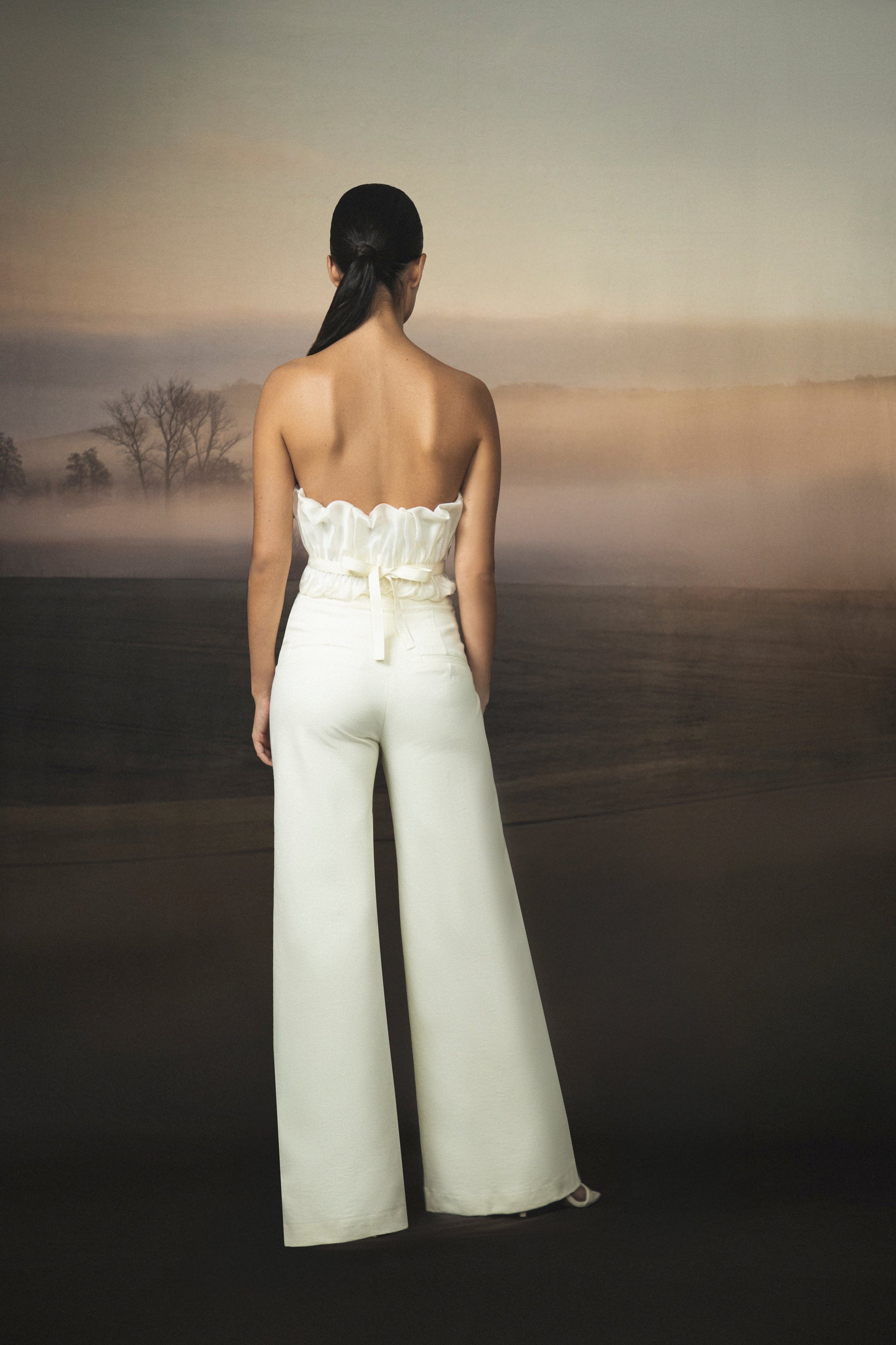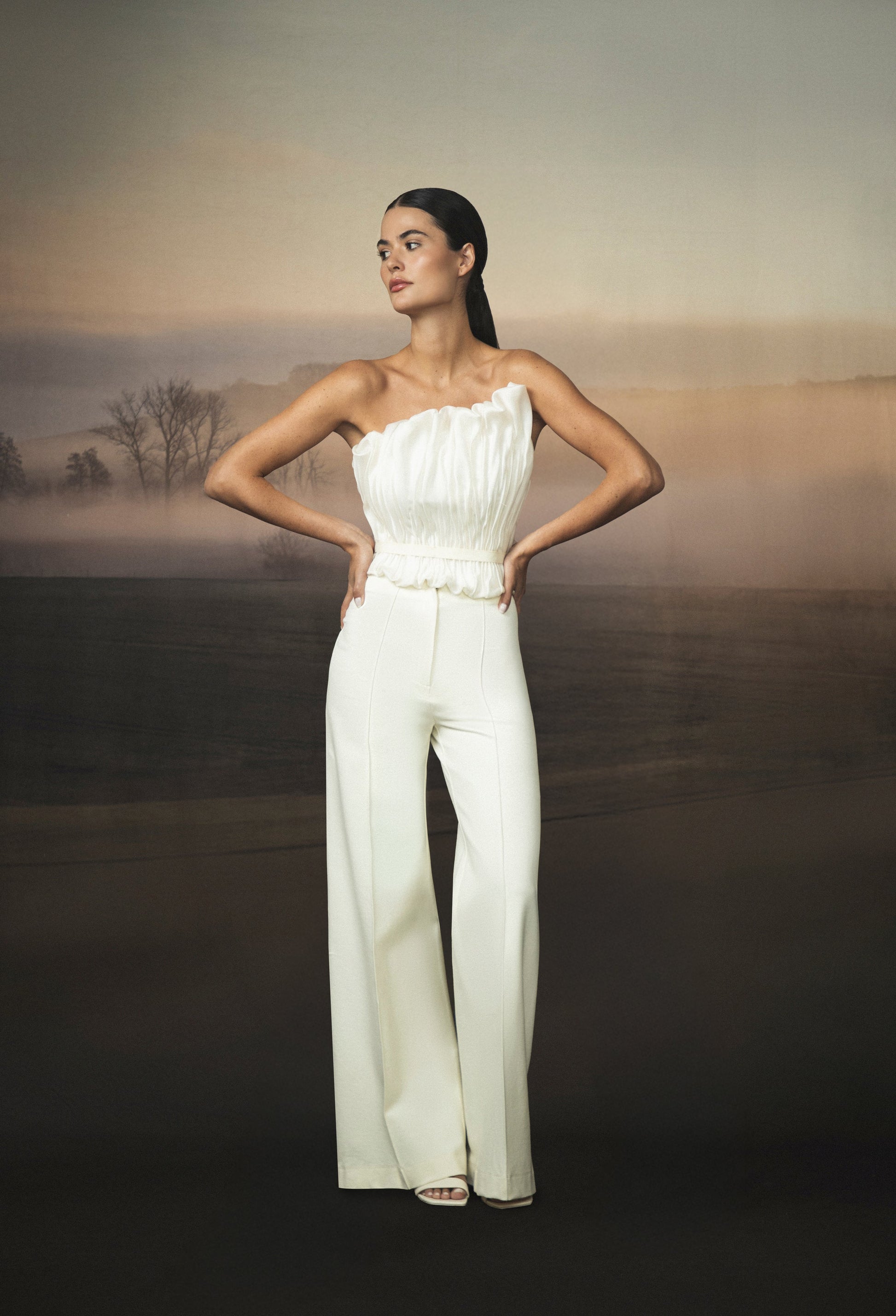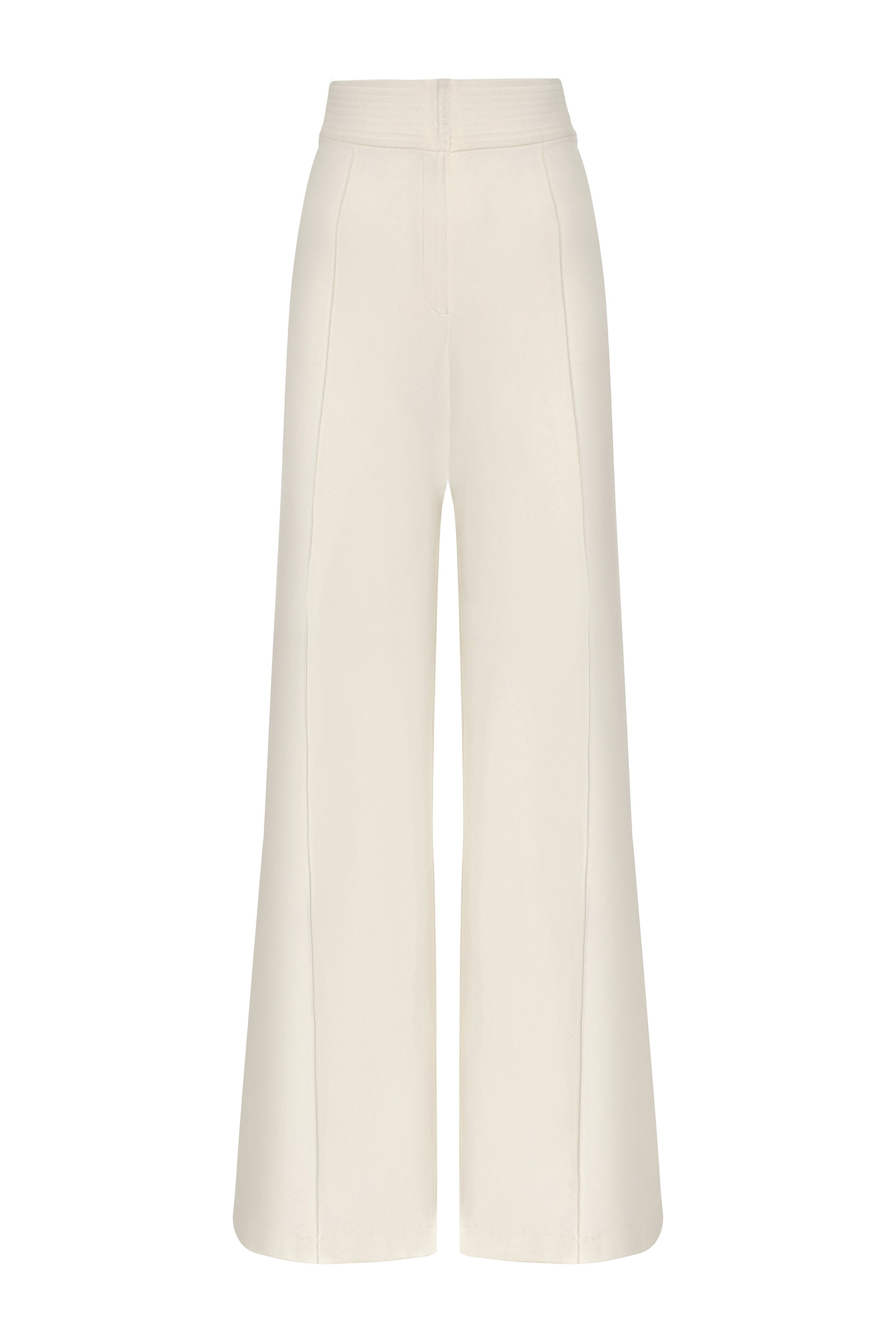 Pants made from a blend of rayon, nylon, and spandex. Their sleek Off-White silhouette hugs the body with softness and structure. An elegant piece, ready for any occasion.