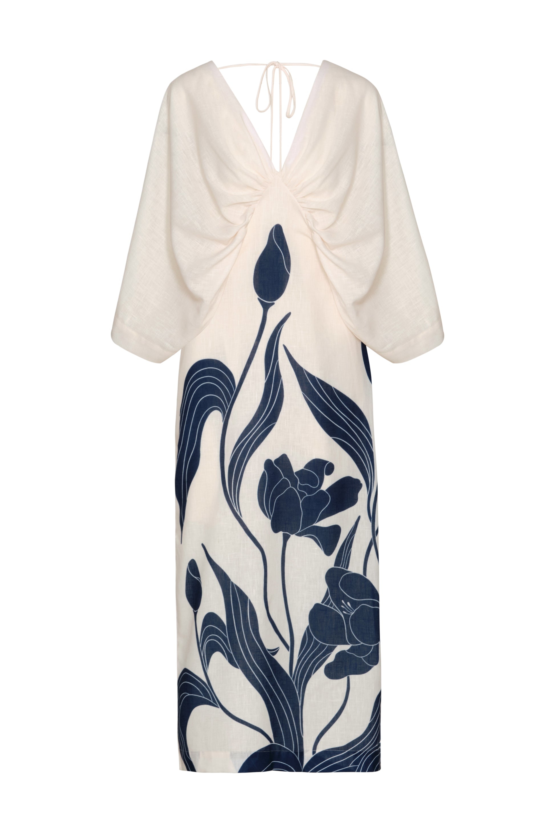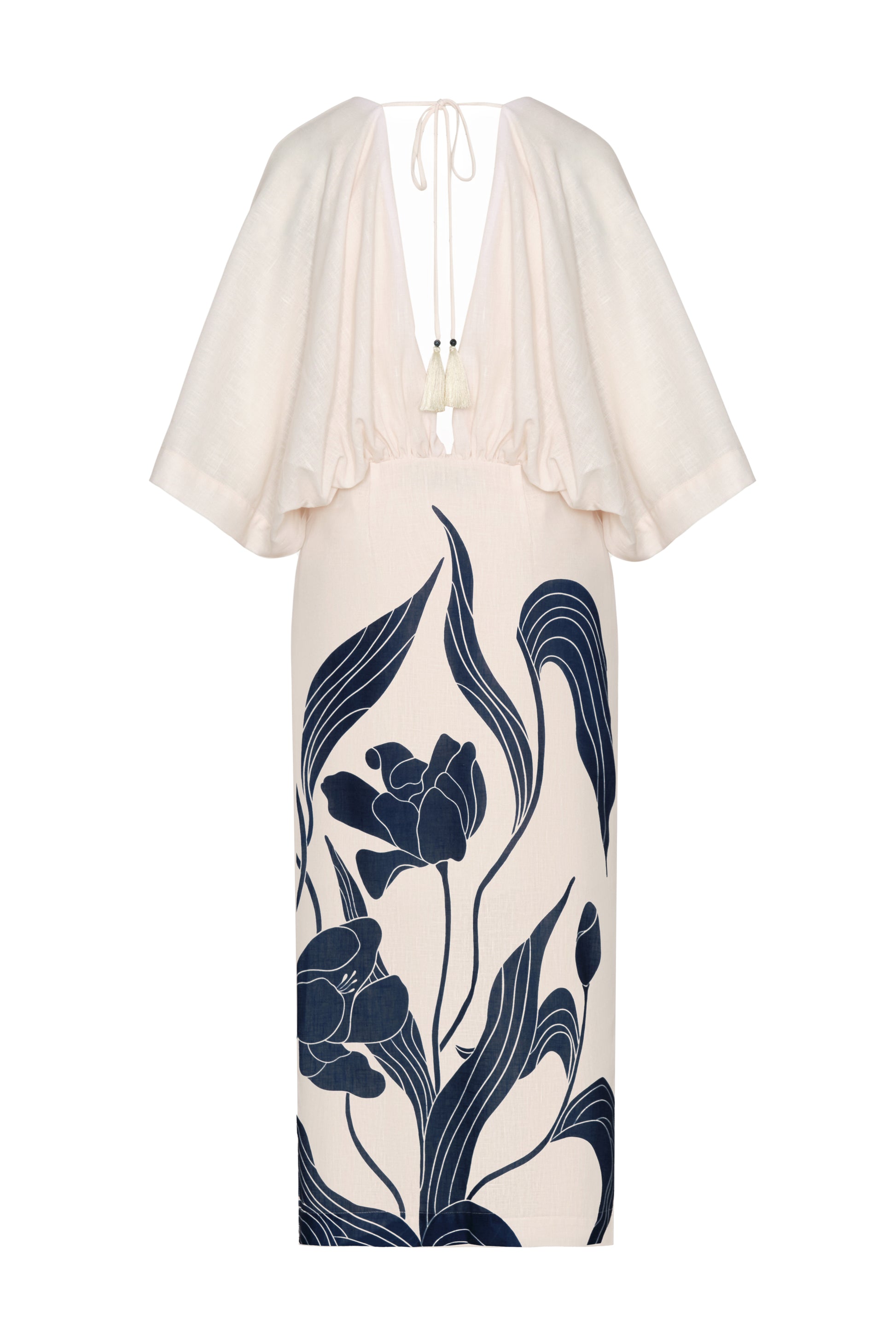 "Doble Flor" is an ivory linen midi dress with navy tulips. Feminine, light, and full of natural charm.