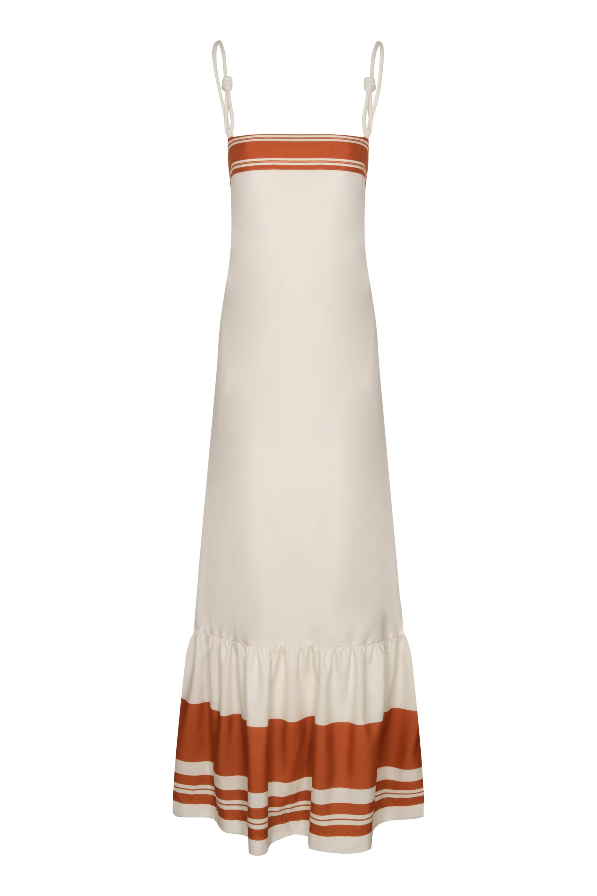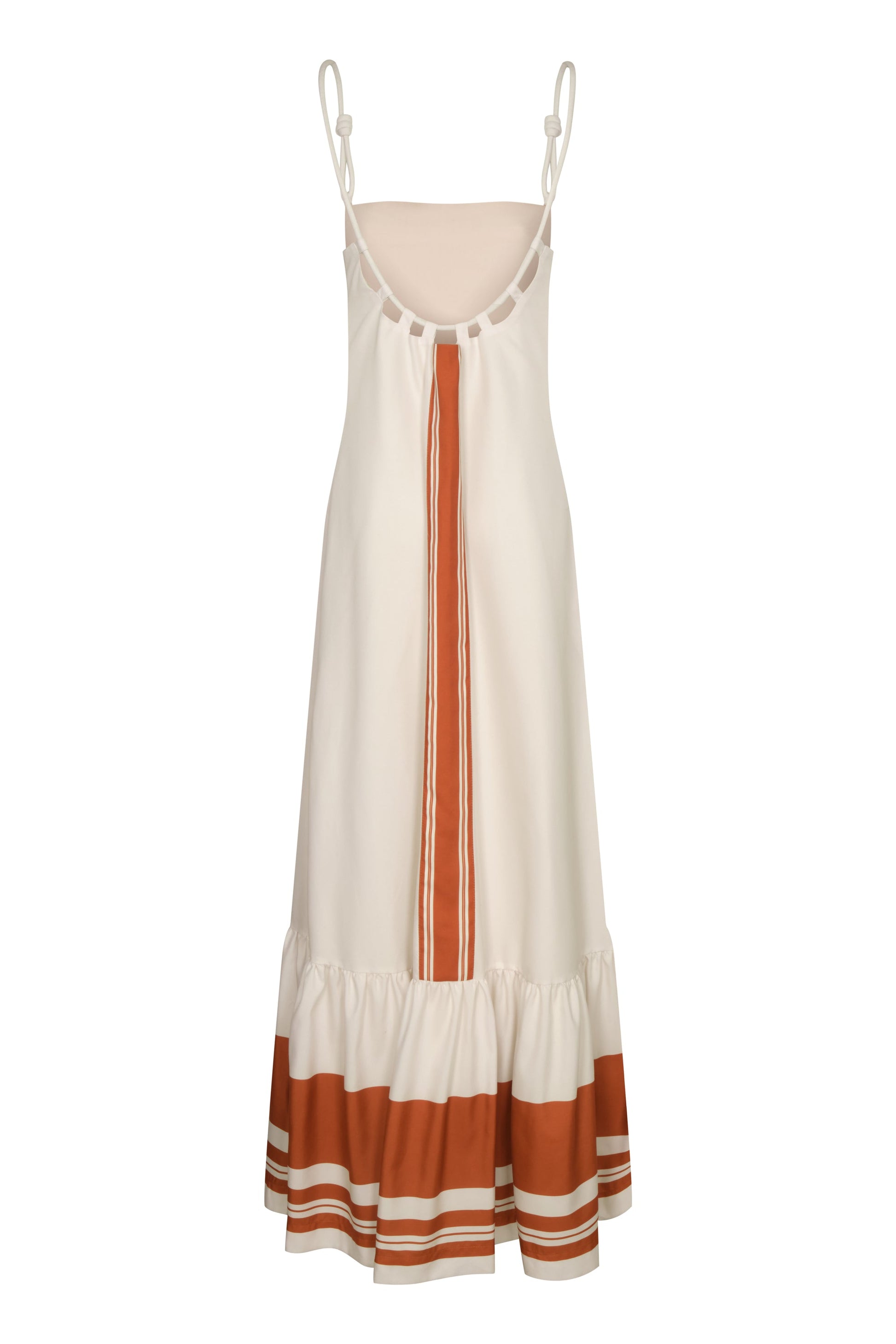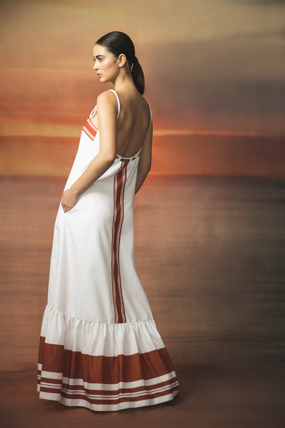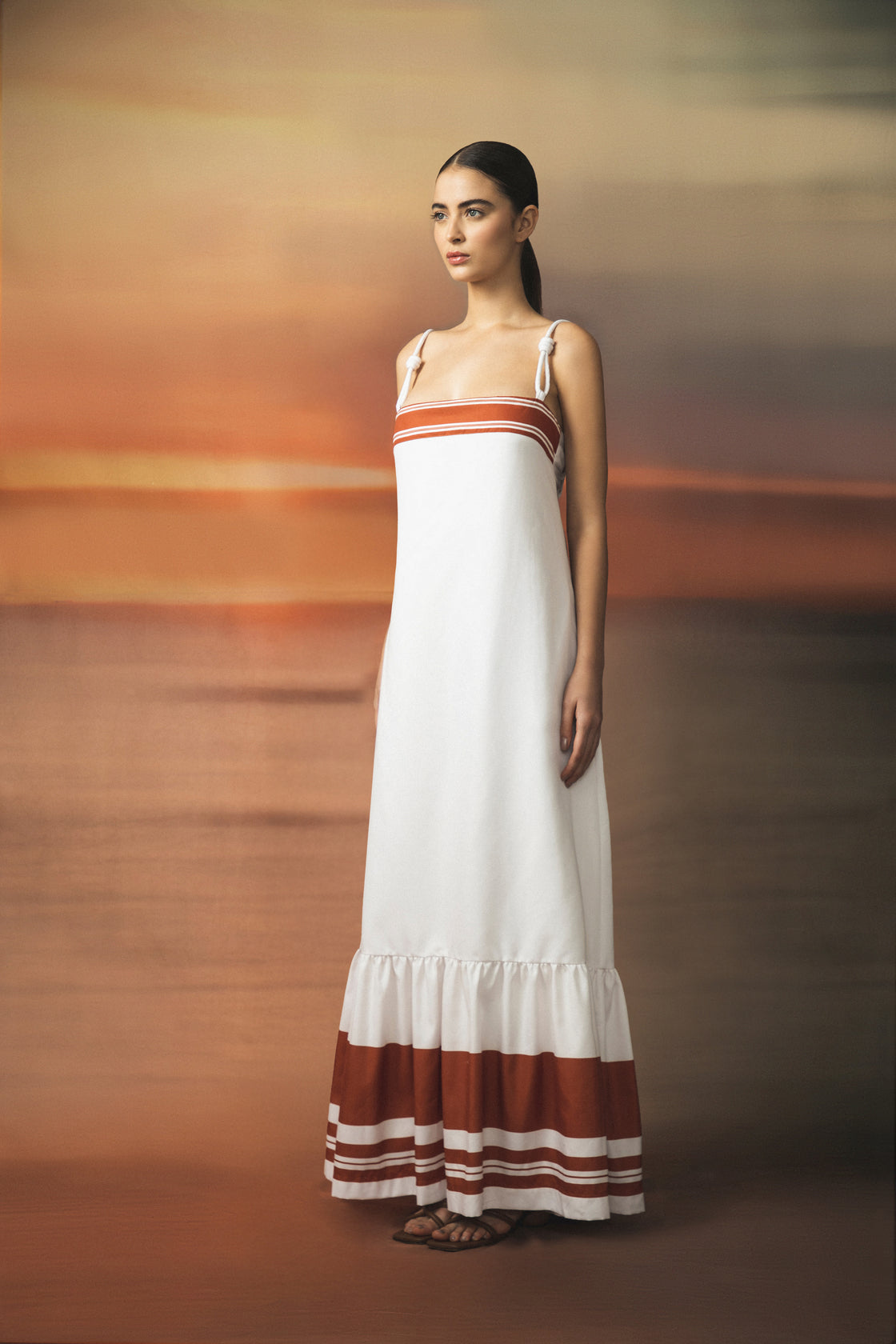 The Mis Raíces dress, a long, light silhouette with Orange Stripes that evoke connection and grounding. Inspired by the calm of the essential, this design stands out for its freshness and natural sophistication.