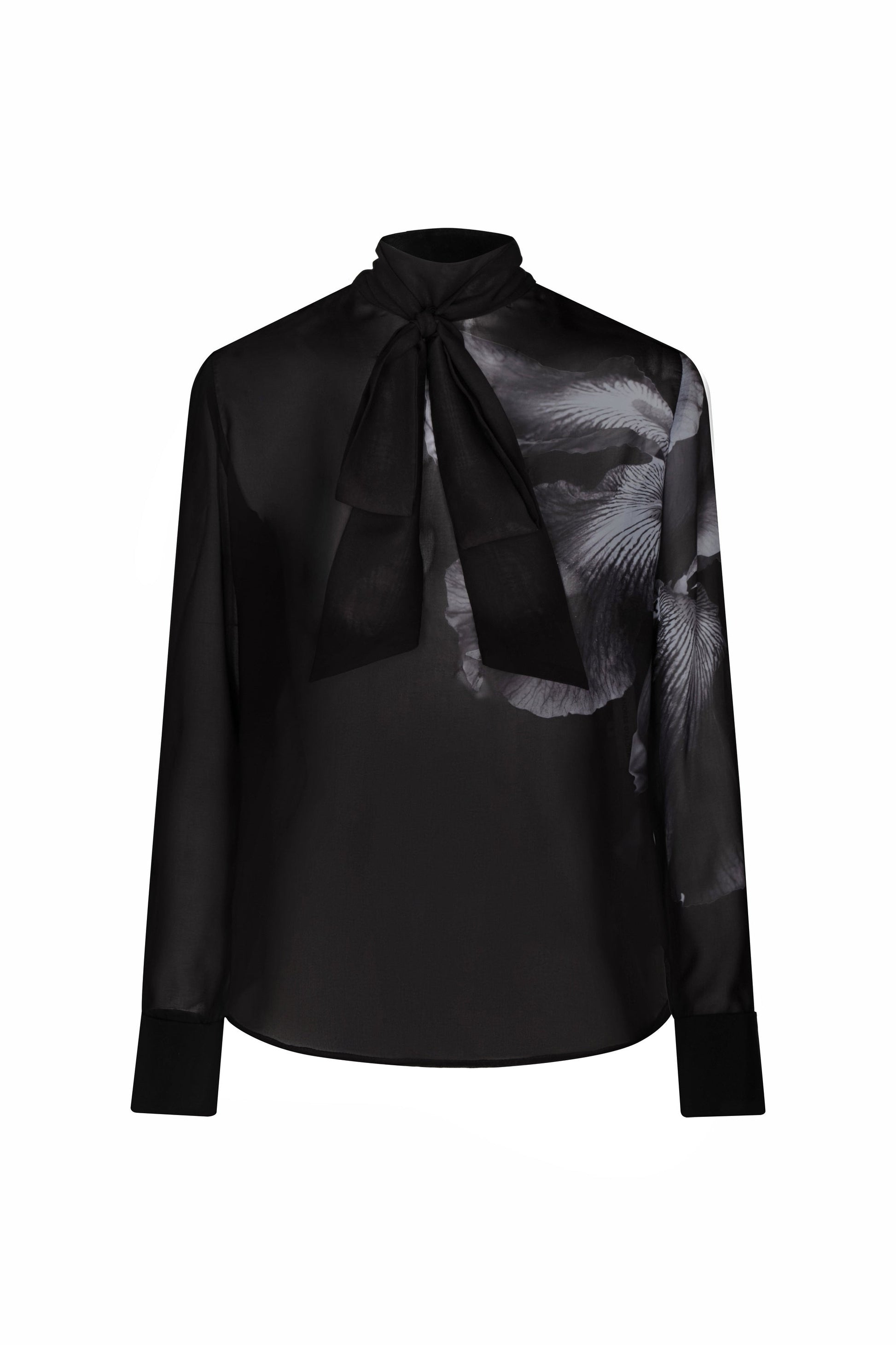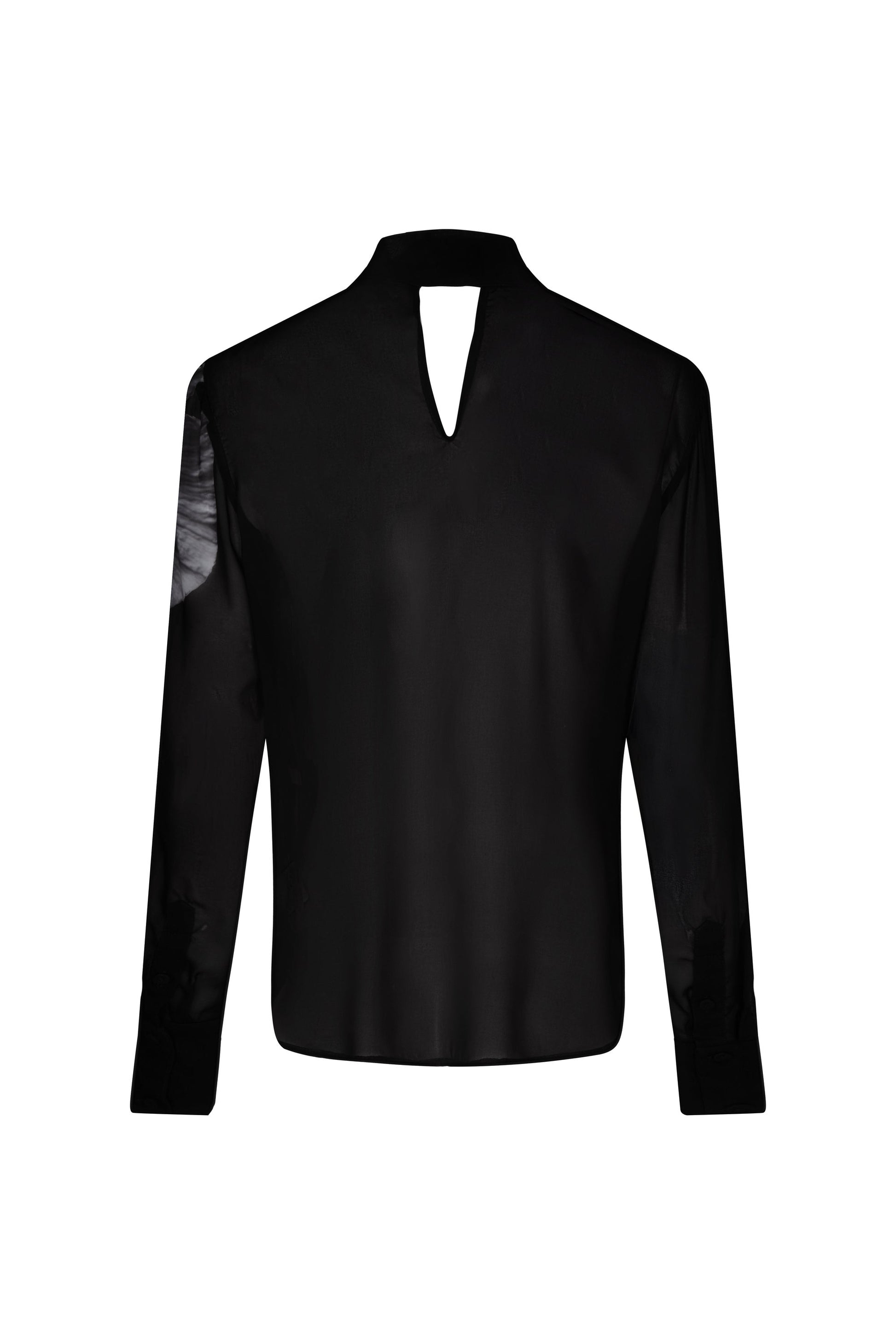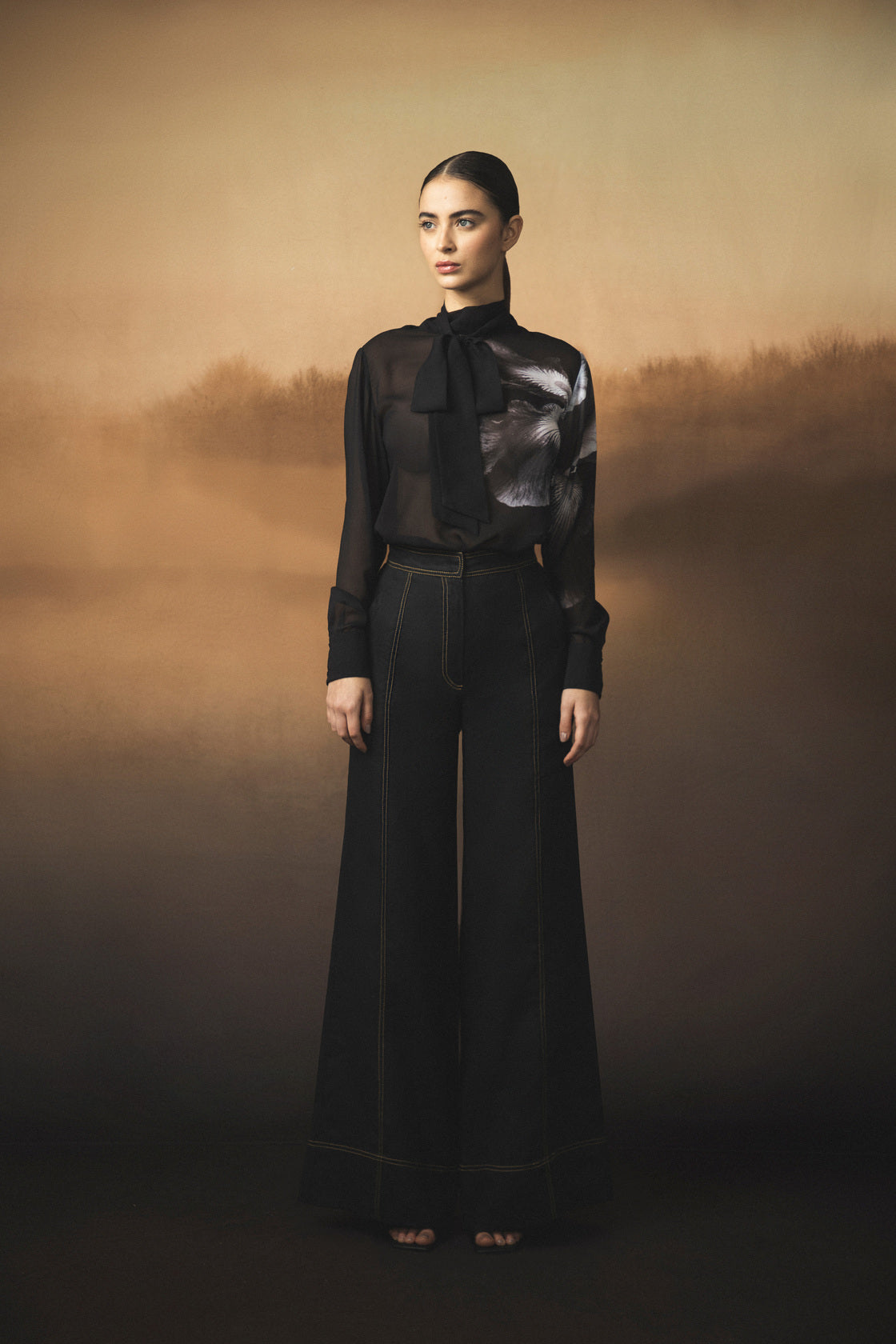 "Rastro Eterno" is a pussybow blouse made from recycled chiffon. Its bow at the neck and subtle dark-hued sheen give it a sophisticated and timeless look.