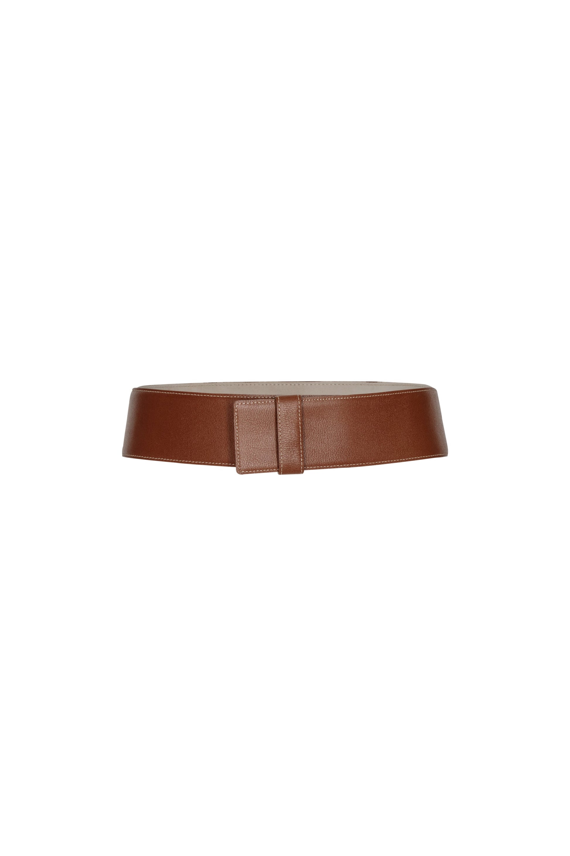 Brown belt made from 100% leather. Features a smooth finish and metallic buckle. A classic and timeless accessory.