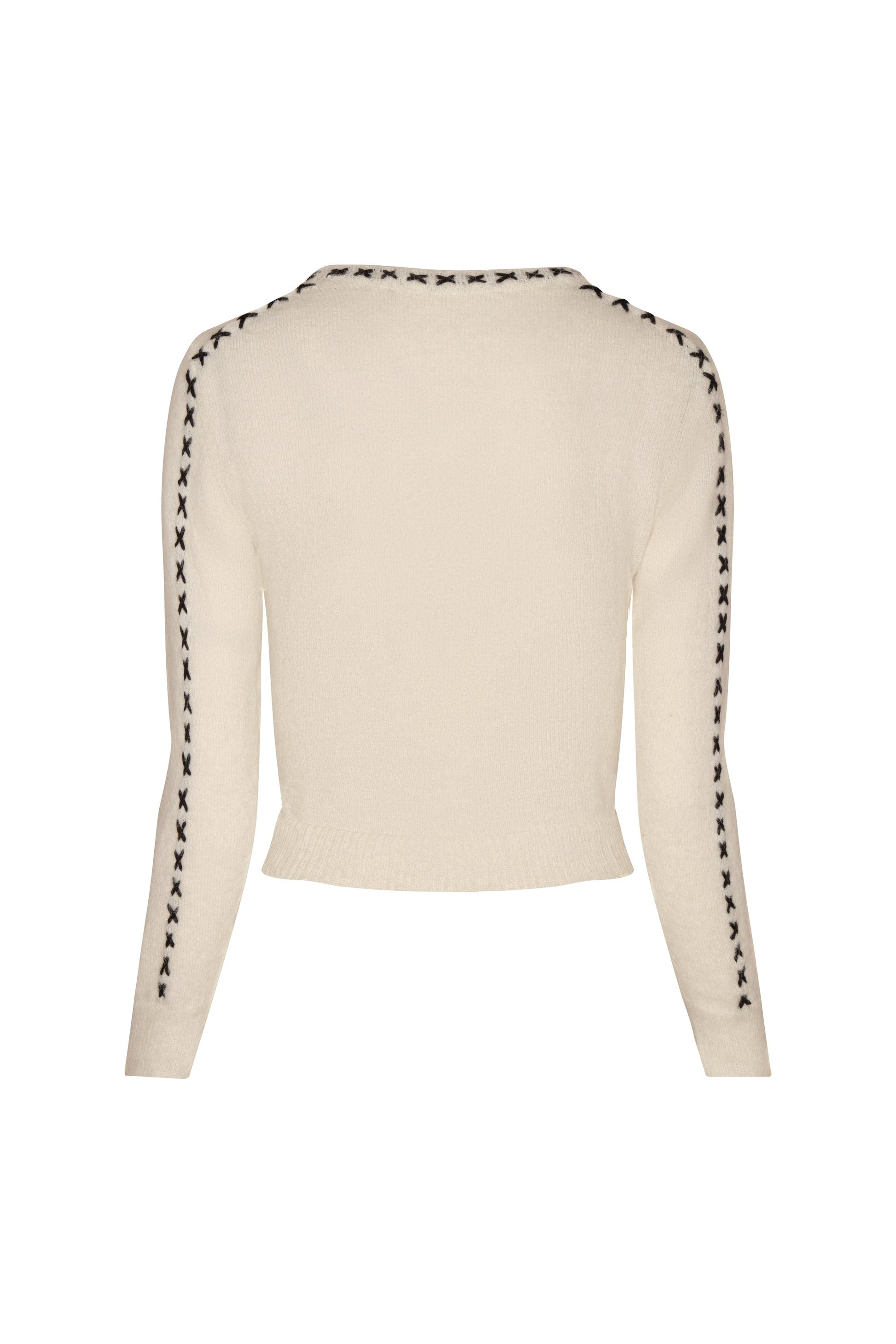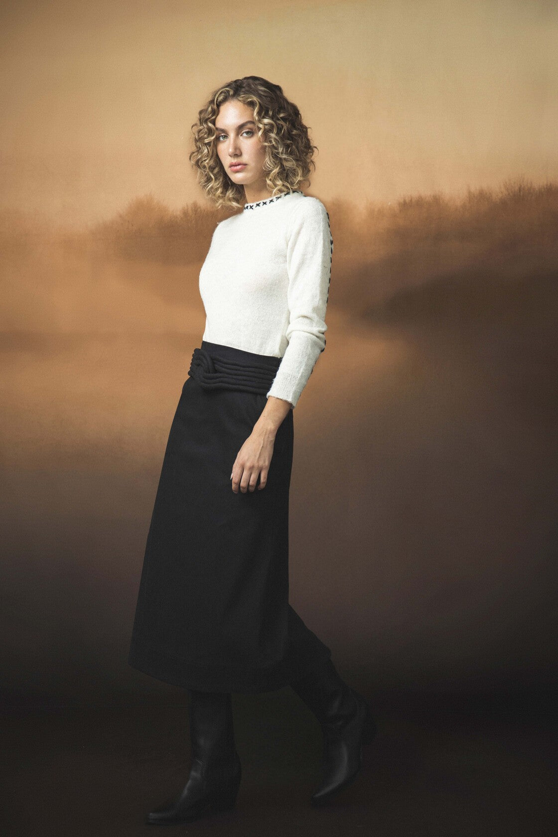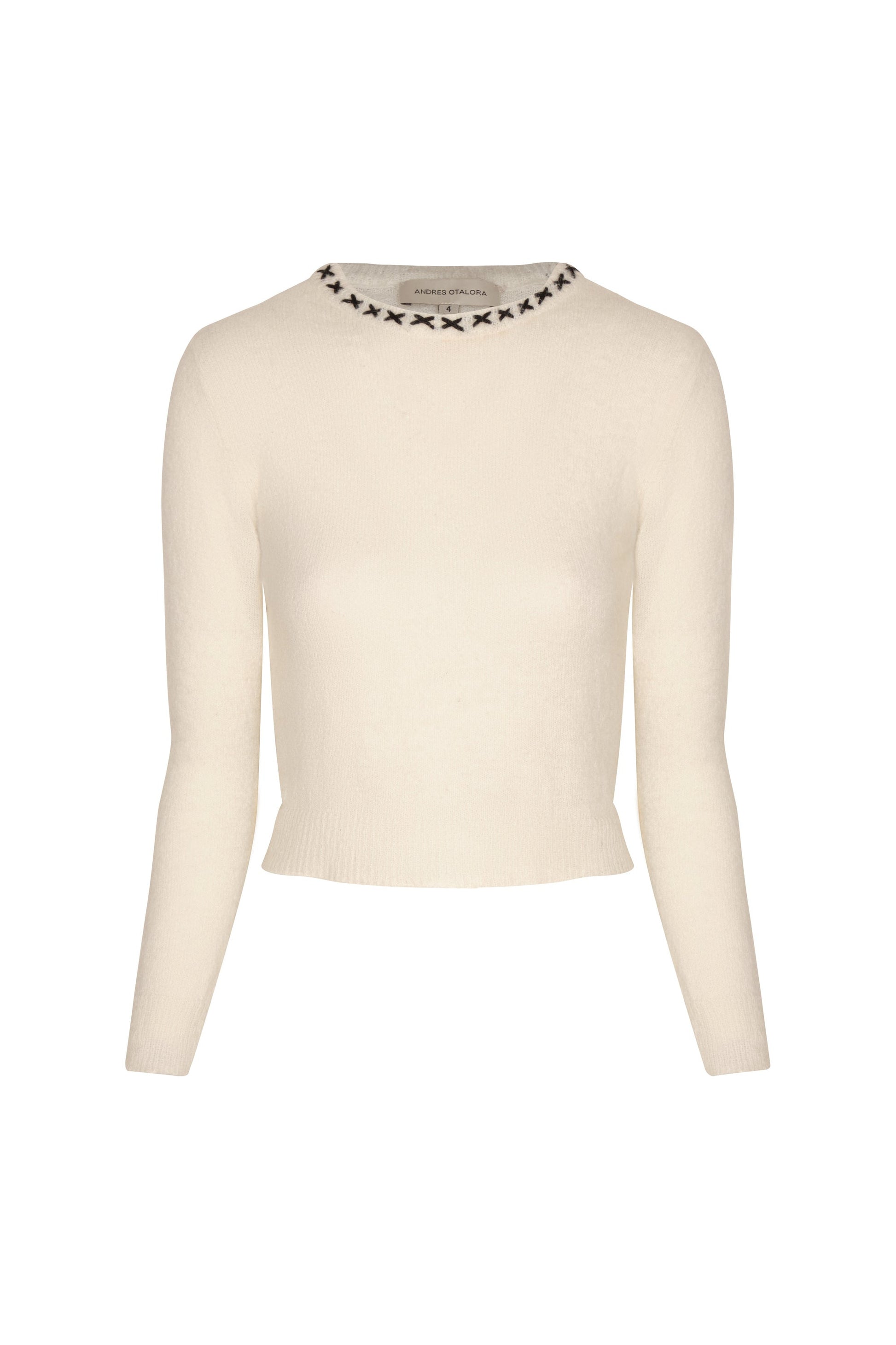 The Muy Leve Sweater embodies understated elegance with delicate embroidery along the neckline and sleeves. A timeless essential that redefines effortless sophistication.