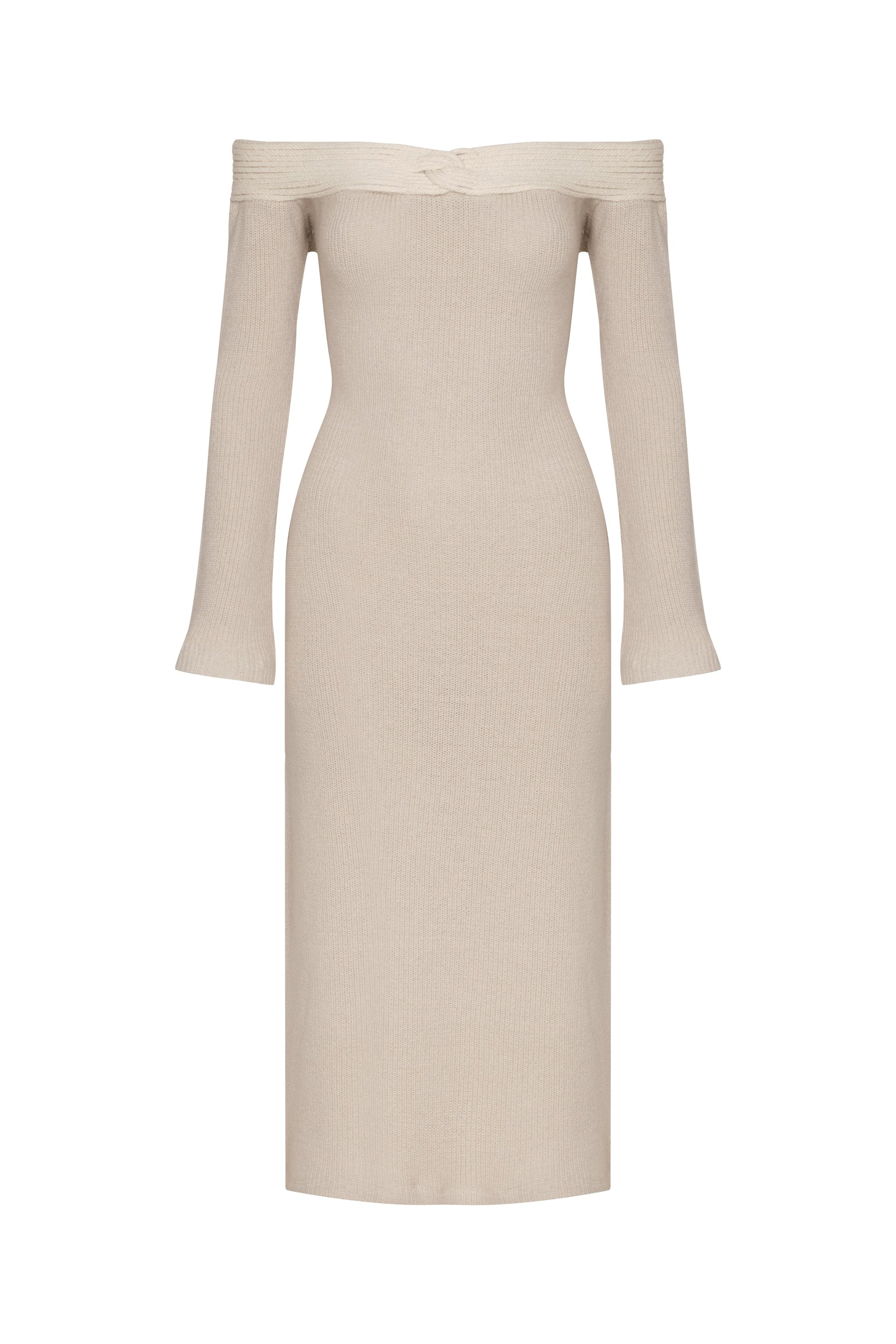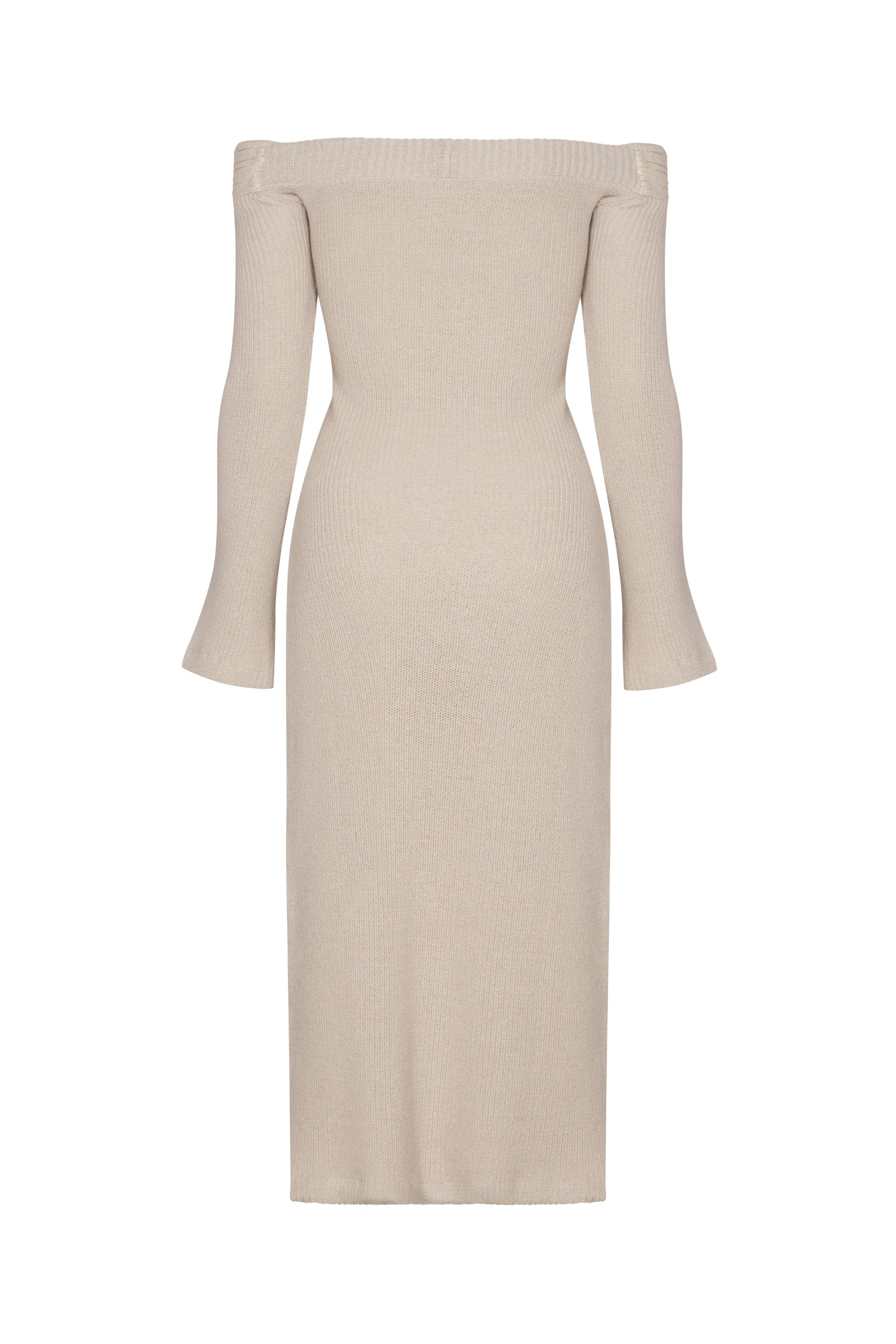 The Tramas dress, a woven design that hugs the body with softness and purity. With its off-the-shoulder silhouette and clean lines, it is an expression of calm, balance, and essential elegance.