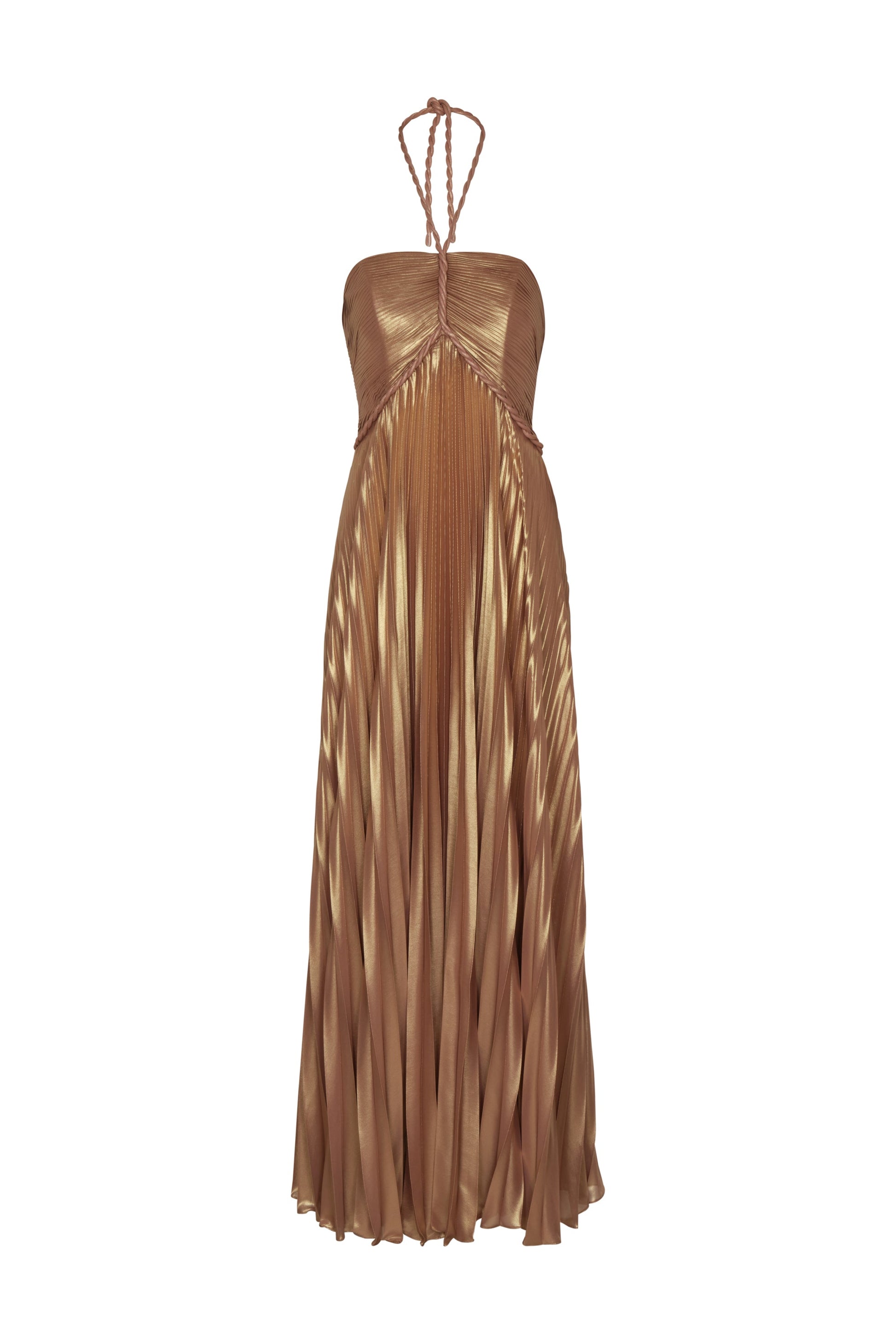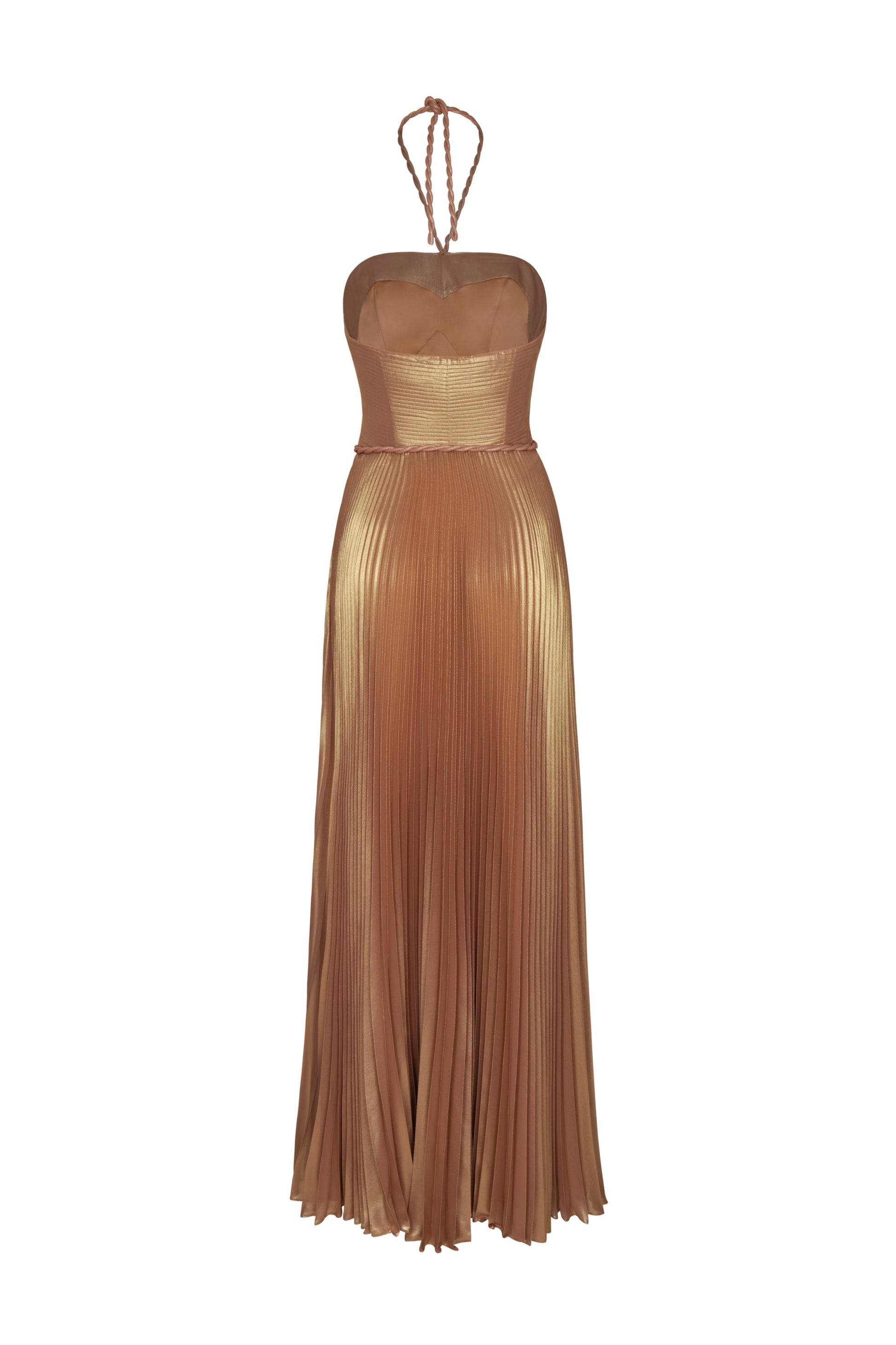 "Matiz Organico" is a long pleated dress crafted from metallic chiffon. Inspired by the textures of the earth, its copper hue reflects a warm and natural elegance.