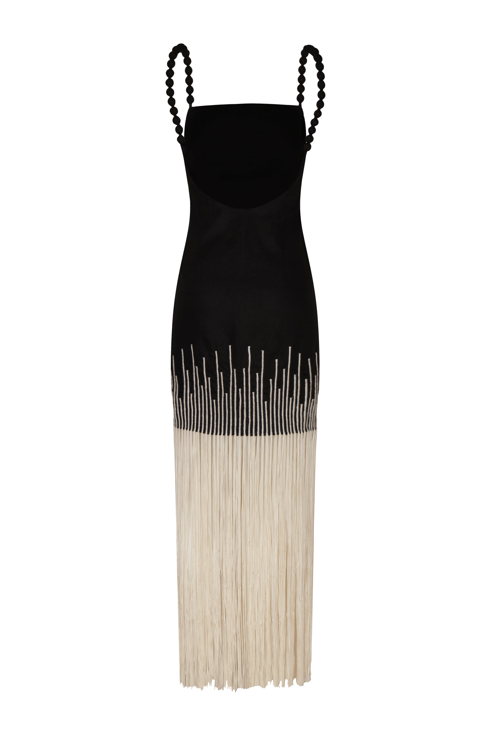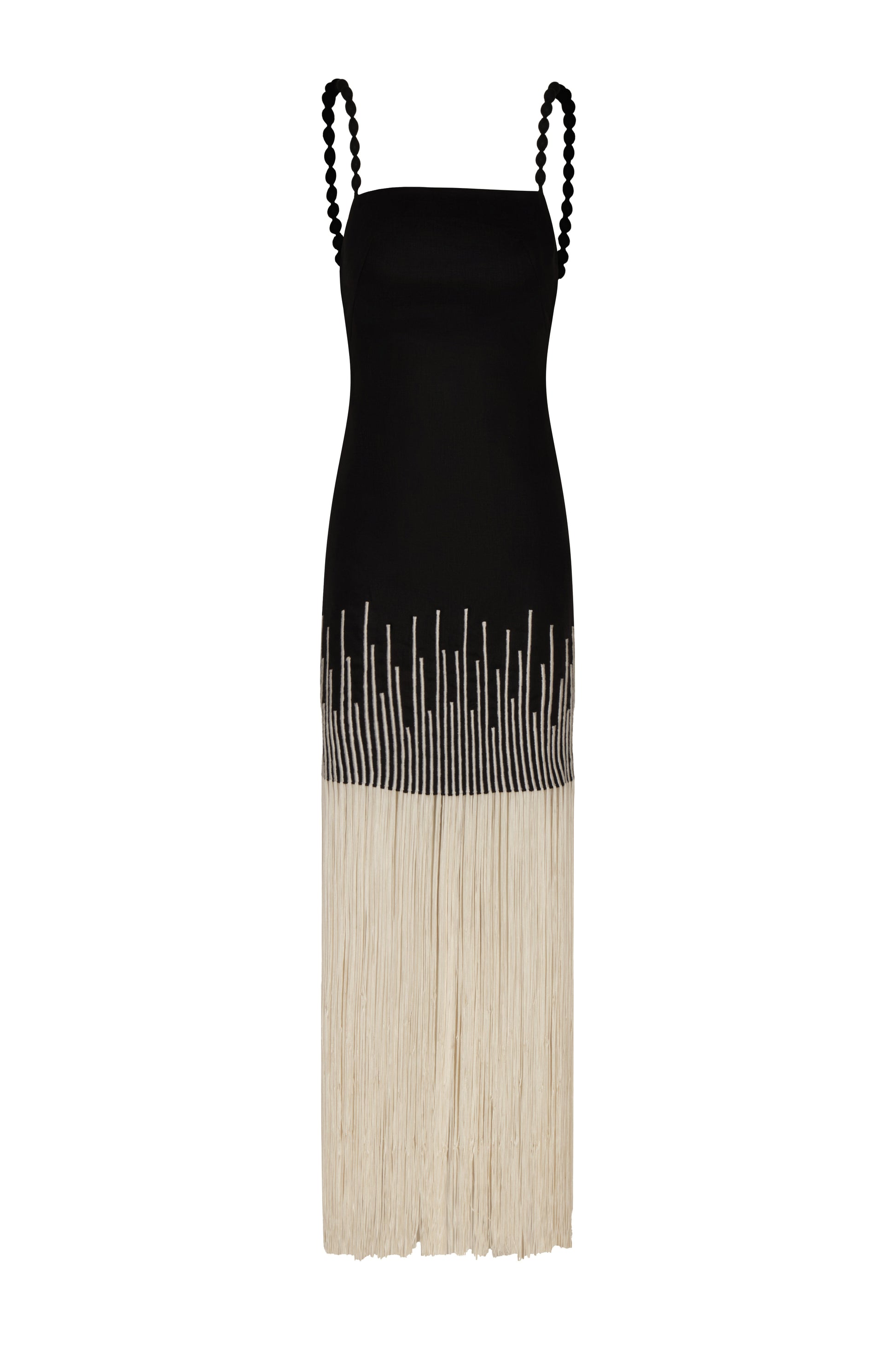 Silencios, a maxi dress that honors the essential with serene strength. Inspired by the language of the earth and crafted from linen, its embroidered fringes evoke movement and roots.