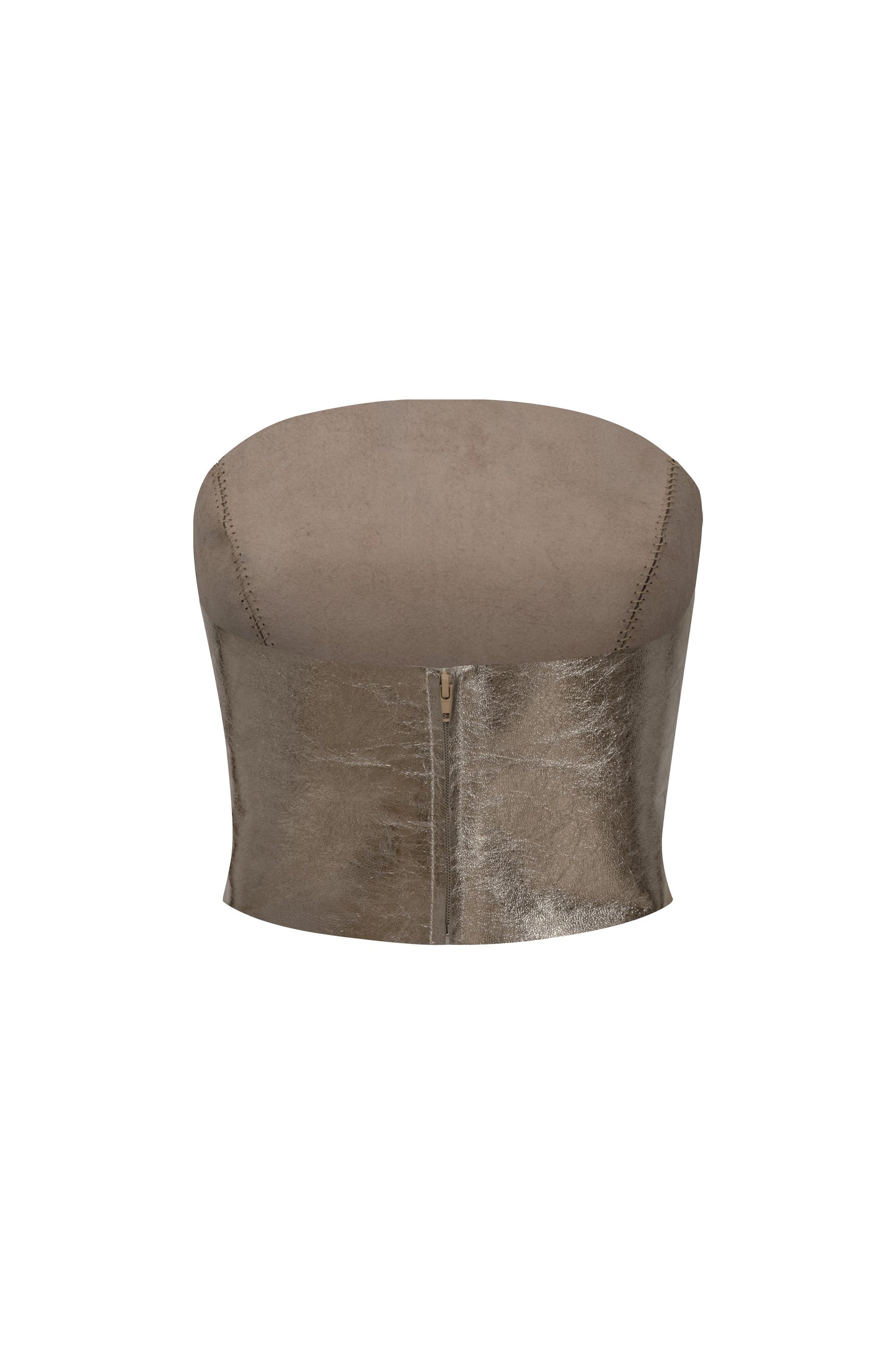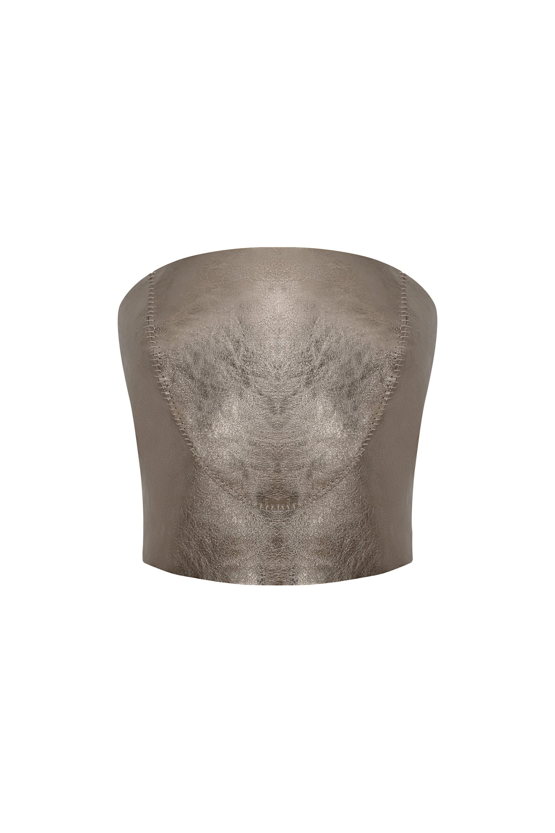 "Un Arco" is a golden corset crafted from leather. With defined lines and a delicate finish, it adds a touch of modern elegance to any look.