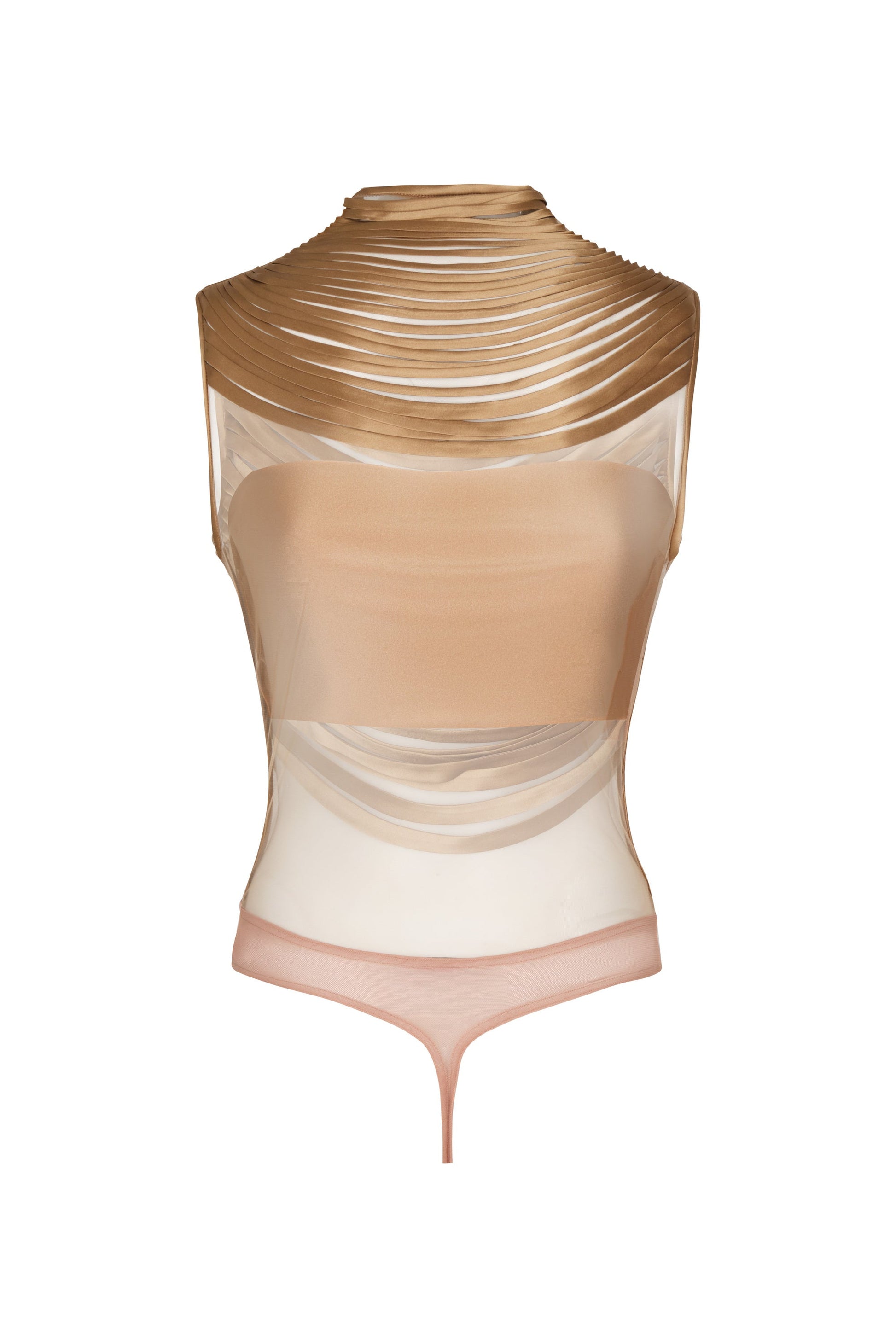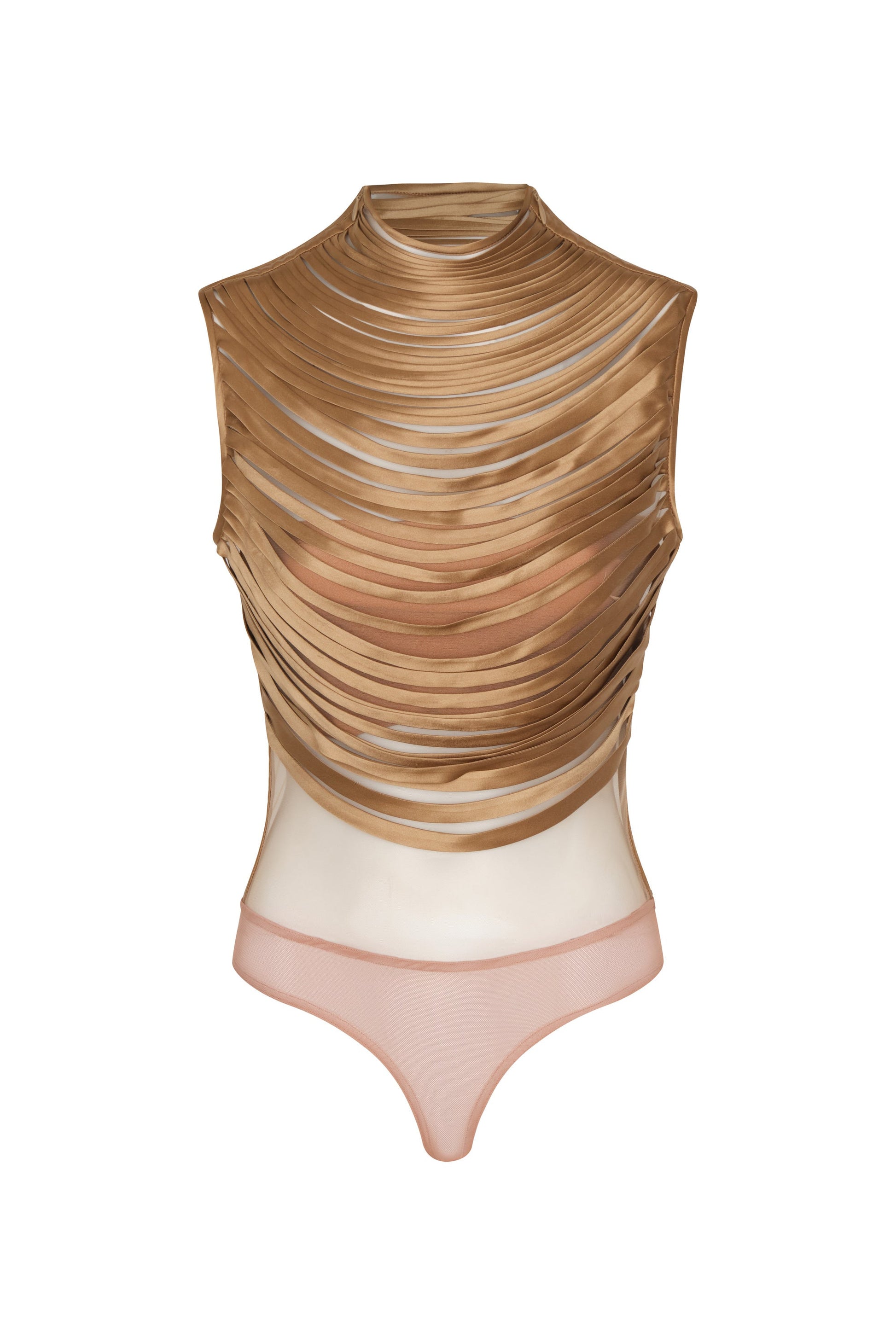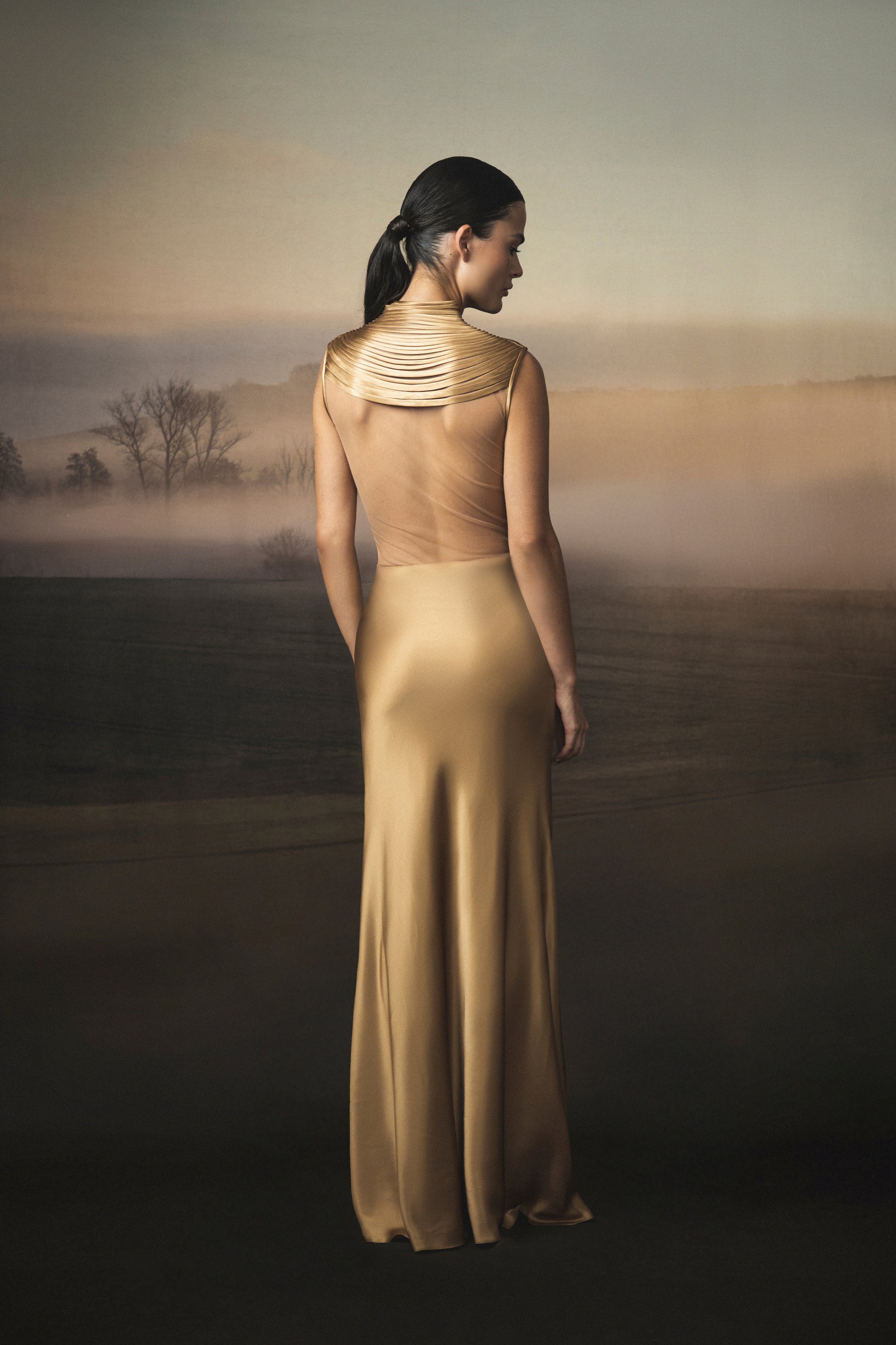 “Pulsos” is a gold-toned silk bodysuit with a distinctive design, its unique silhouette radiates sophistication and elegance.