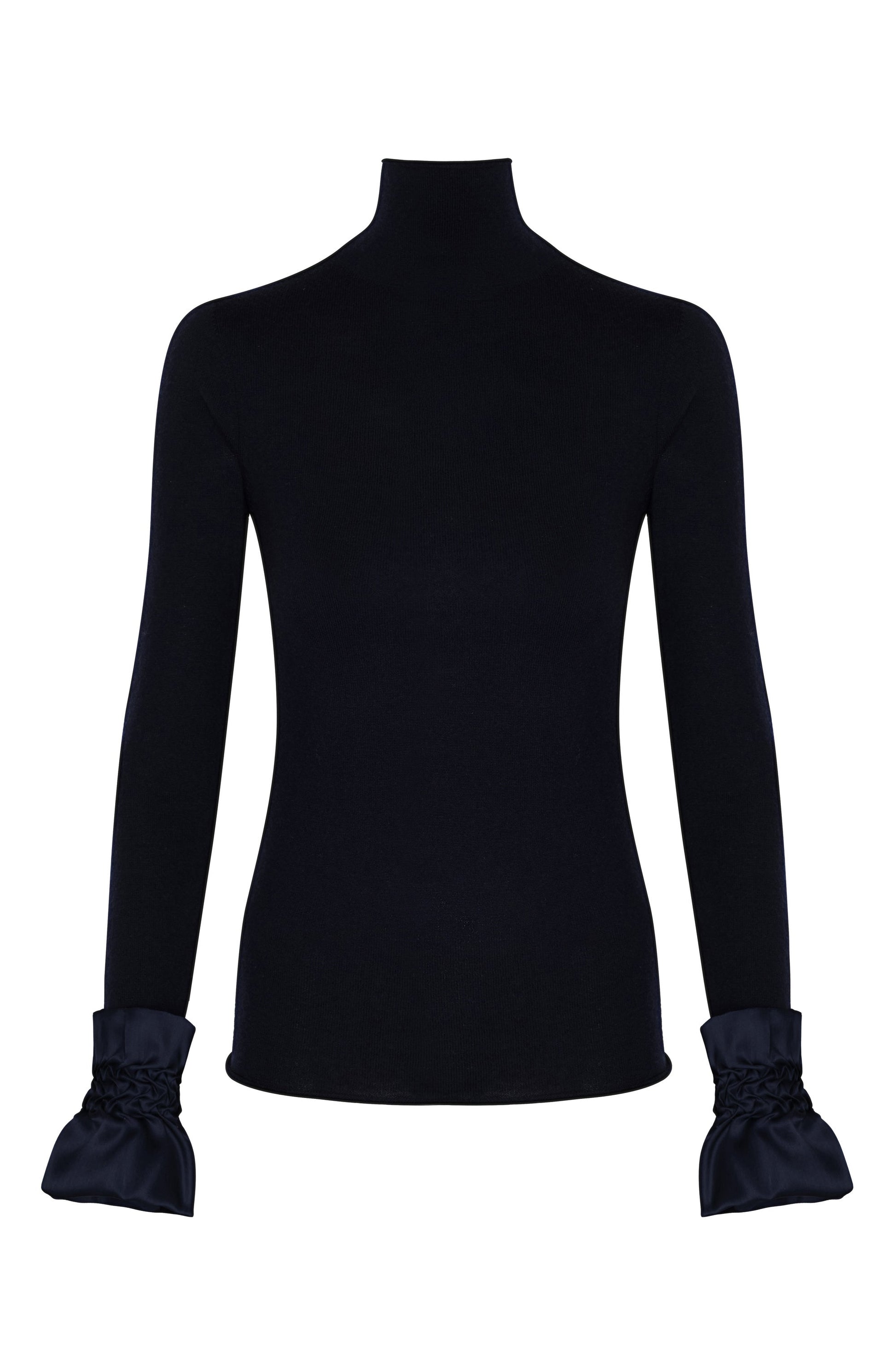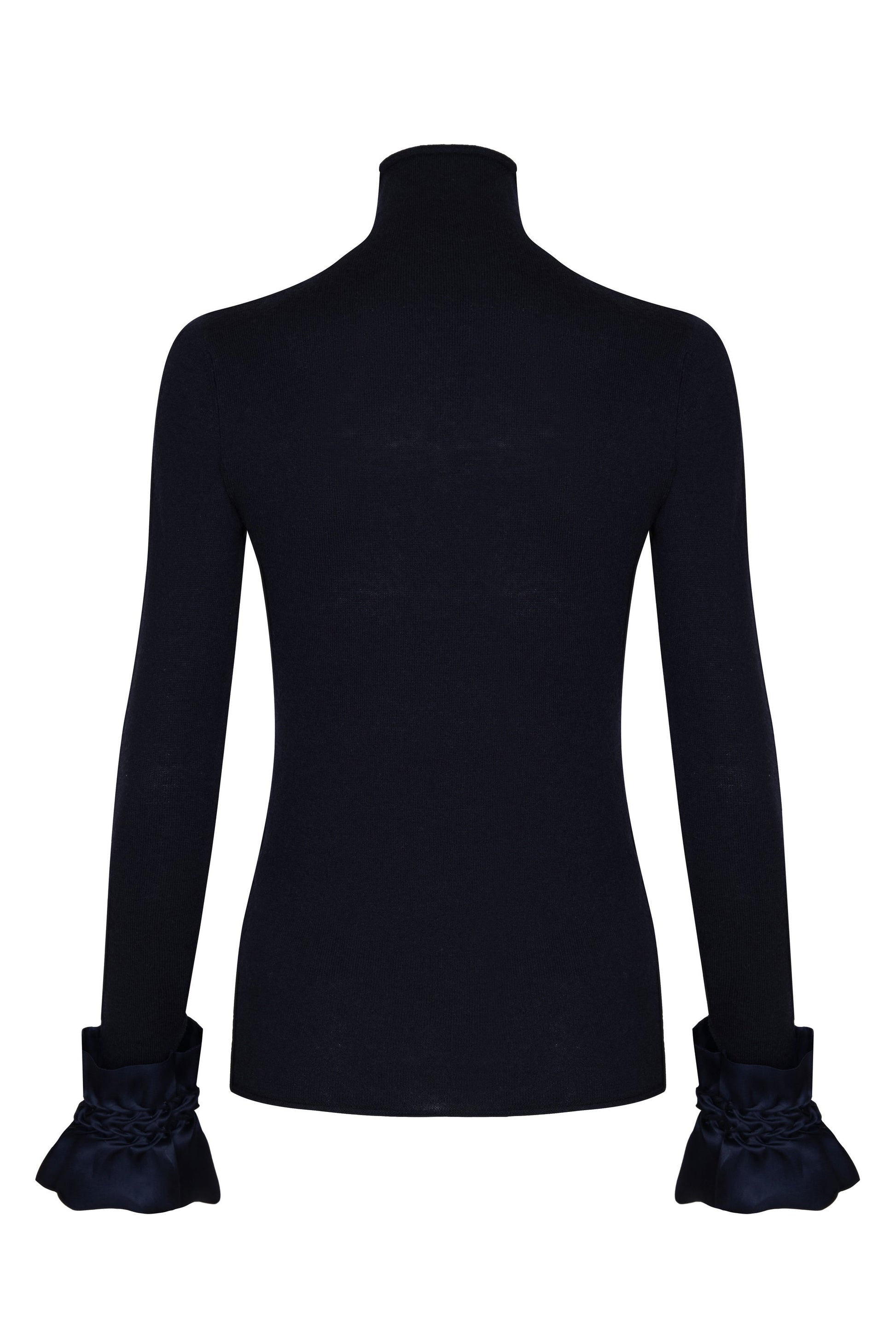 The Mia Mia sweater stands out for its refined silhouette and organza cuffs that elevate the design. An elegant navy staple, perfect for the season.
