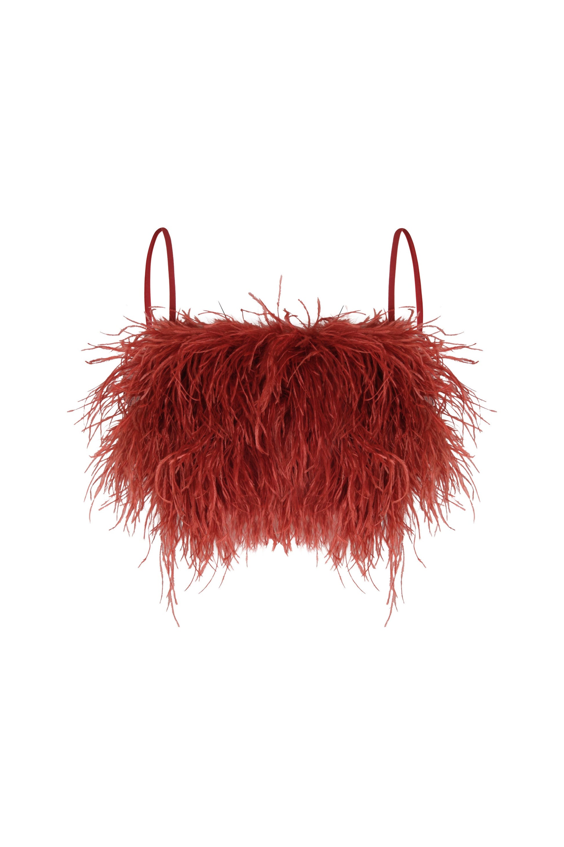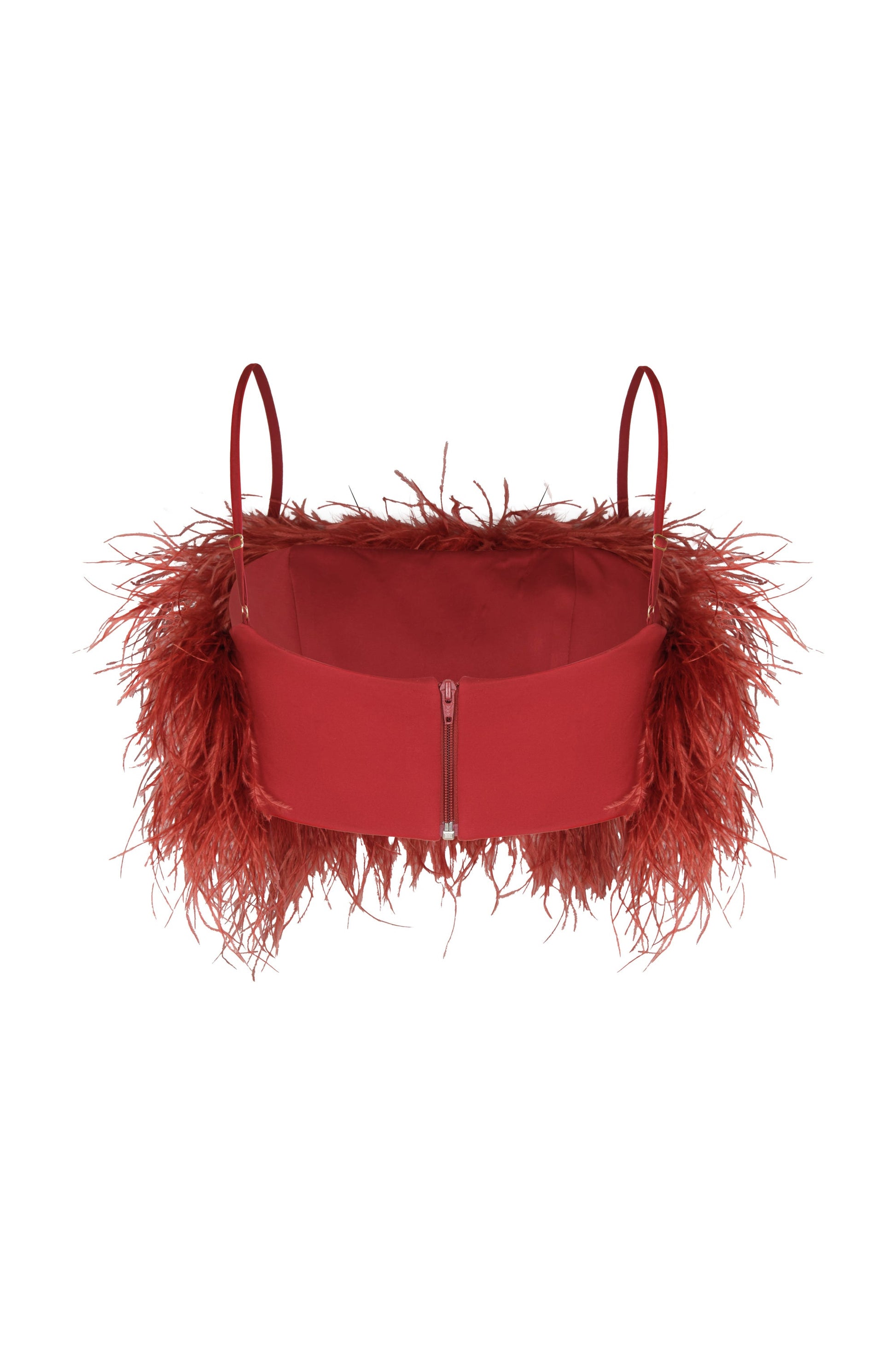 "Prisma Etereo" is a cotton crop top with feathers, designed to stand out. Its wine-colored hue and textured finish provide a sophisticated and unique look, ideal for special occasions.
