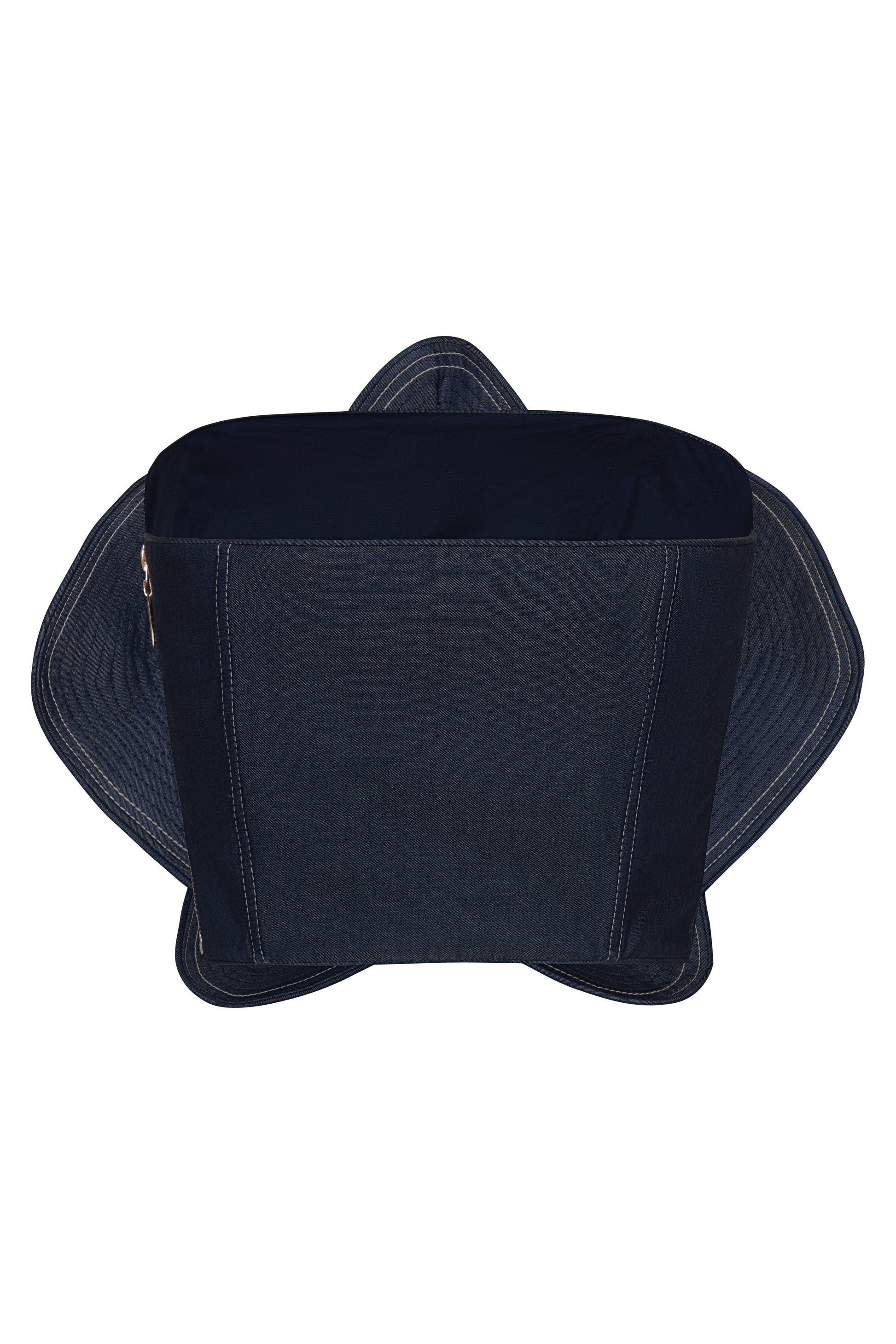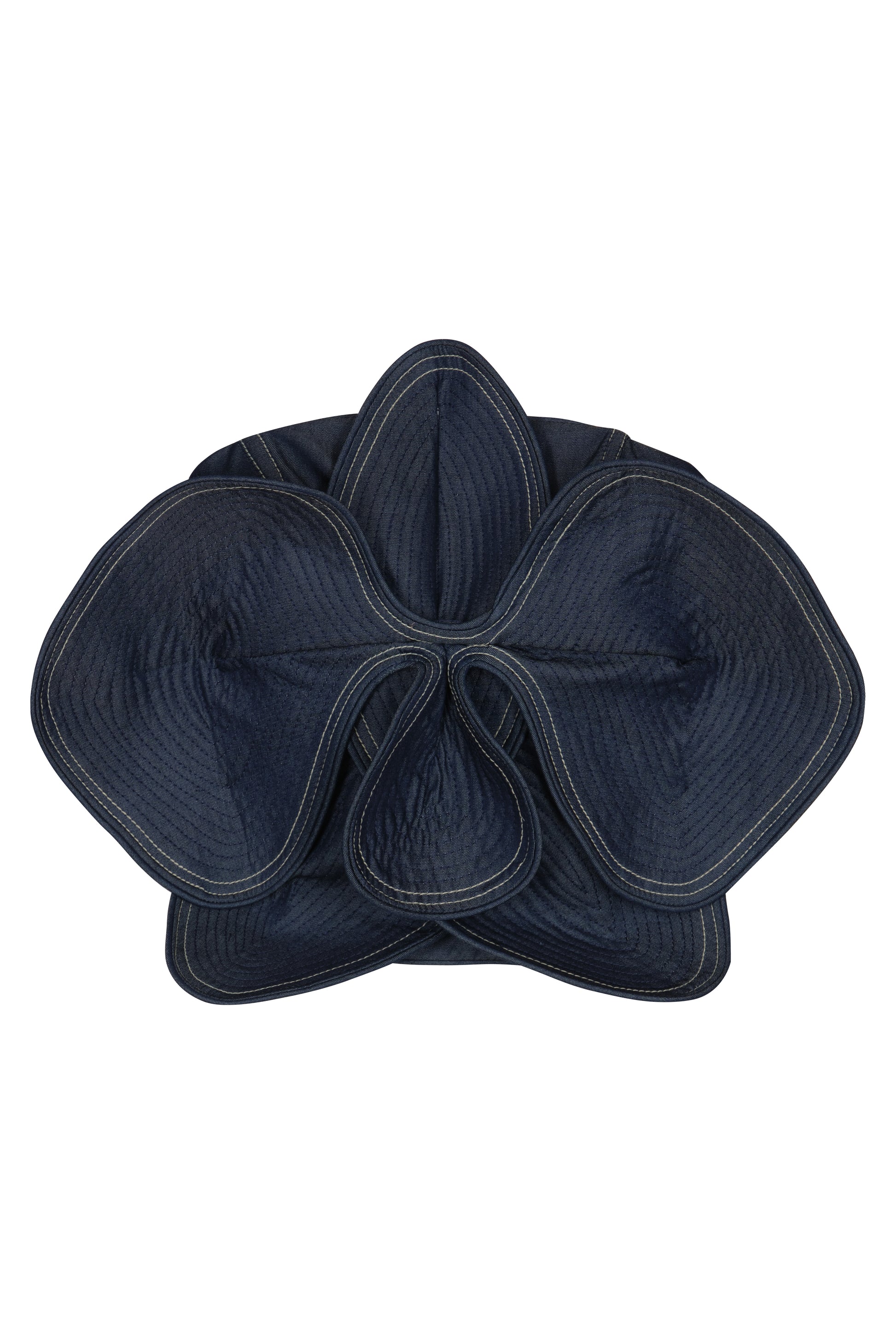 La Aldea is an iconic floral-shaped top in denim, featuring contrasting topstitching that highlights its sculptural design — a statement piece for a chic, modern look with an artistic edge.