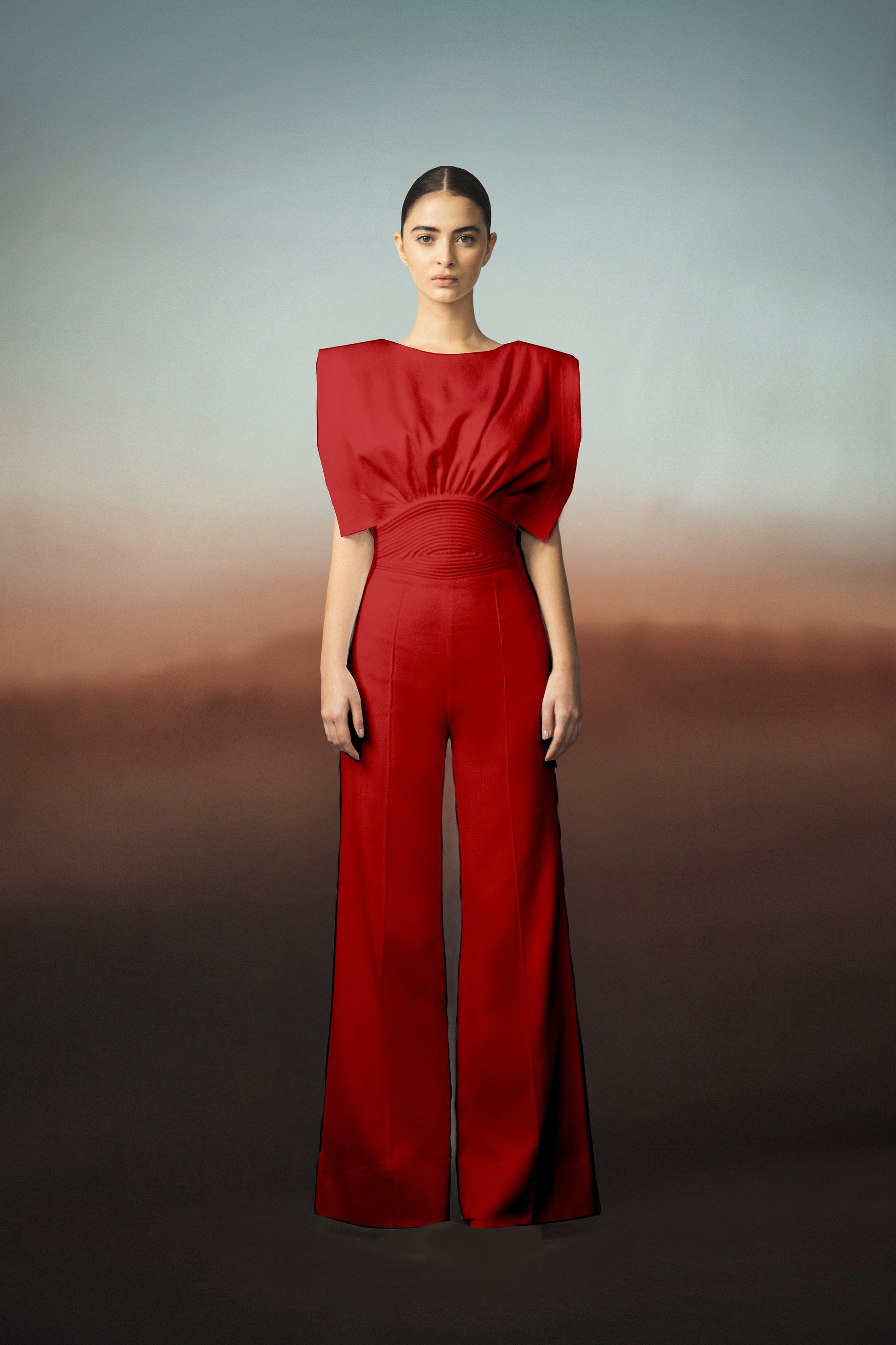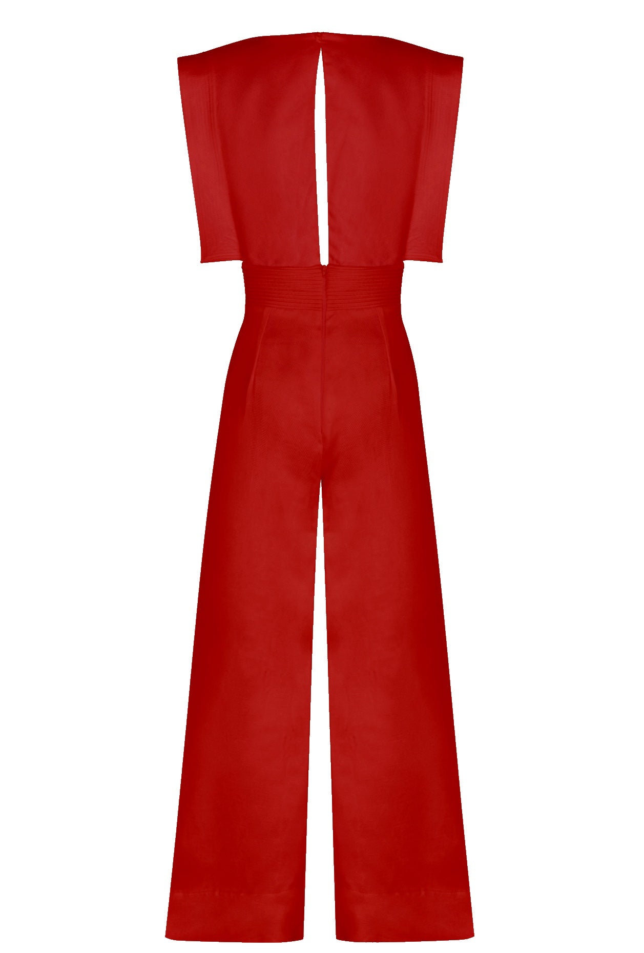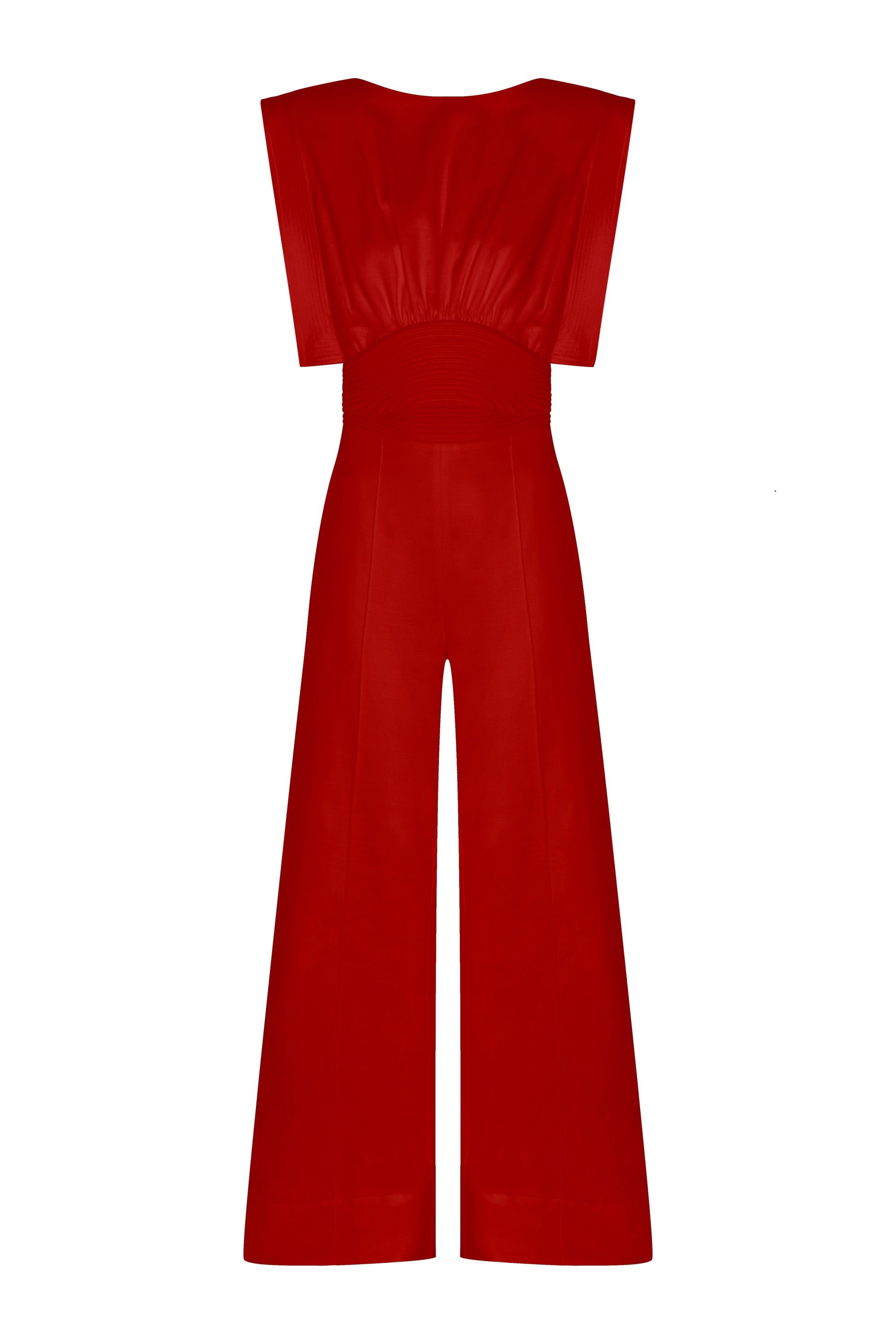 "Lienzo Abierto" is a Red jumpsuit made from twill cotton. Its relaxed, striking silhouette highlights the vibrant color.