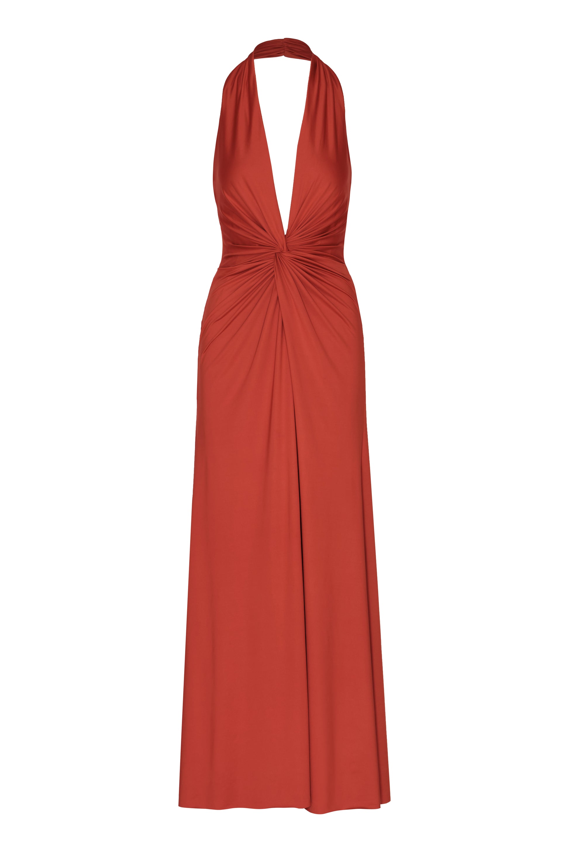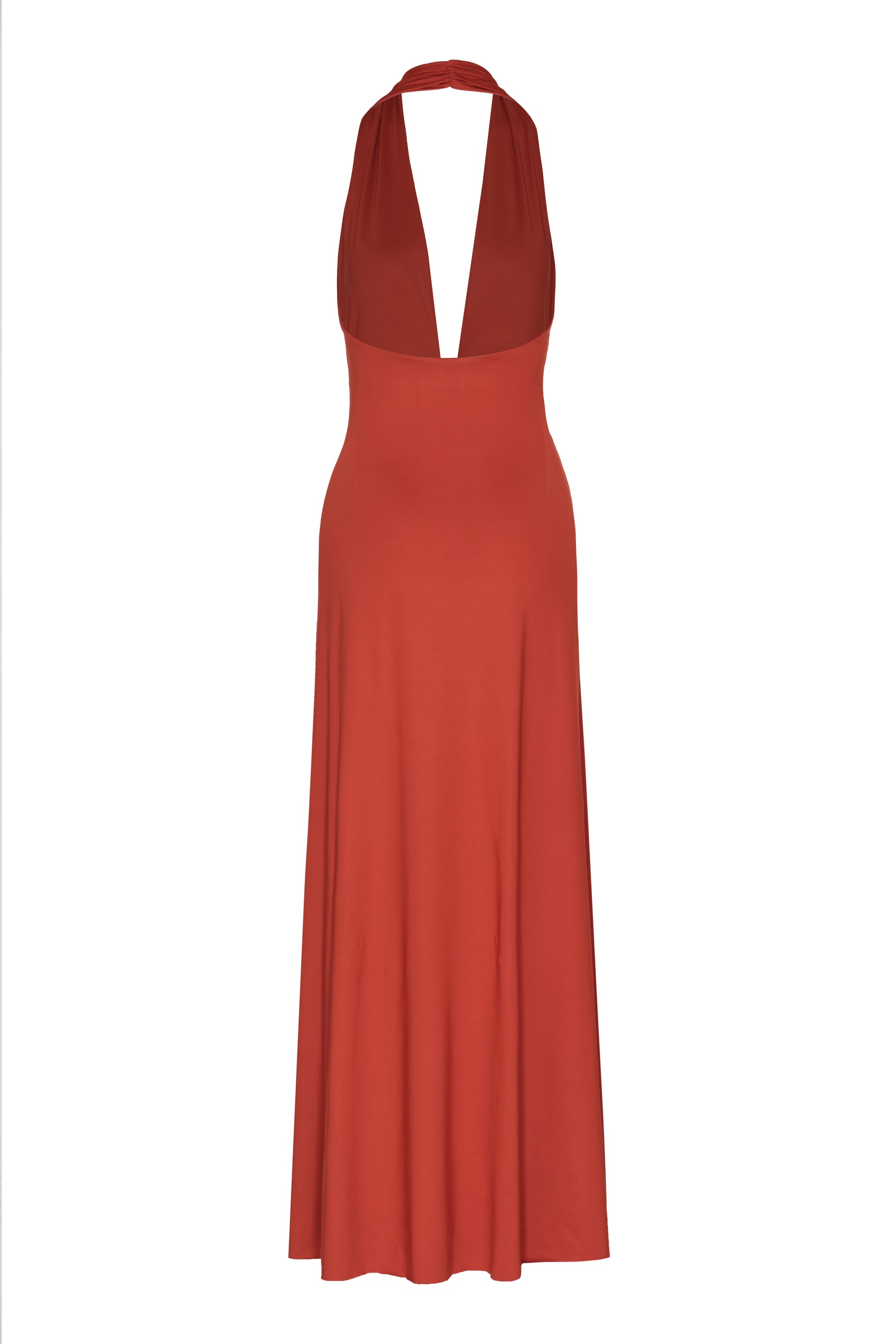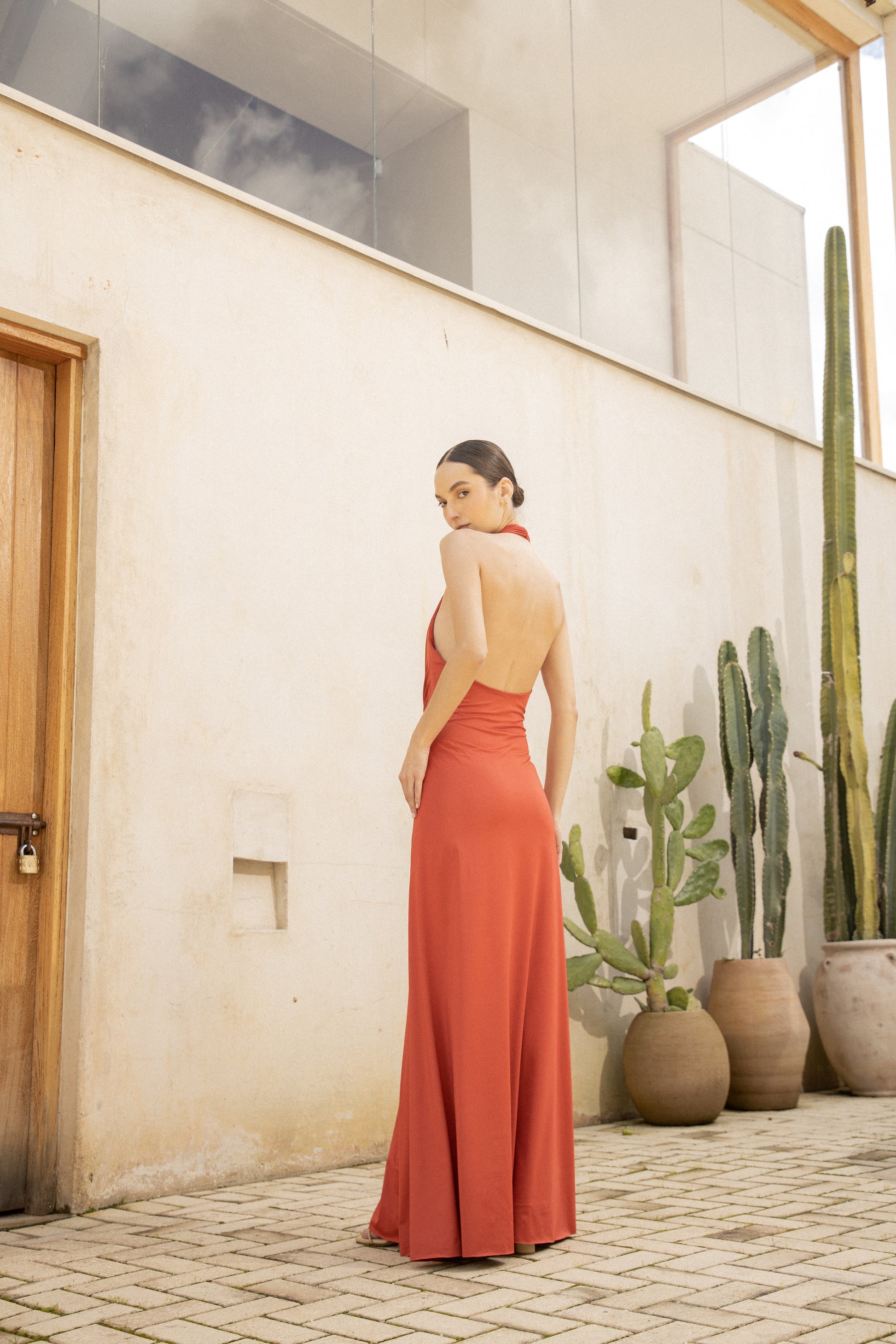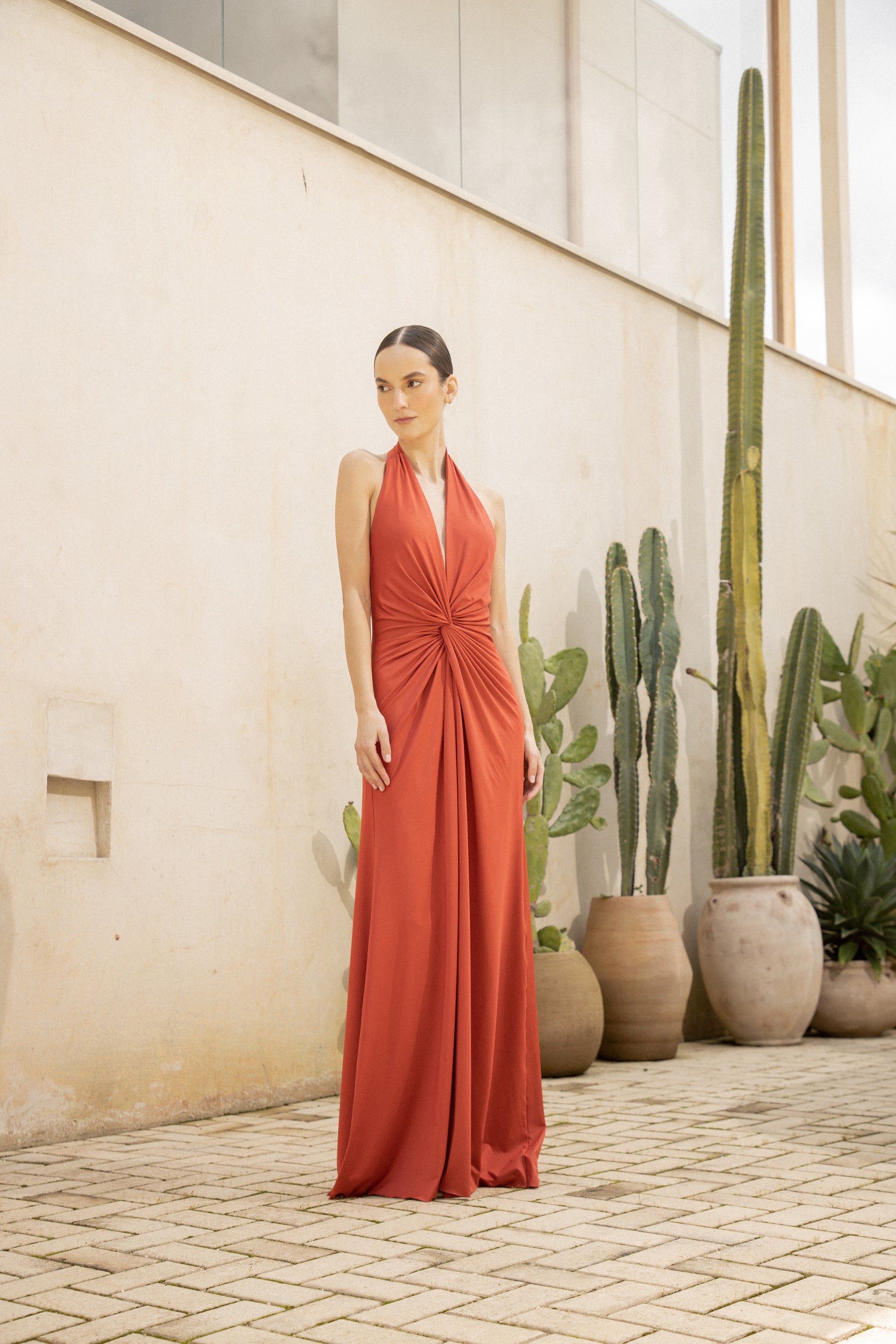 Mendra, a terracotta-toned maxi dress that stands out for its elegance and streamlined silhouette. A sophisticated piece, ideal for radiating character and modernity with ease.