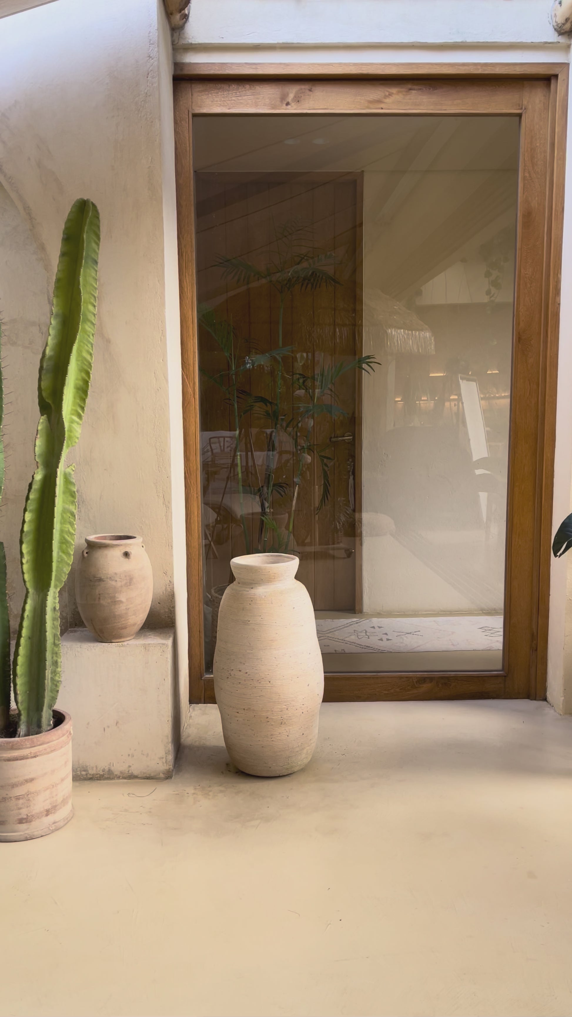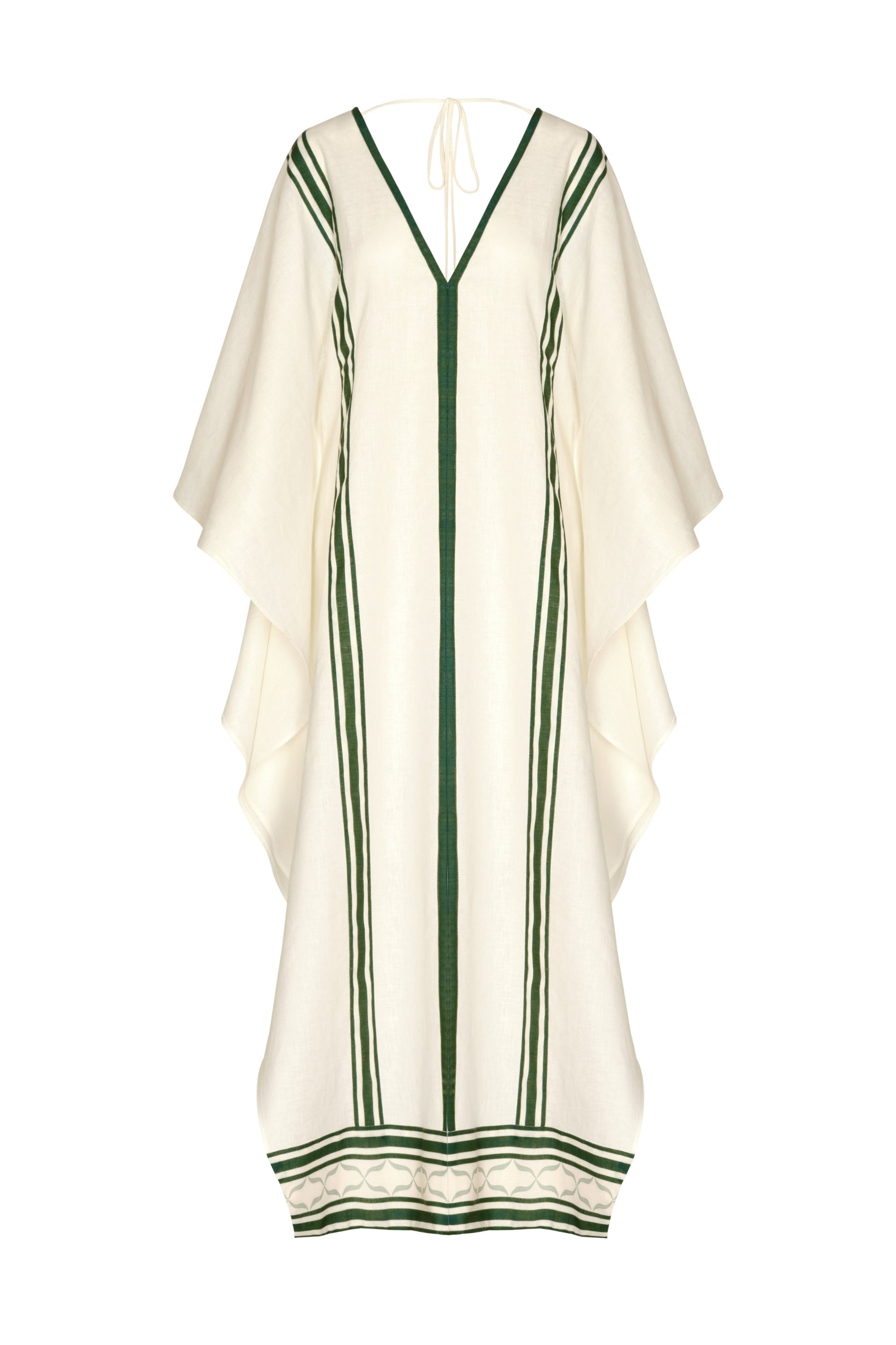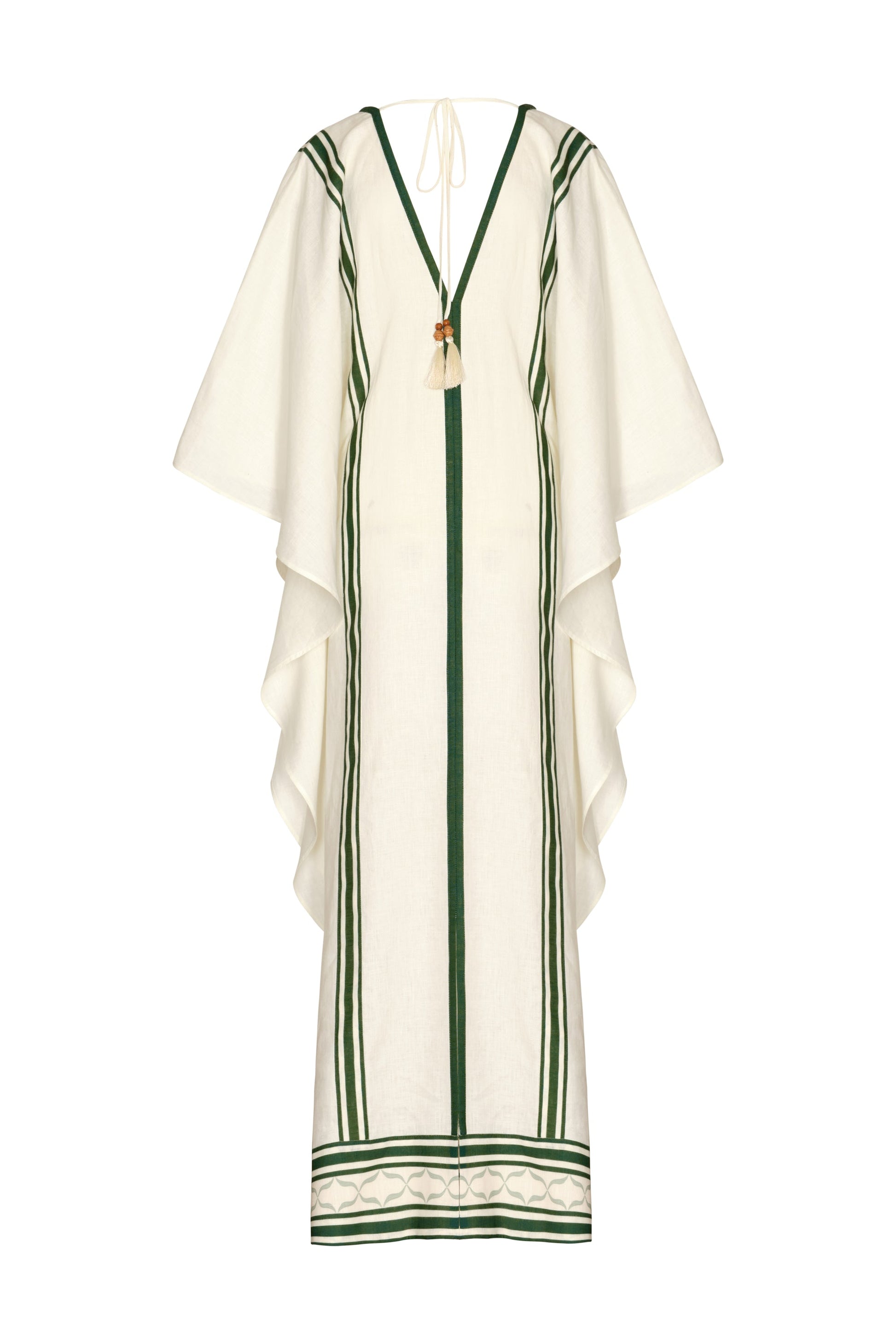 "Poetica Natural" is an ivory-toned linen caftan with green accents. Light, fresh, and elegant, it's ideal for a relaxed look with a touch of sophistication.