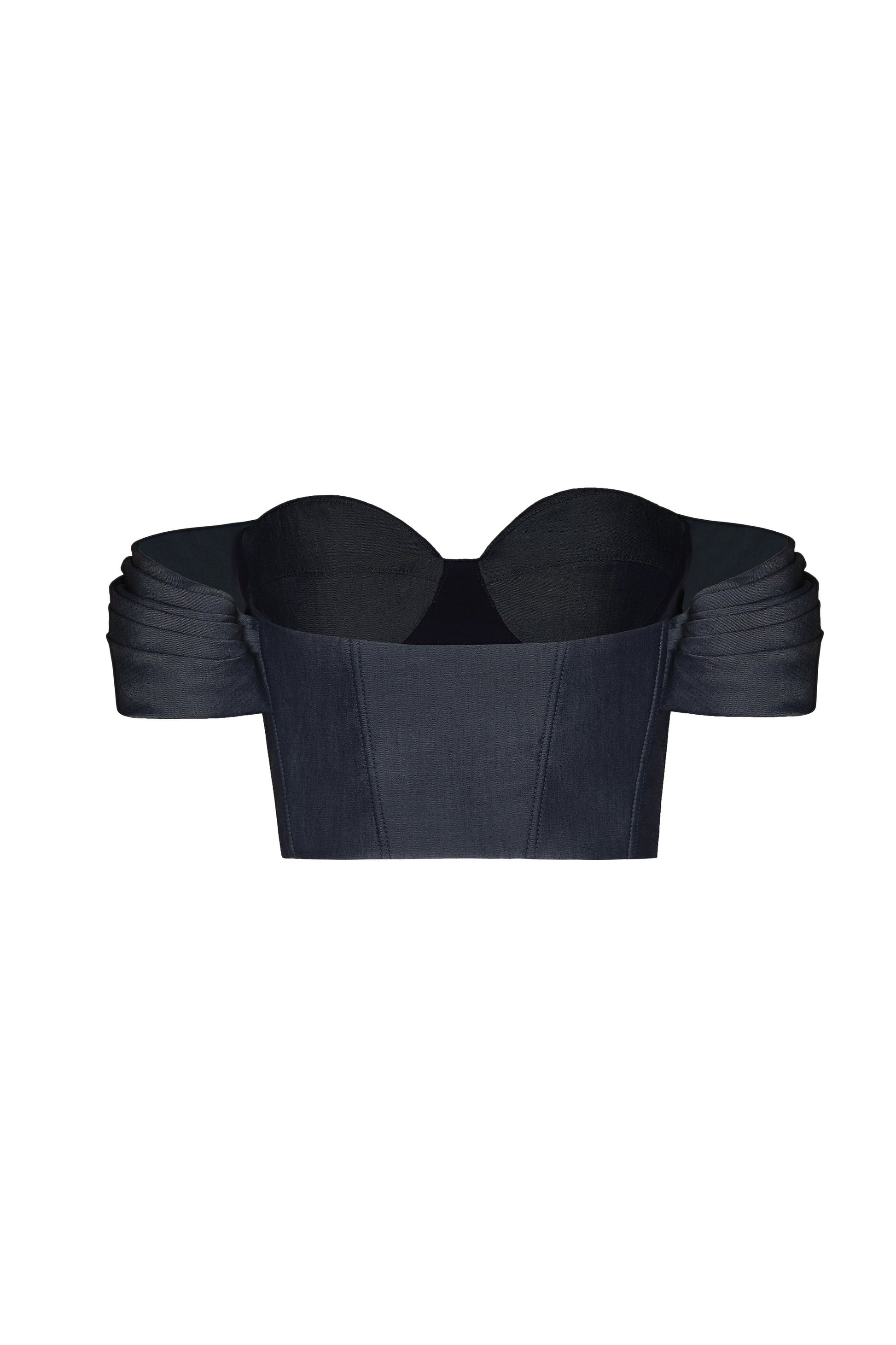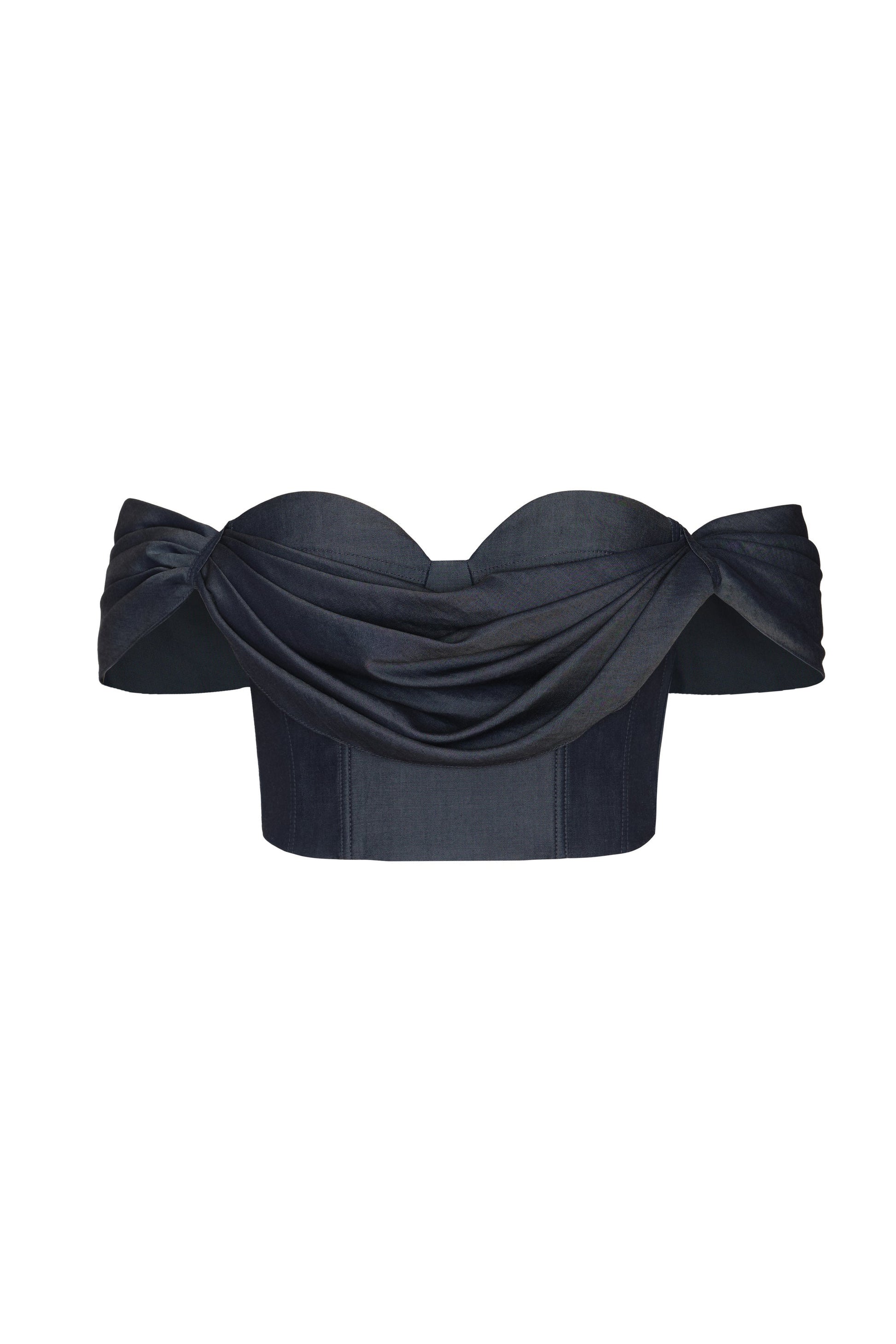 Crop top crafted from 100% Tencel denim in a dark shade, inspired by the strength and organic texture of nature. A fresh silhouette with a contemporary attitude.