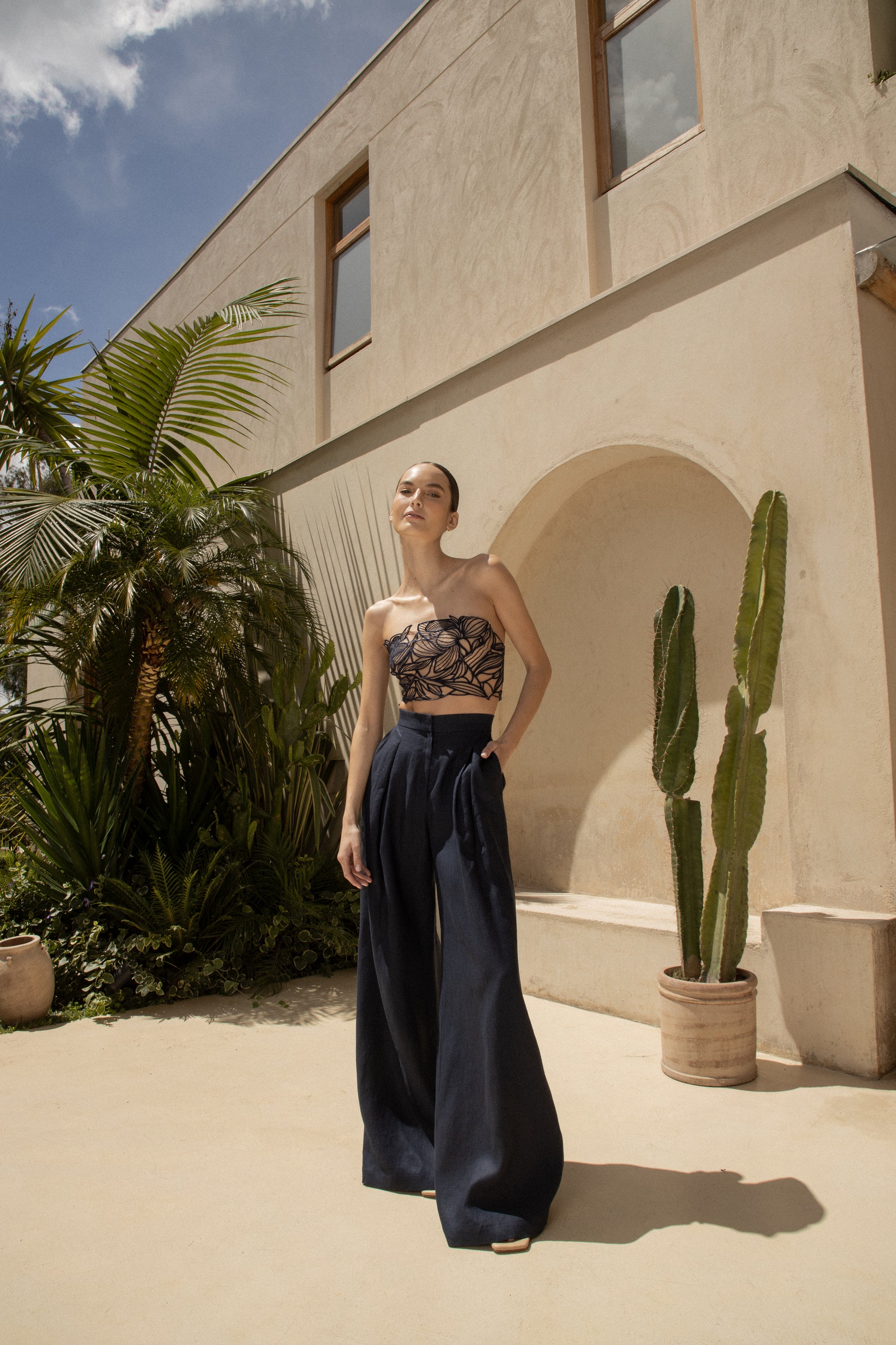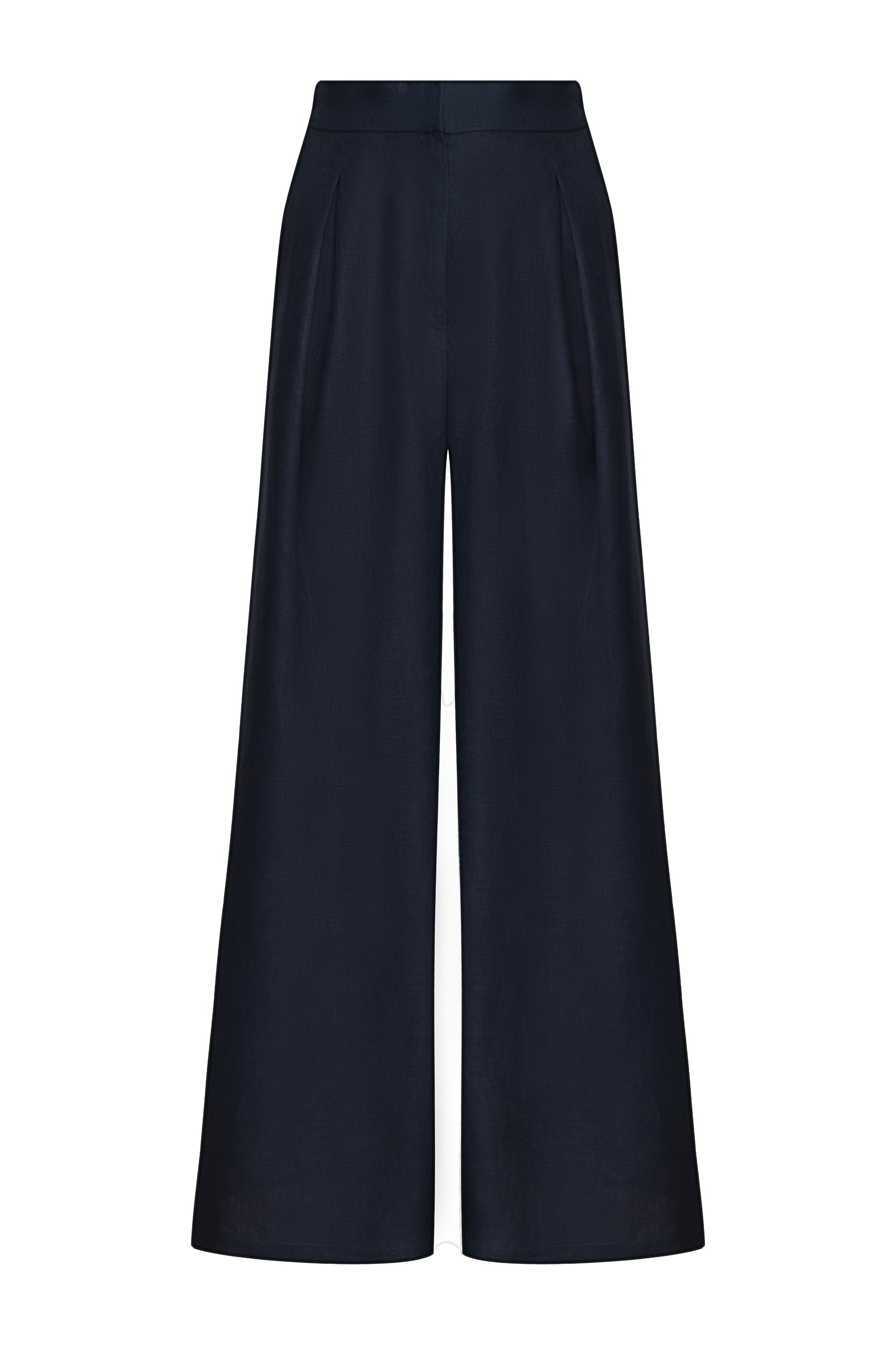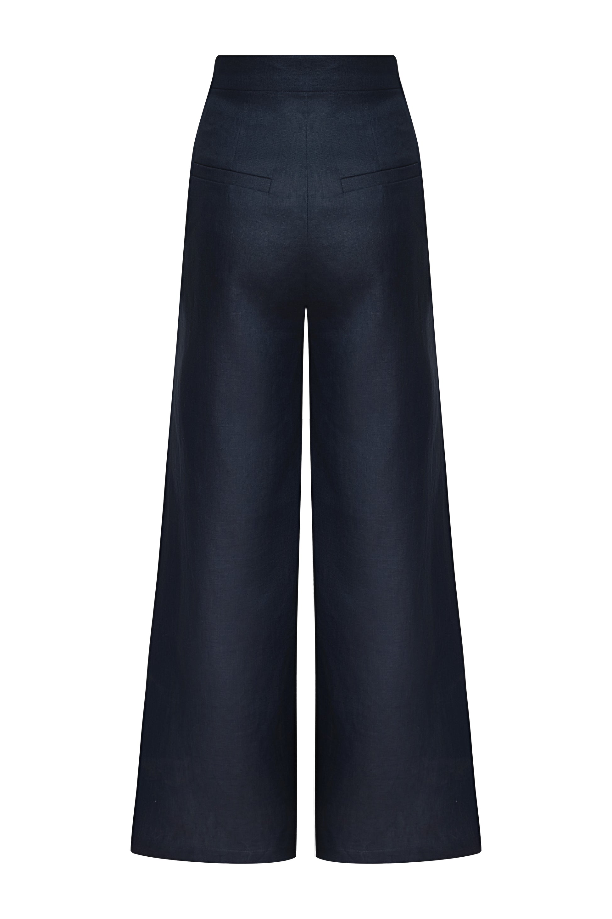 "Una metafora" Navy pants in 100% linen with a loose, flowing silhouette. Minimalist and powerful, designed for graceful movement, they are inspired by the natural purity of a serene garden, ideal for transitioning from day to night with grace.