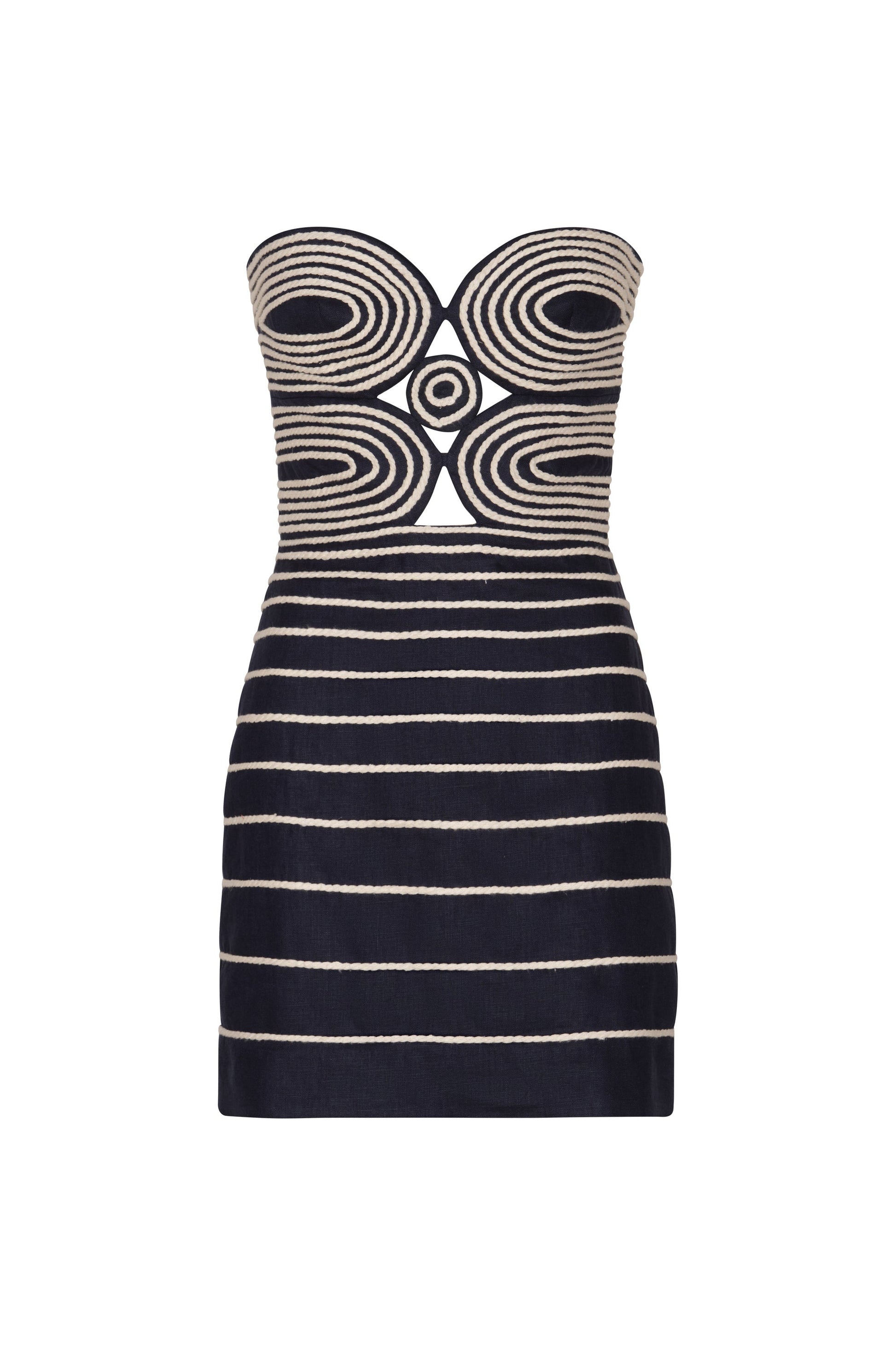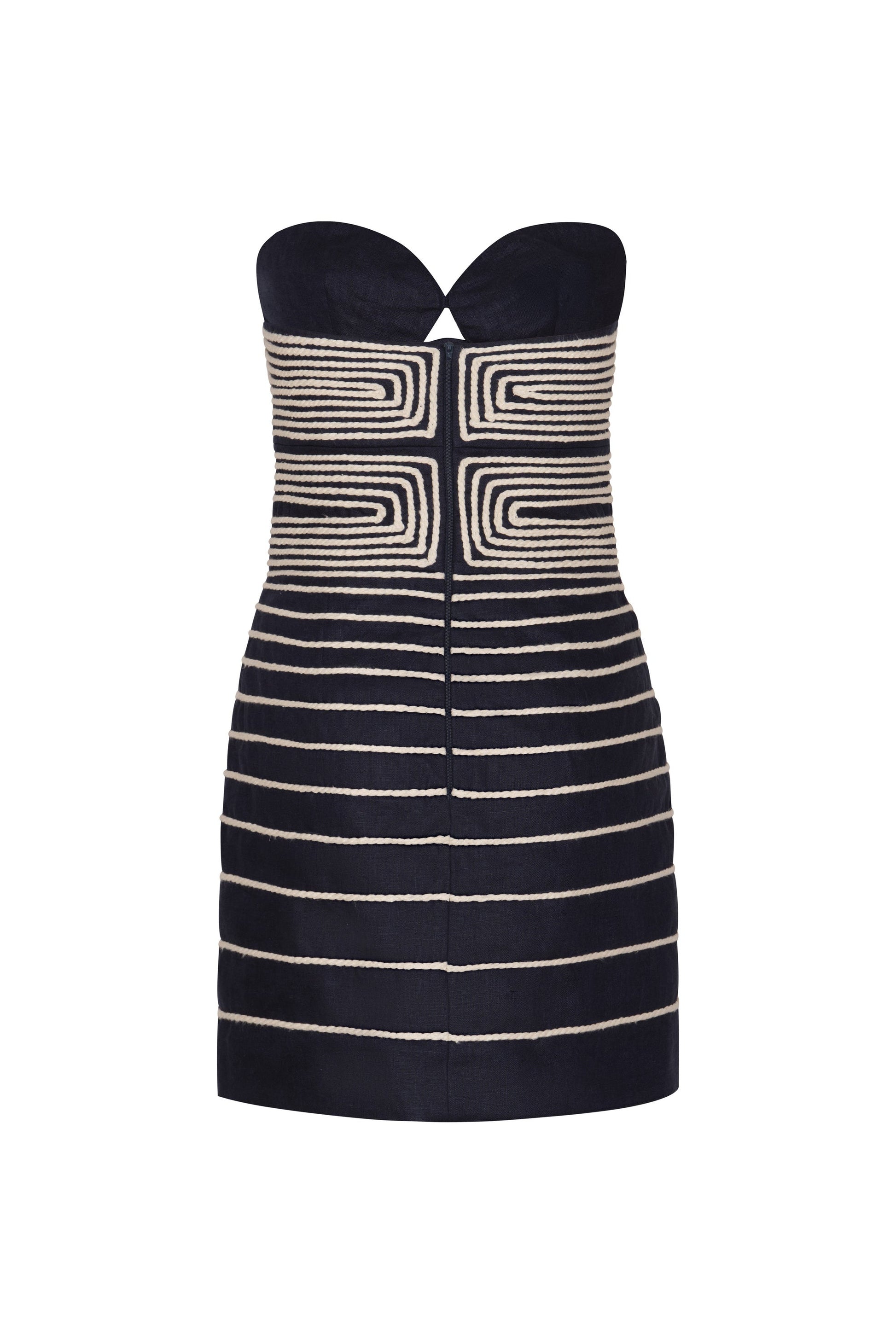 Navy blue embroidered mini dress, crafted from 100% linen, with removable straps for versatility. Its ethereal design and handcrafted details evoke the delicacy of a tranquil garden, perfect for moments filled with grace and sophistication.