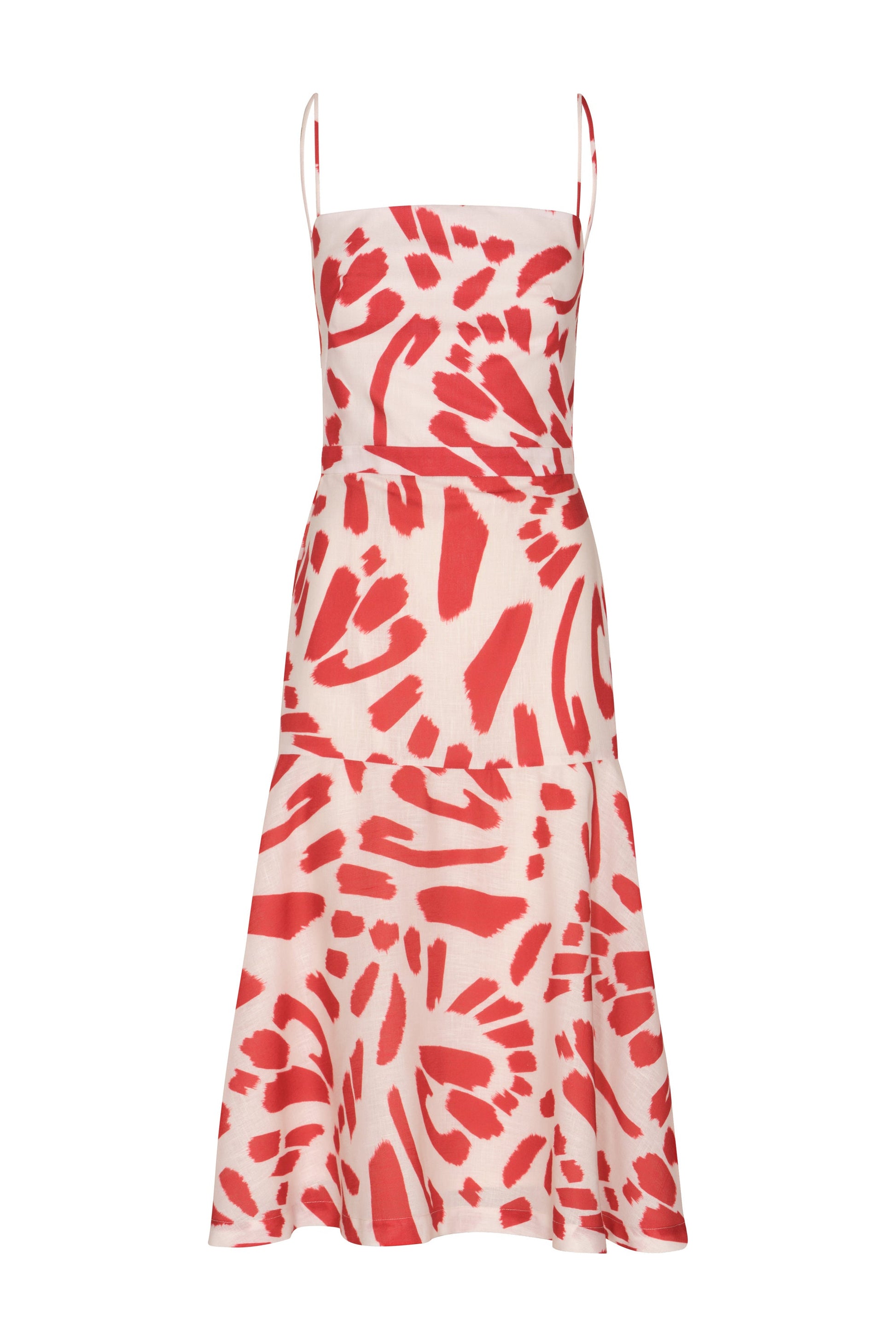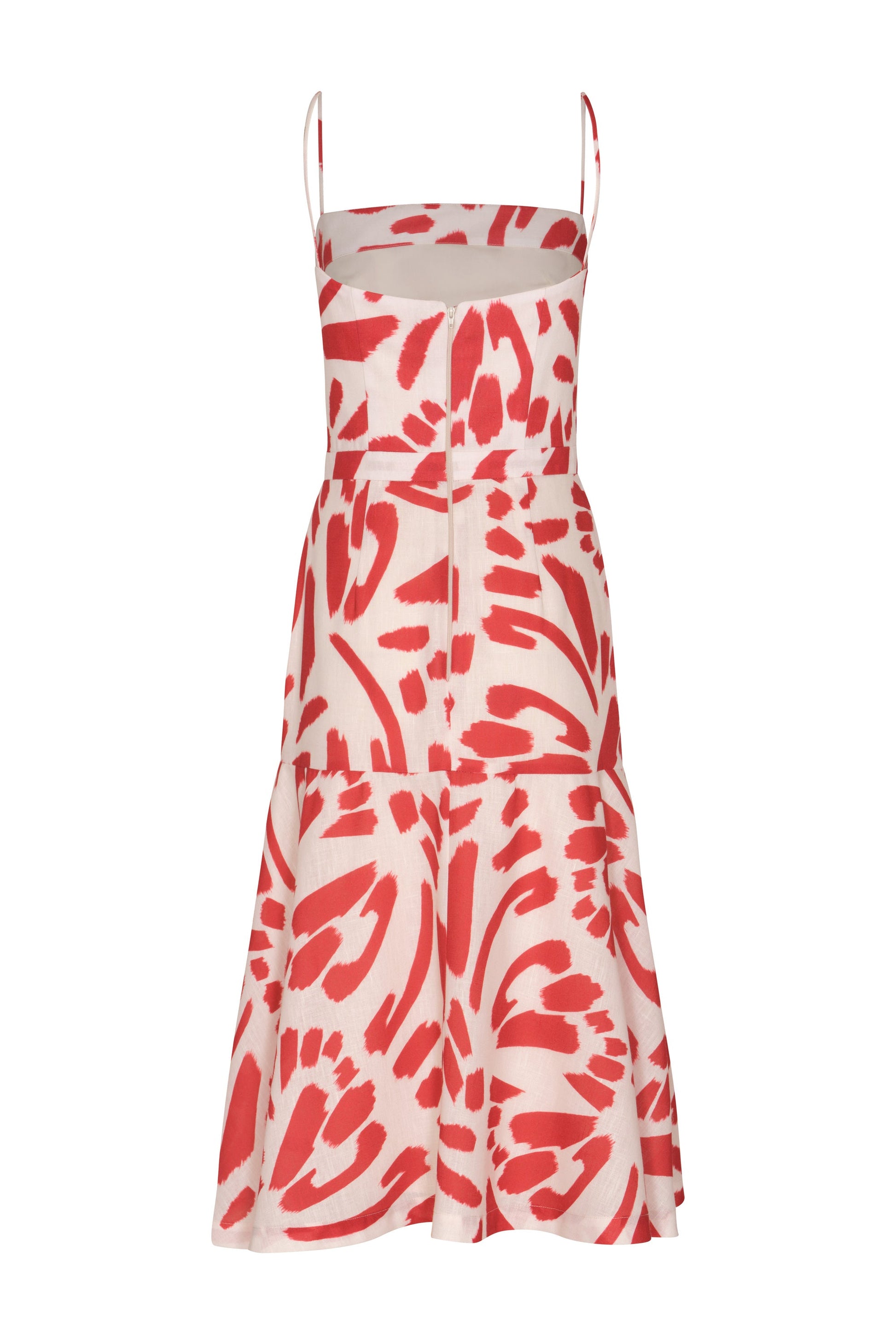 "Susurros" a midi dress crafted from linen, is a distinctive design with its scarlet papillon print. It reflects sophistication with a relaxed touch.