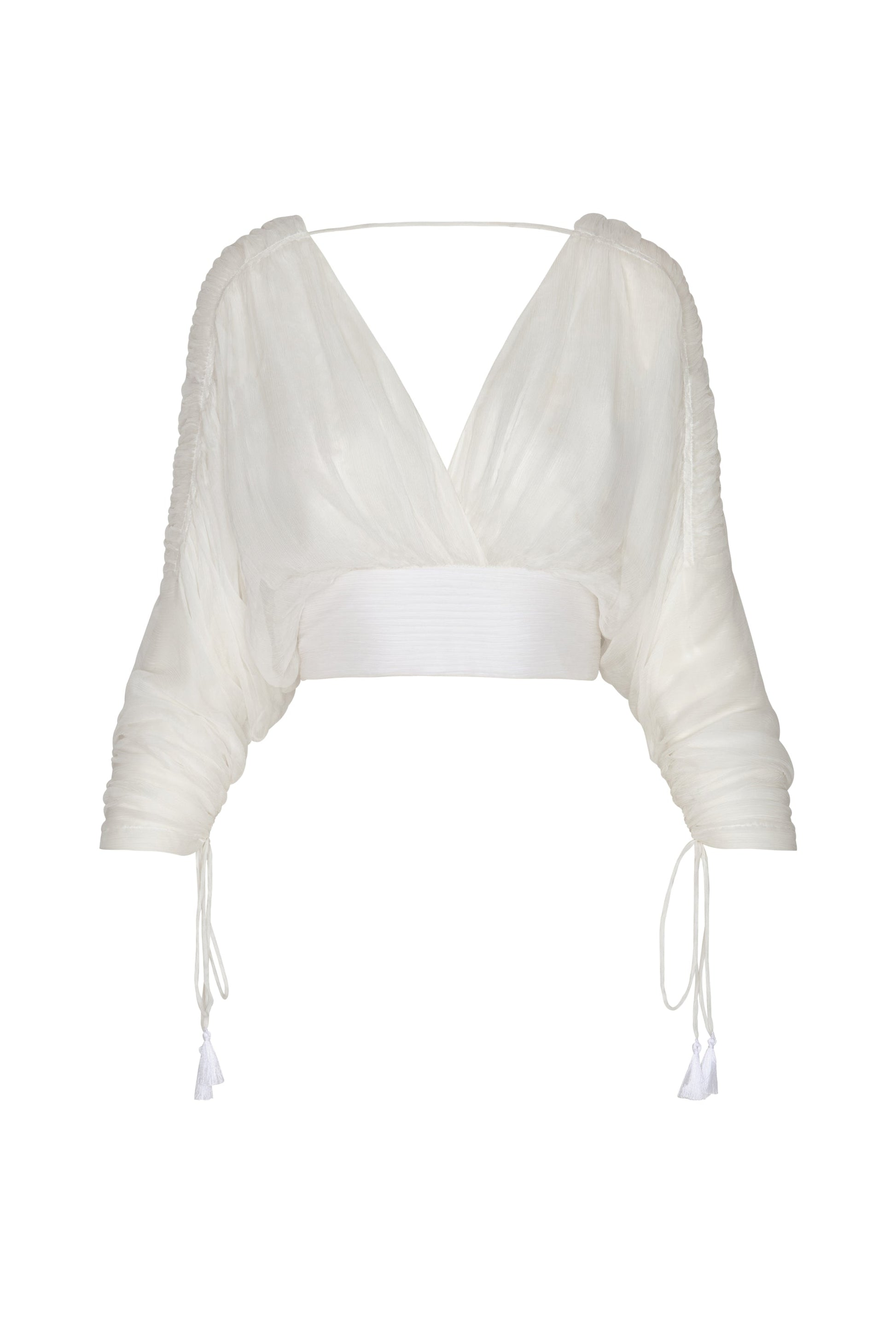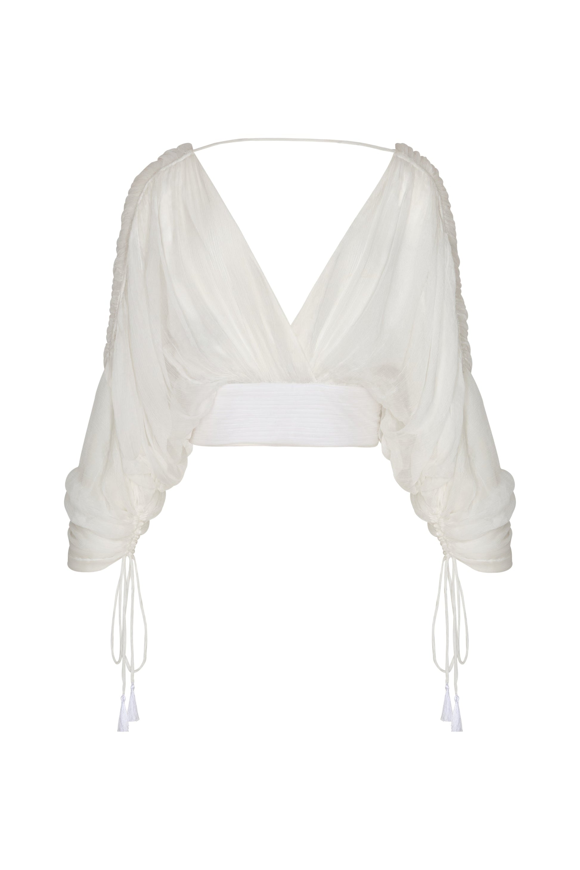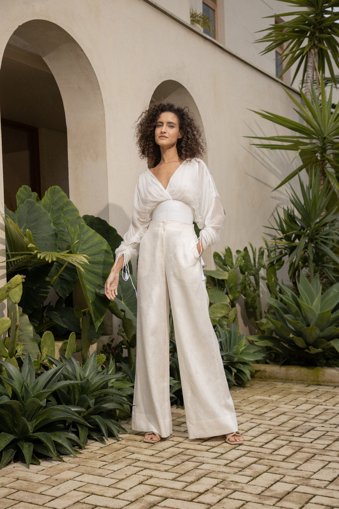 Blouse in off-white tone, crafted from delicate silk chiffon. An ethereal design that evokes the lightness of a flower in the breeze, ideal for a feminine and sophisticated look.