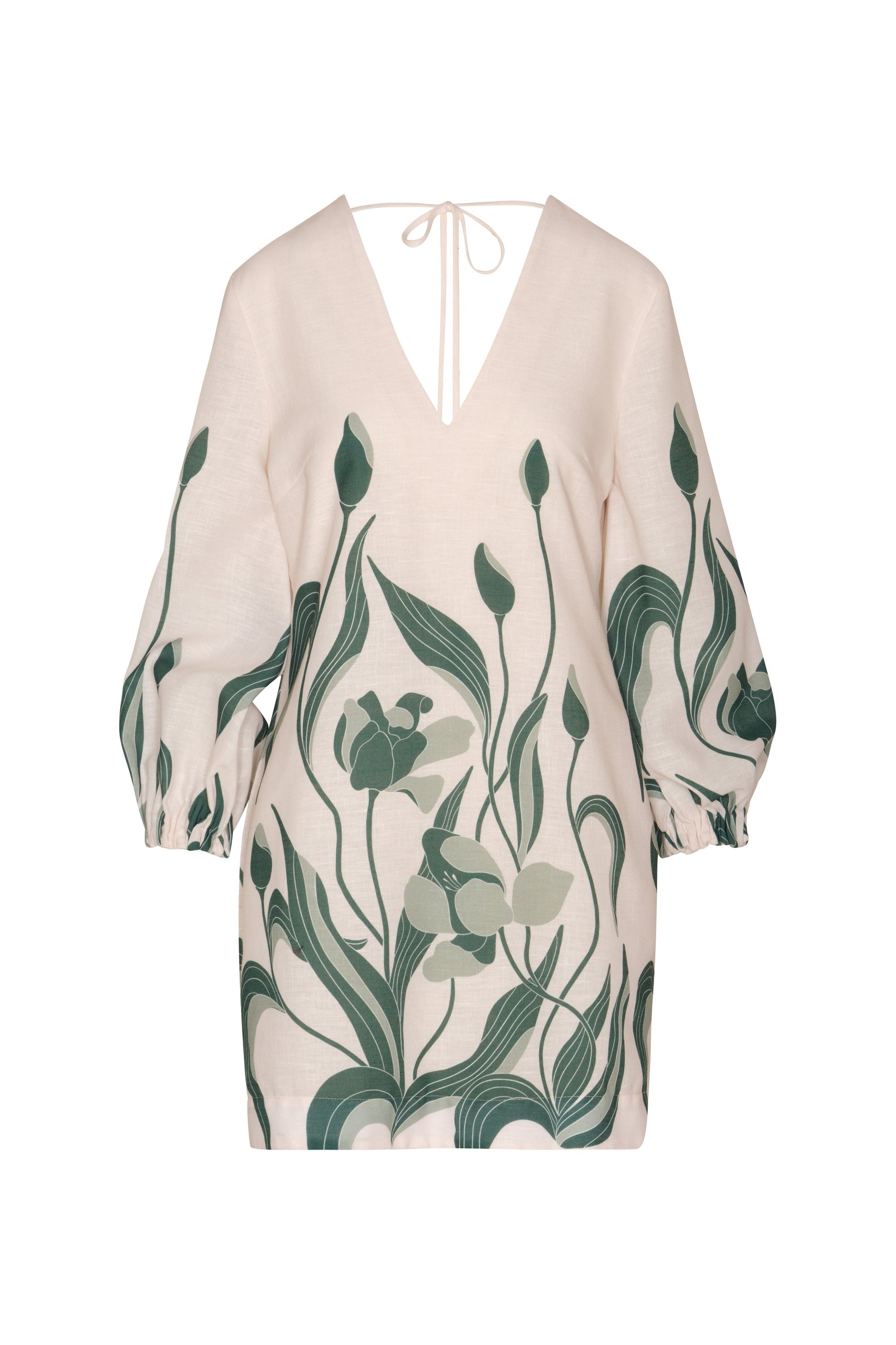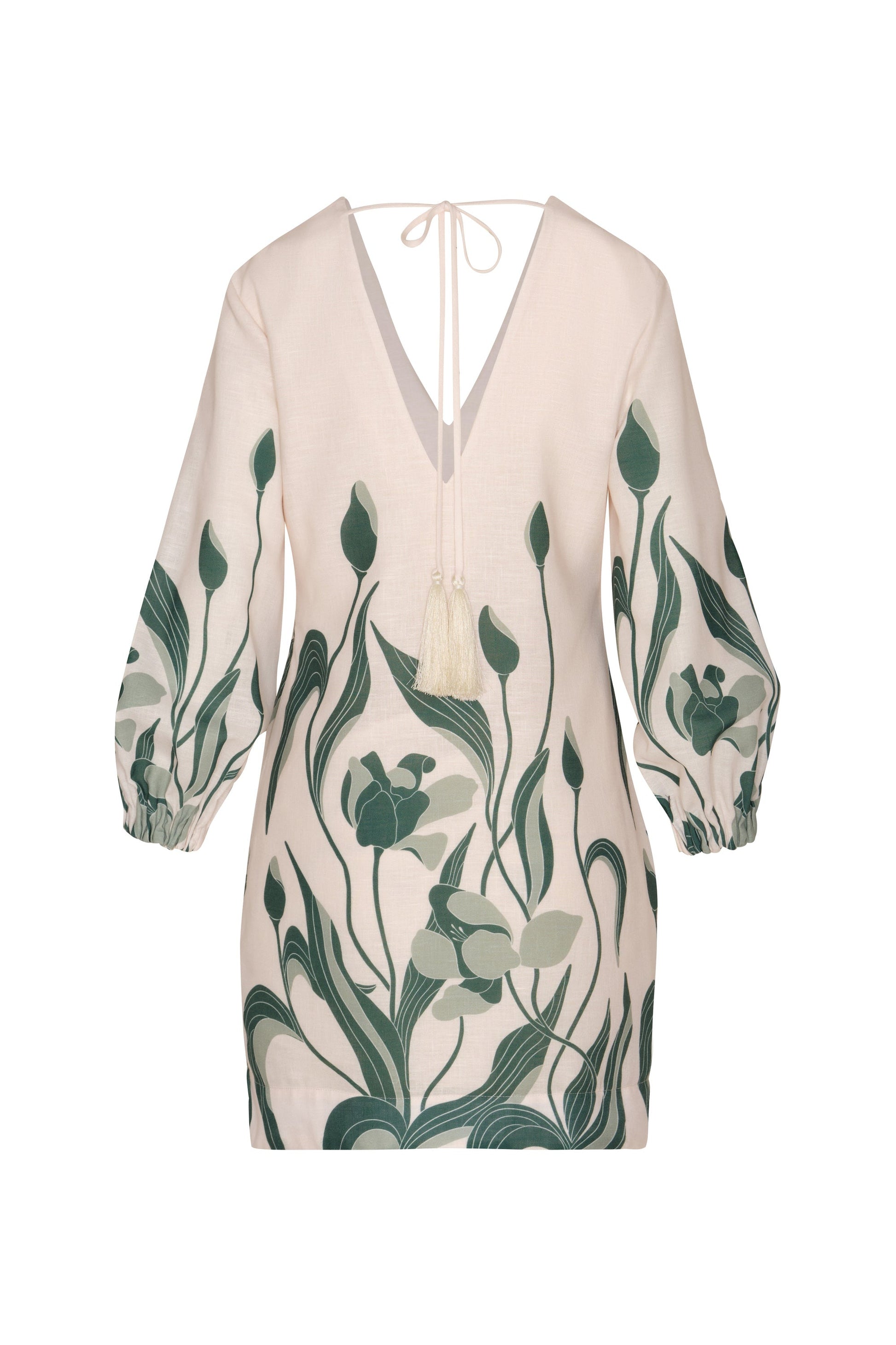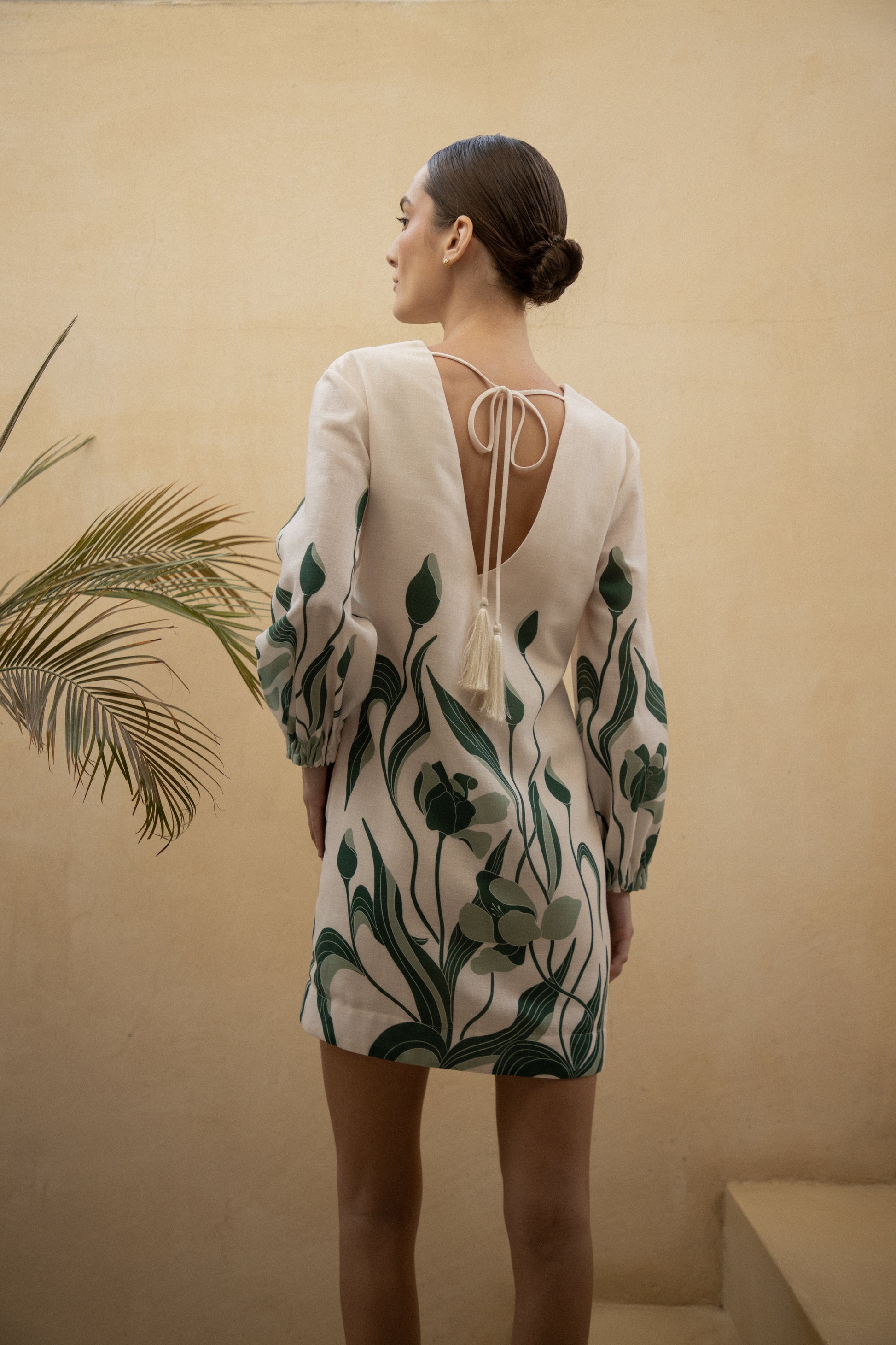Mini dress in 100% linen, featuring a delicate green tulip print on an ivory base. Its soft, feminine silhouette evokes the freshness of a garden at dawn, where every detail blooms with grace and poetry.
