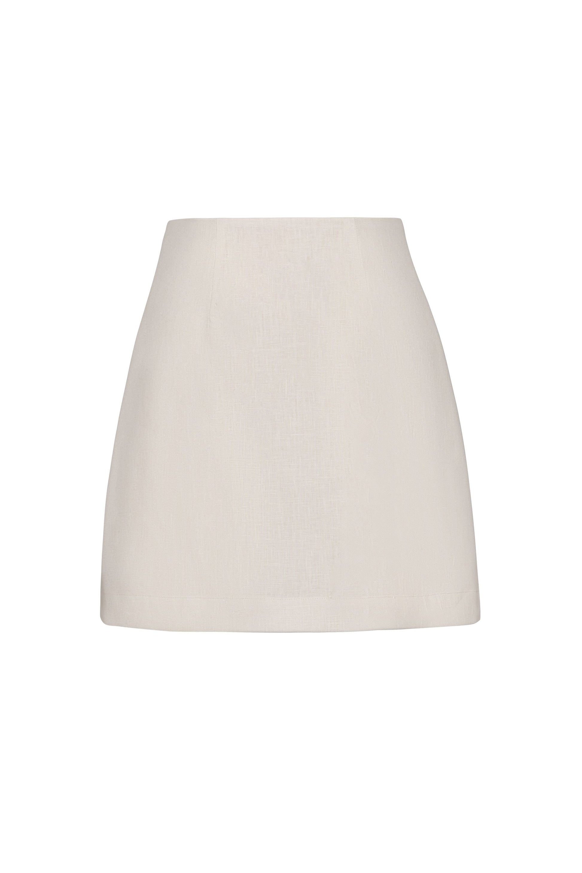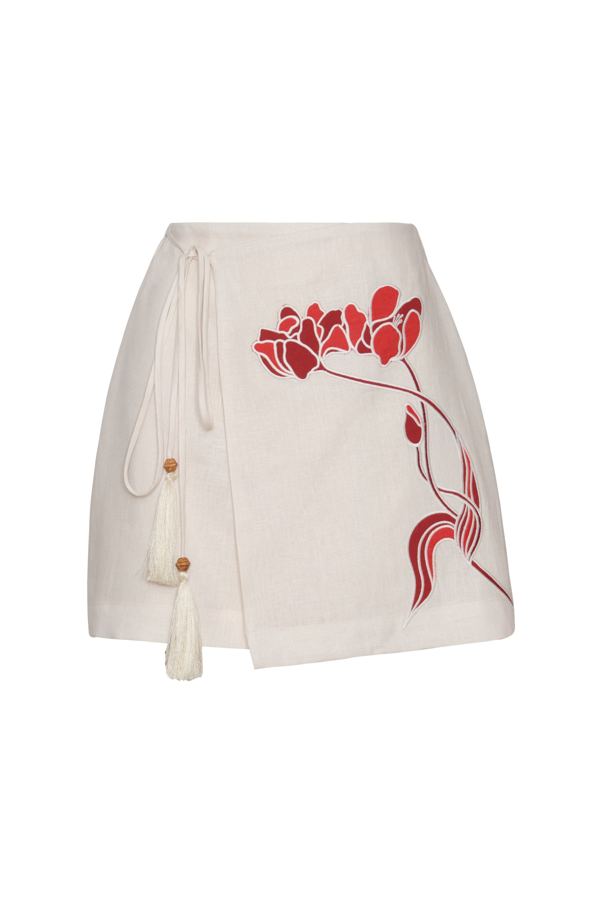 Del Amor is a off white mini skirt in 100% linen. Embroidered with delicate details, it evokes a romantic and fresh feel, ideal for sunny days with a handcrafted touch.
