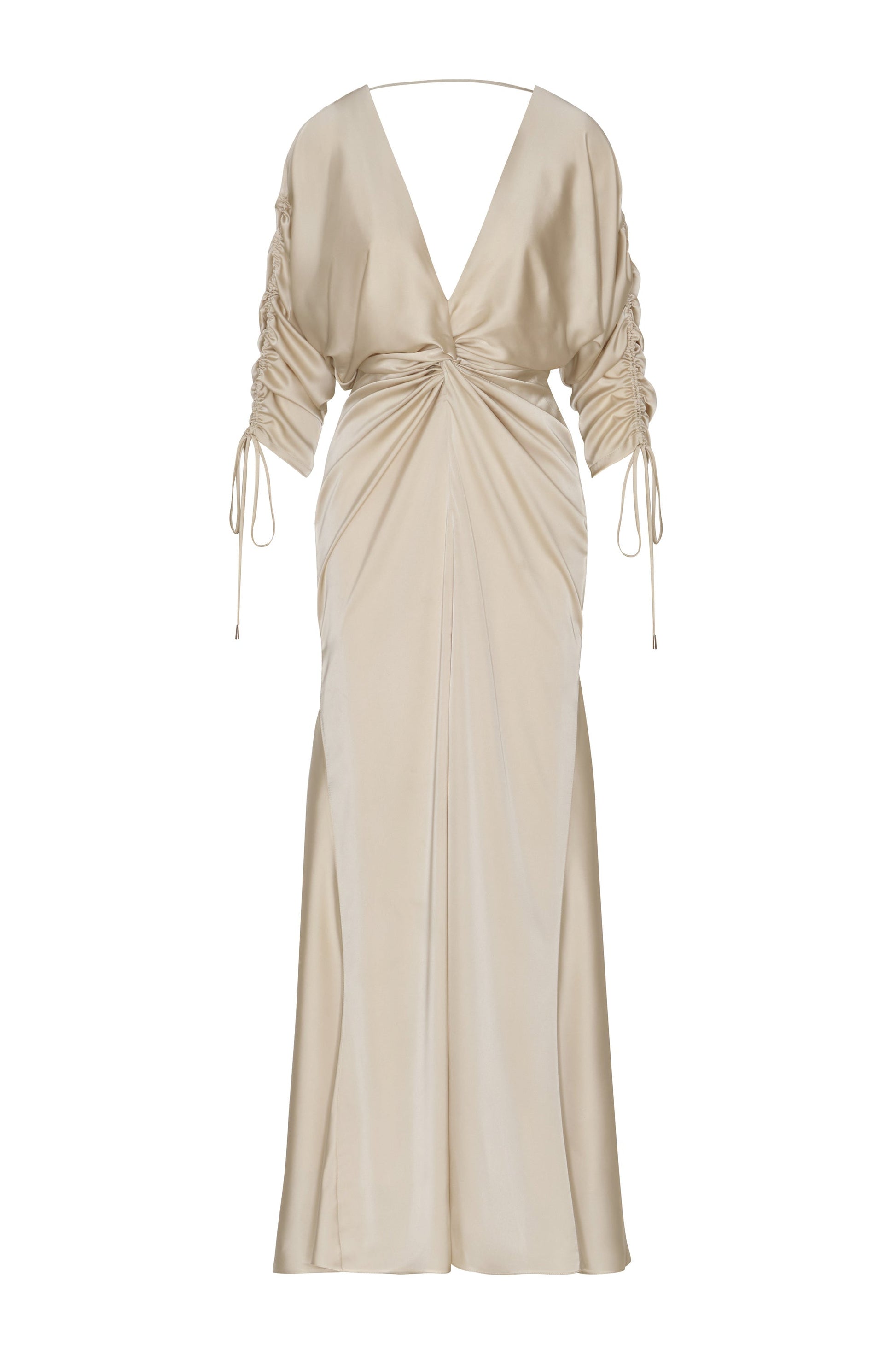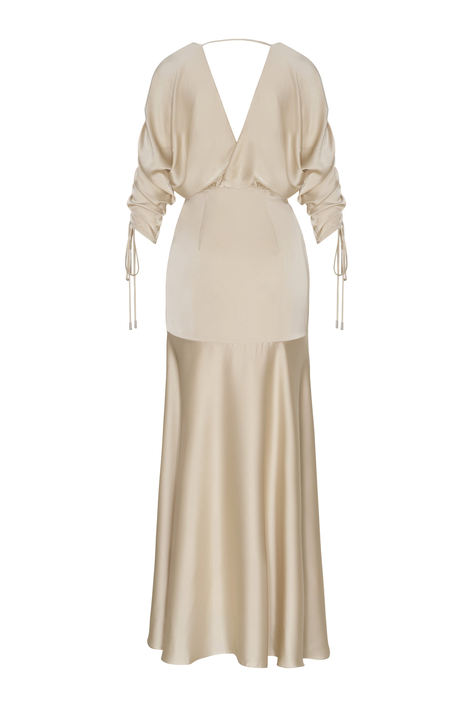 Lirio Dorado, a long sand-toned dress that dazzles with its soft drape and satin finish. An elegant and timeless piece, perfect for special occasions.