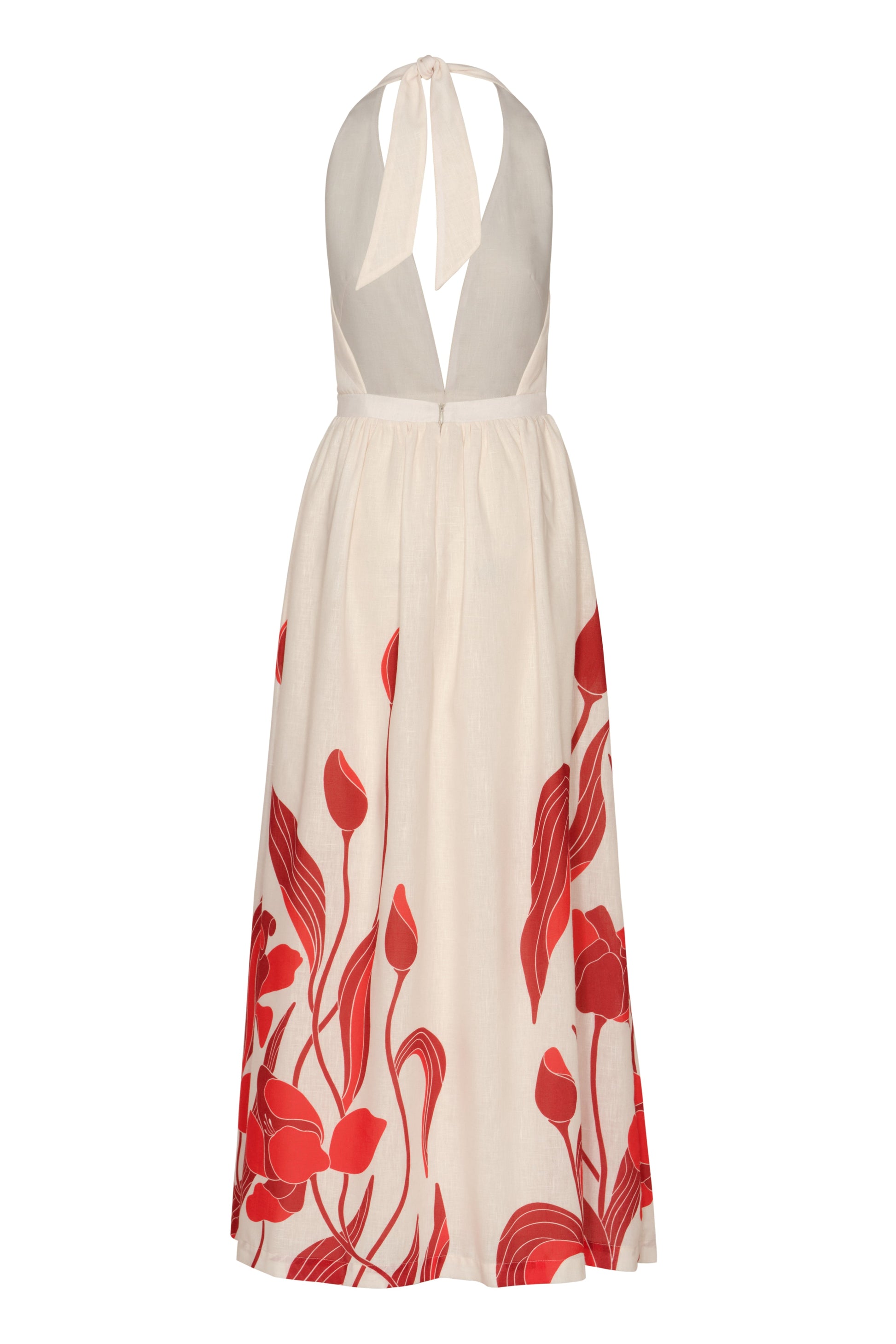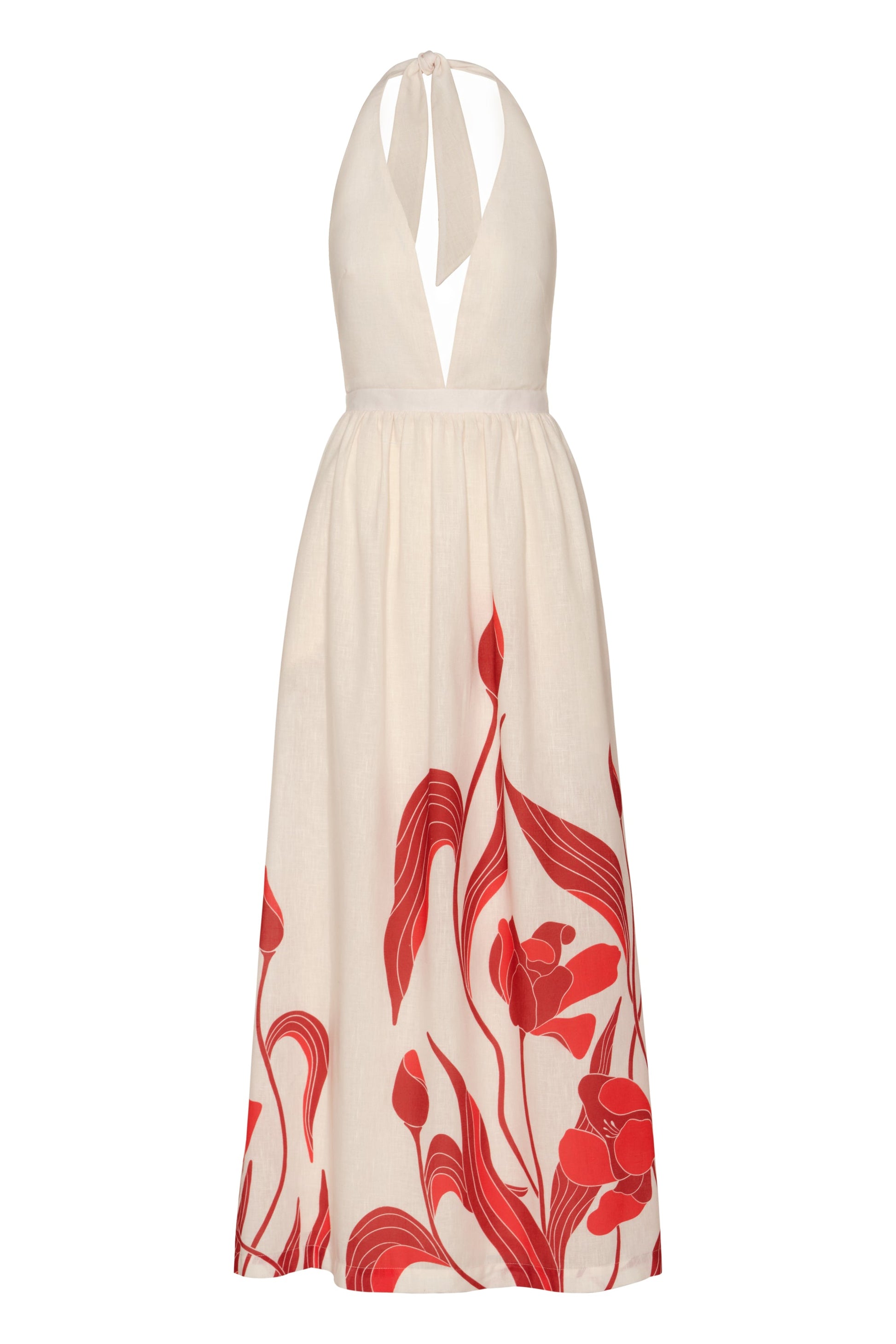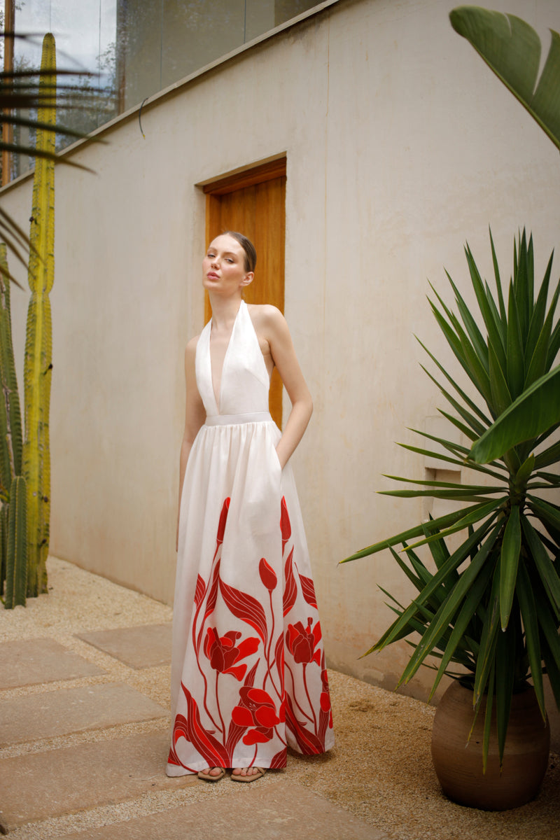 A linen maxi dress with scarlet tulip design. A radiant silhouette that celebrates natural elegance with an artistic touch.