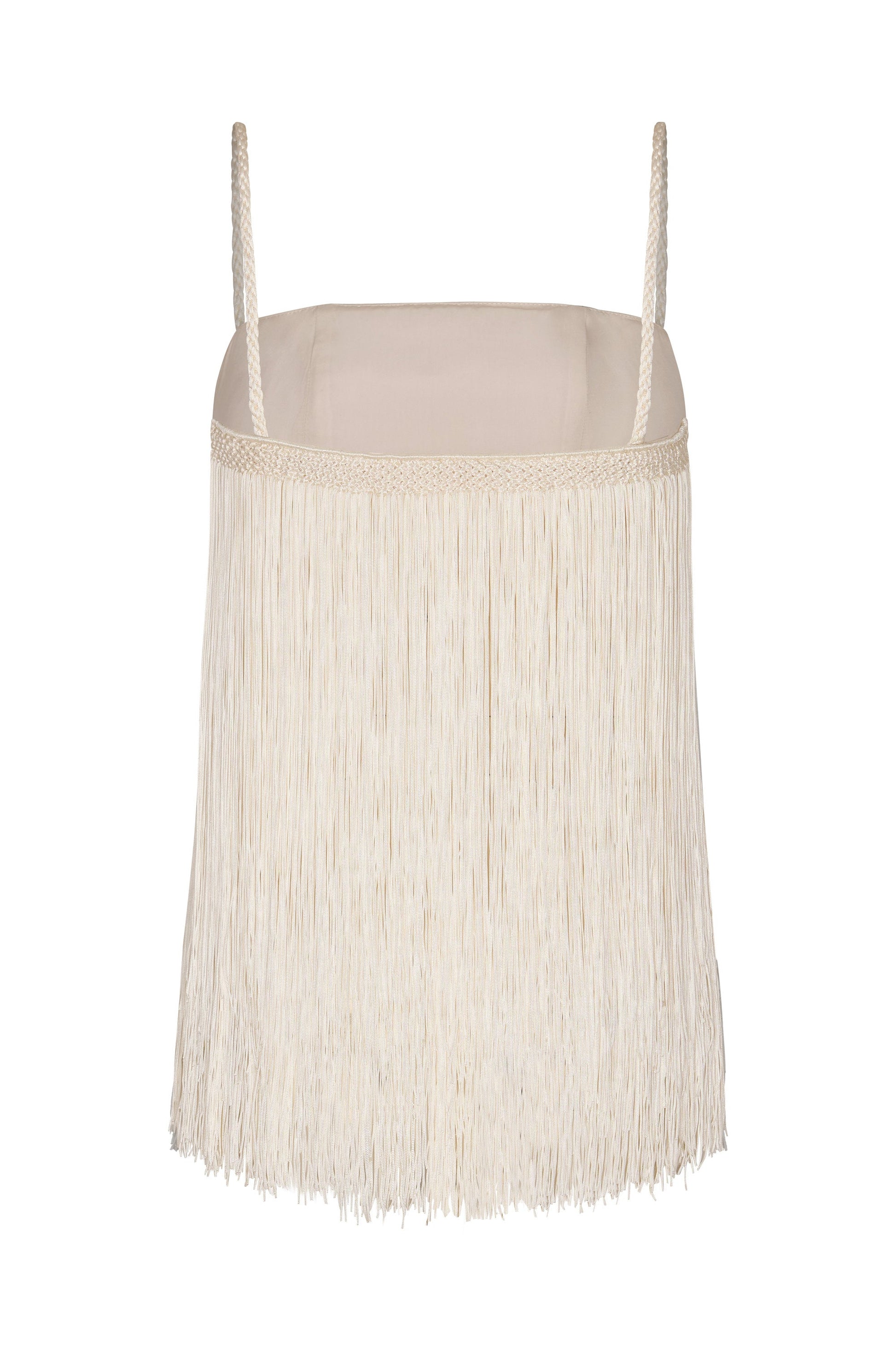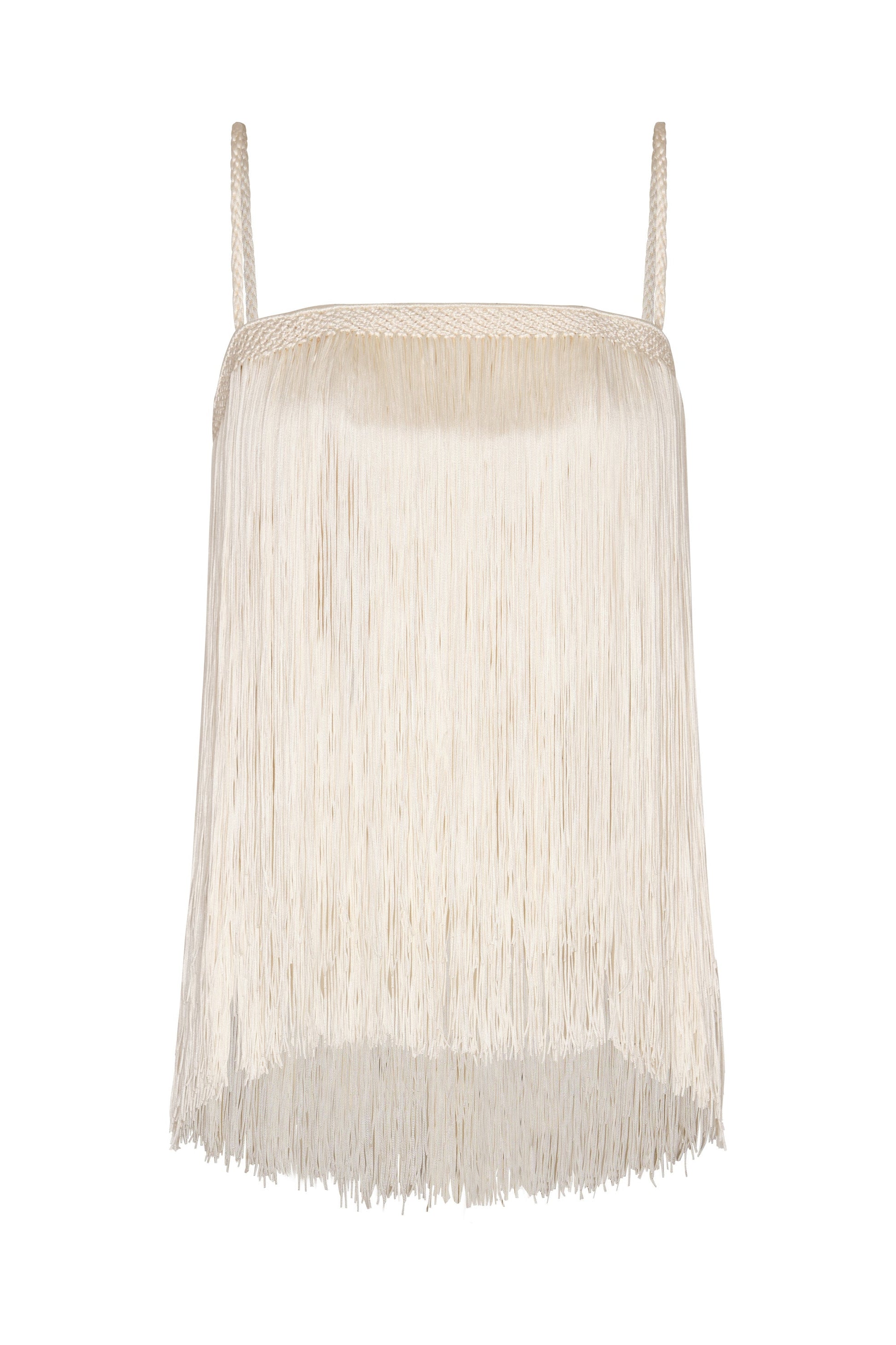 "Ilusion Petrea" Ivory-colored top with a linen base and polyester fringes. A dynamic piece that combines elegance and fun with a subtle touch of freshness.
