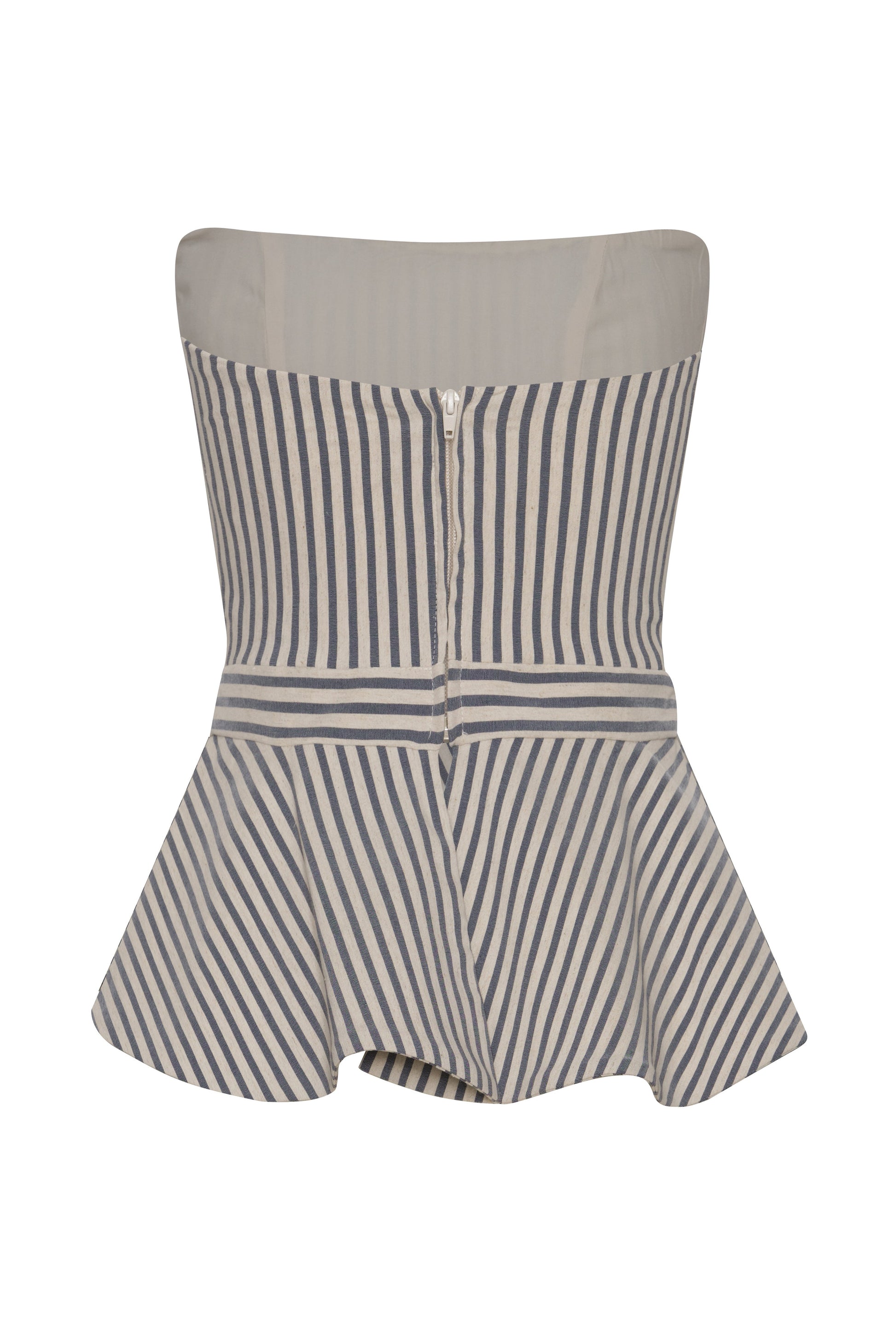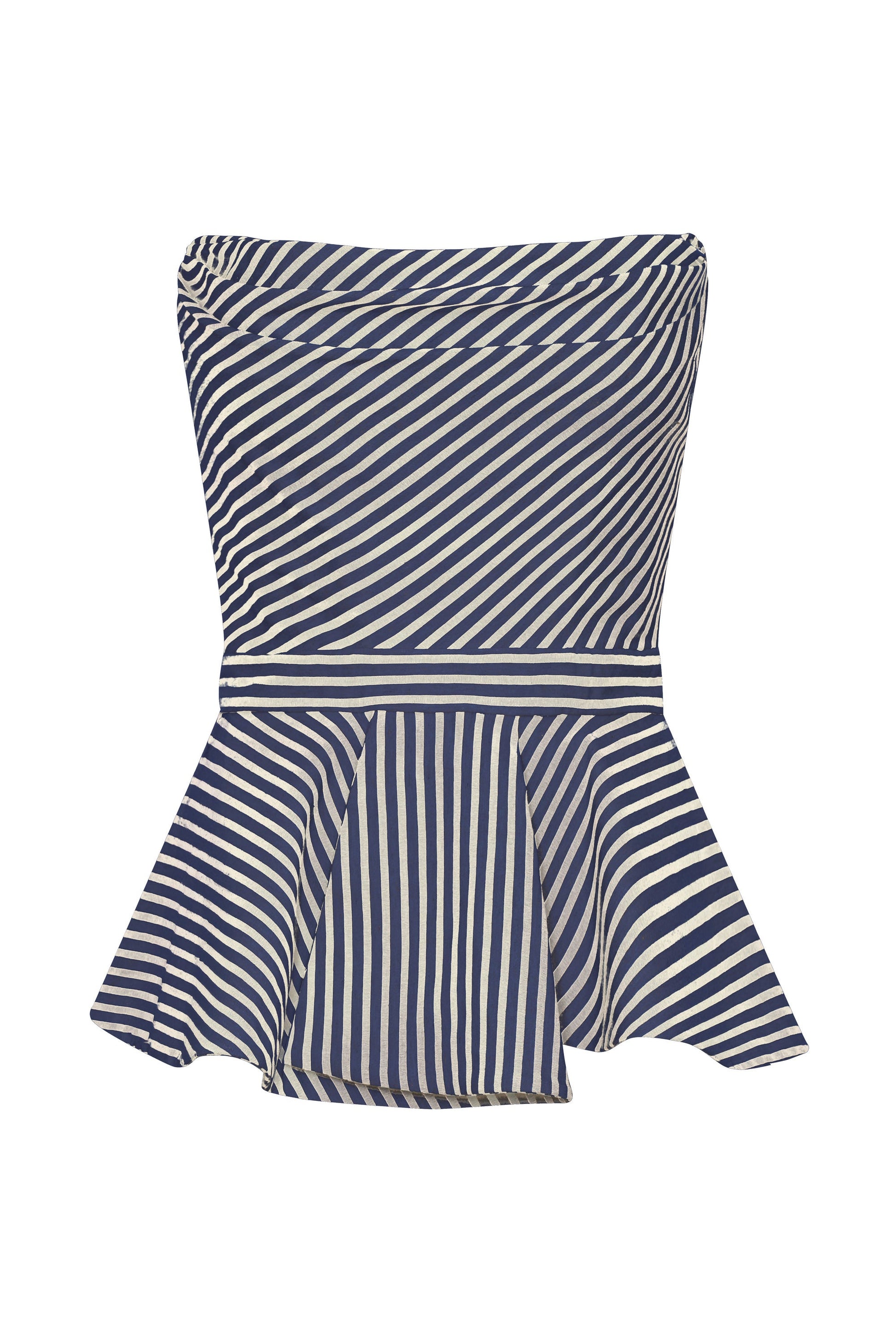 A cotton twill blouse with navy stripes plays with the direction of the print to enhance the silhouette. Inspired by the organic shapes of the garden, it provides structure with a romantic touch.