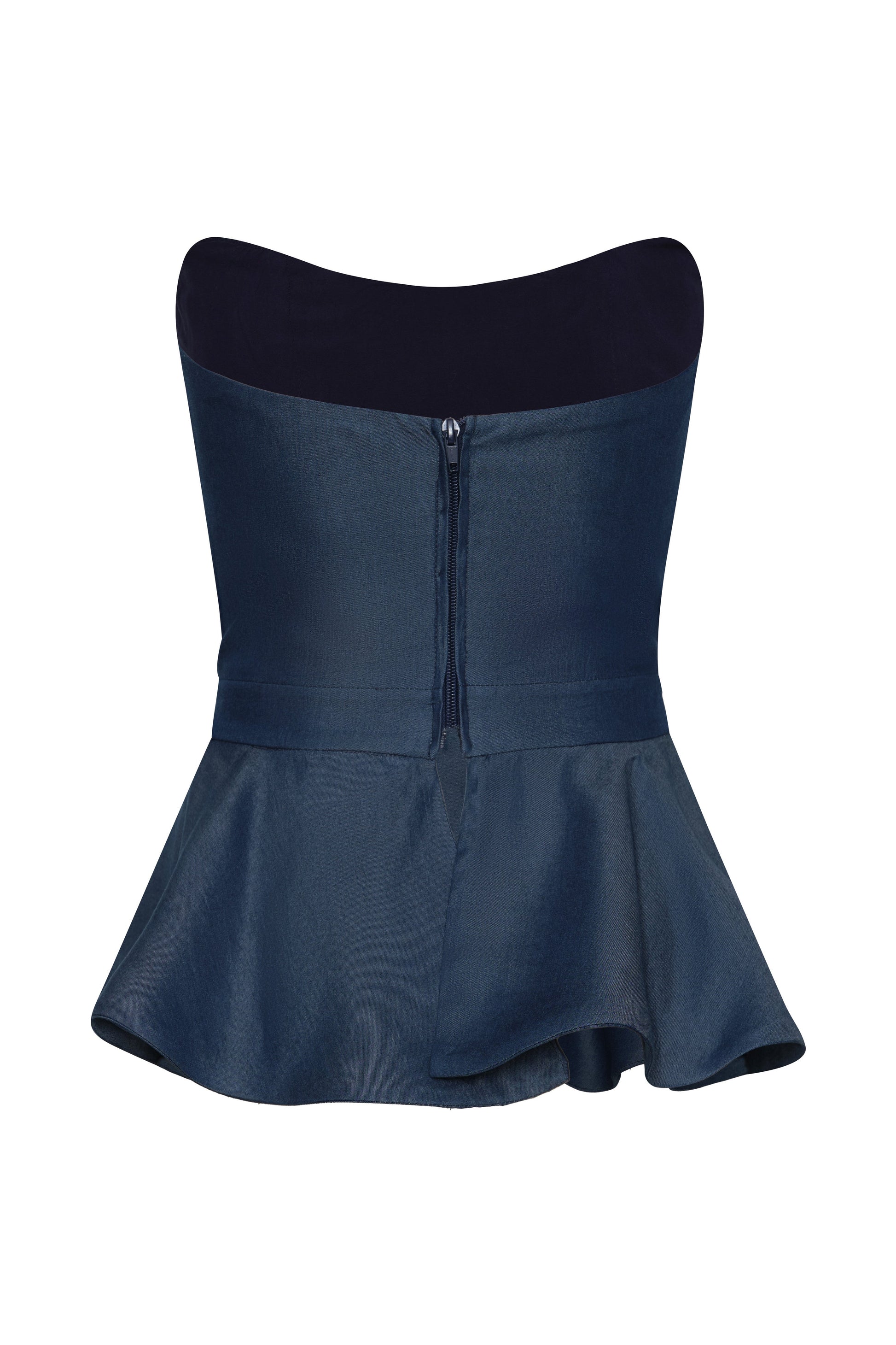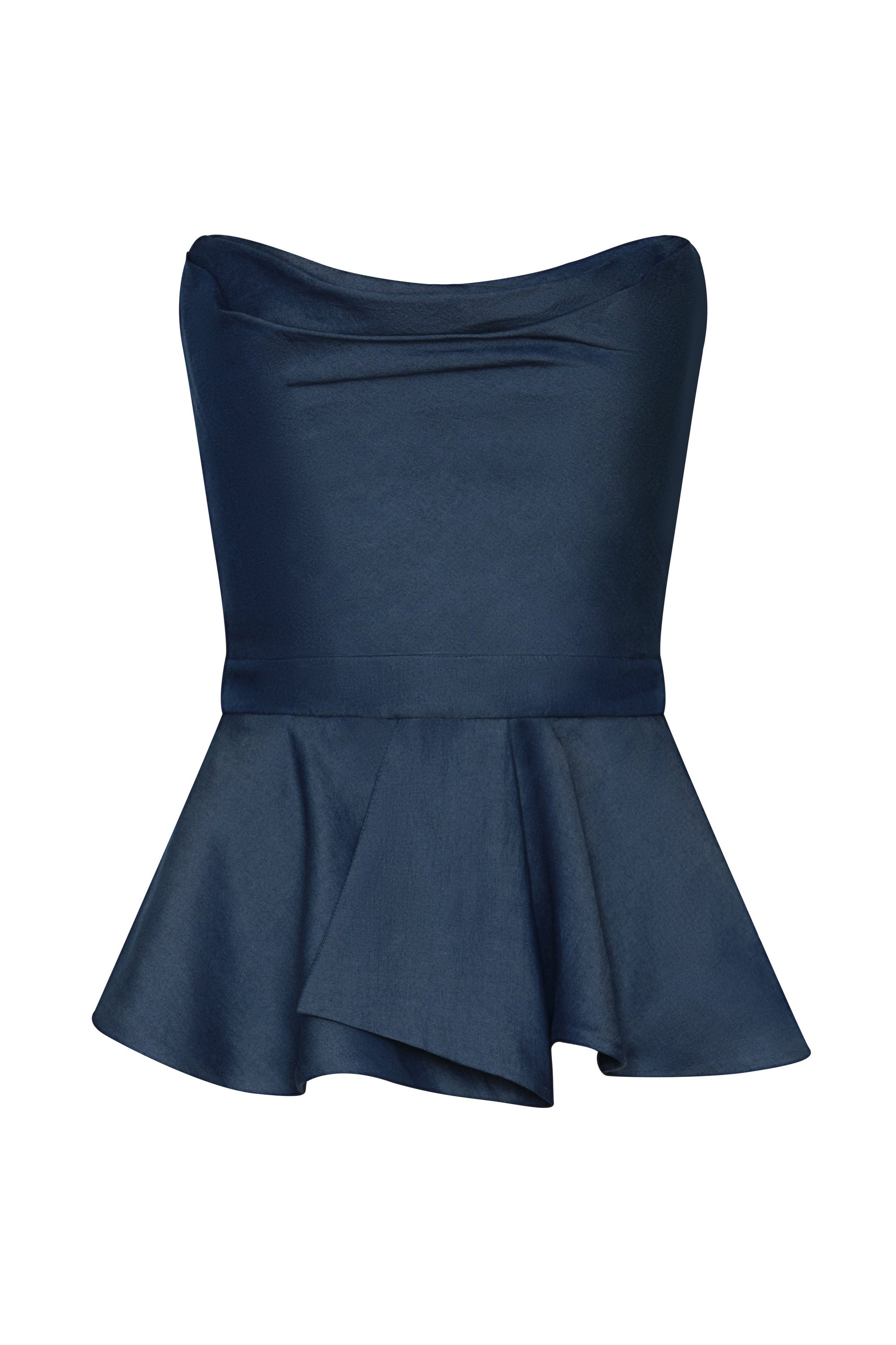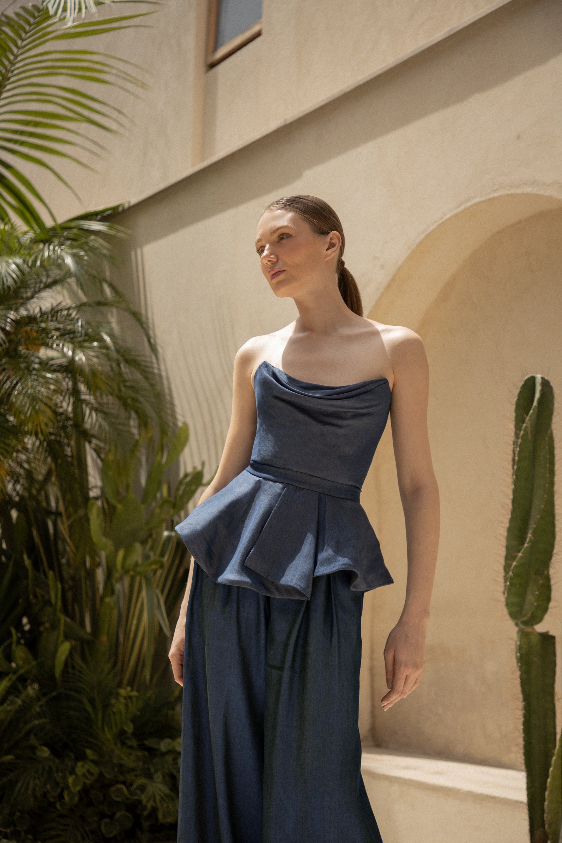 Dark denim blouse made from 100% Tencel, featuring a corset-style silhouette and a fluid drape. Inspired by the duality of structure and movement, it reflects the strength and femininity of a blooming garden.