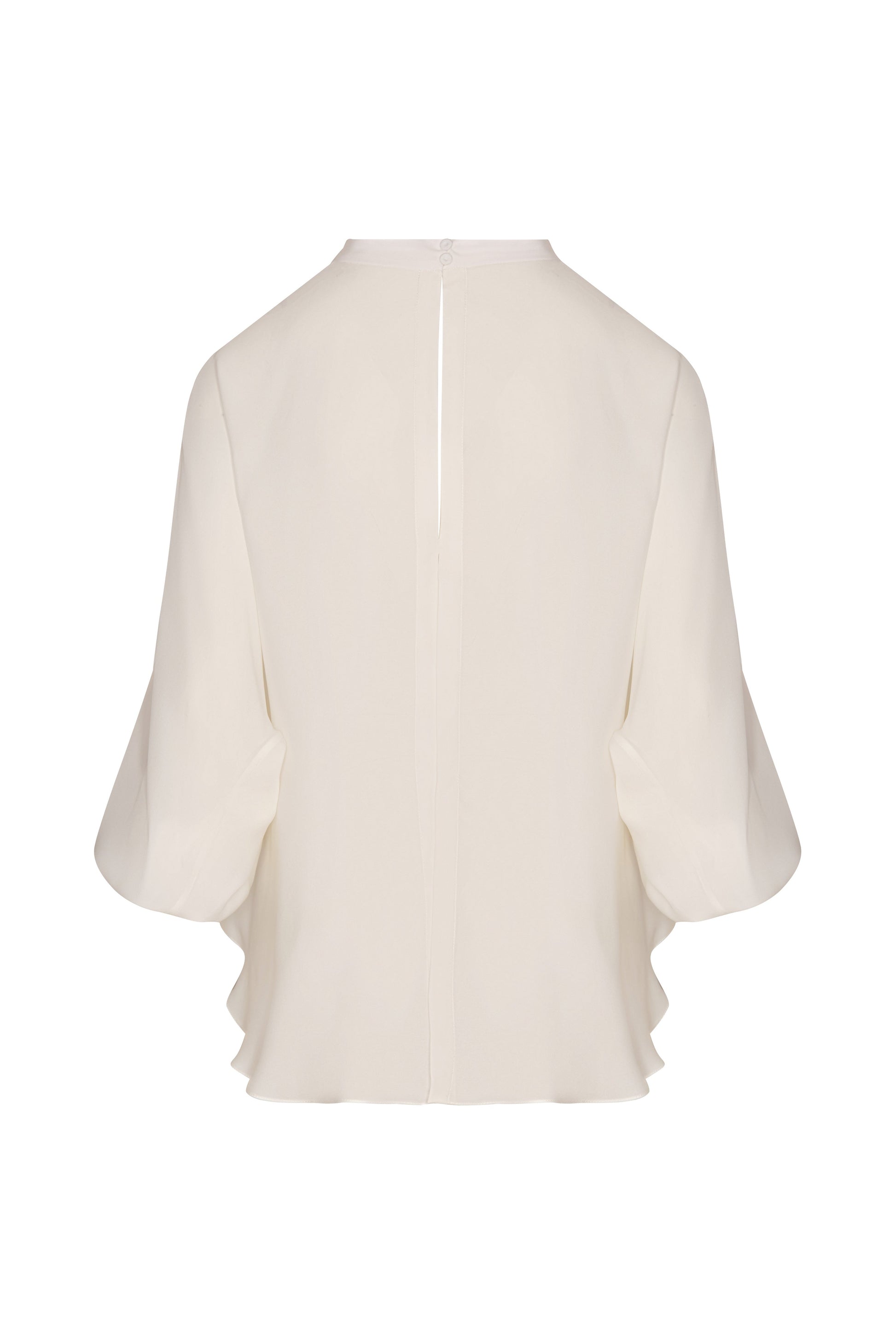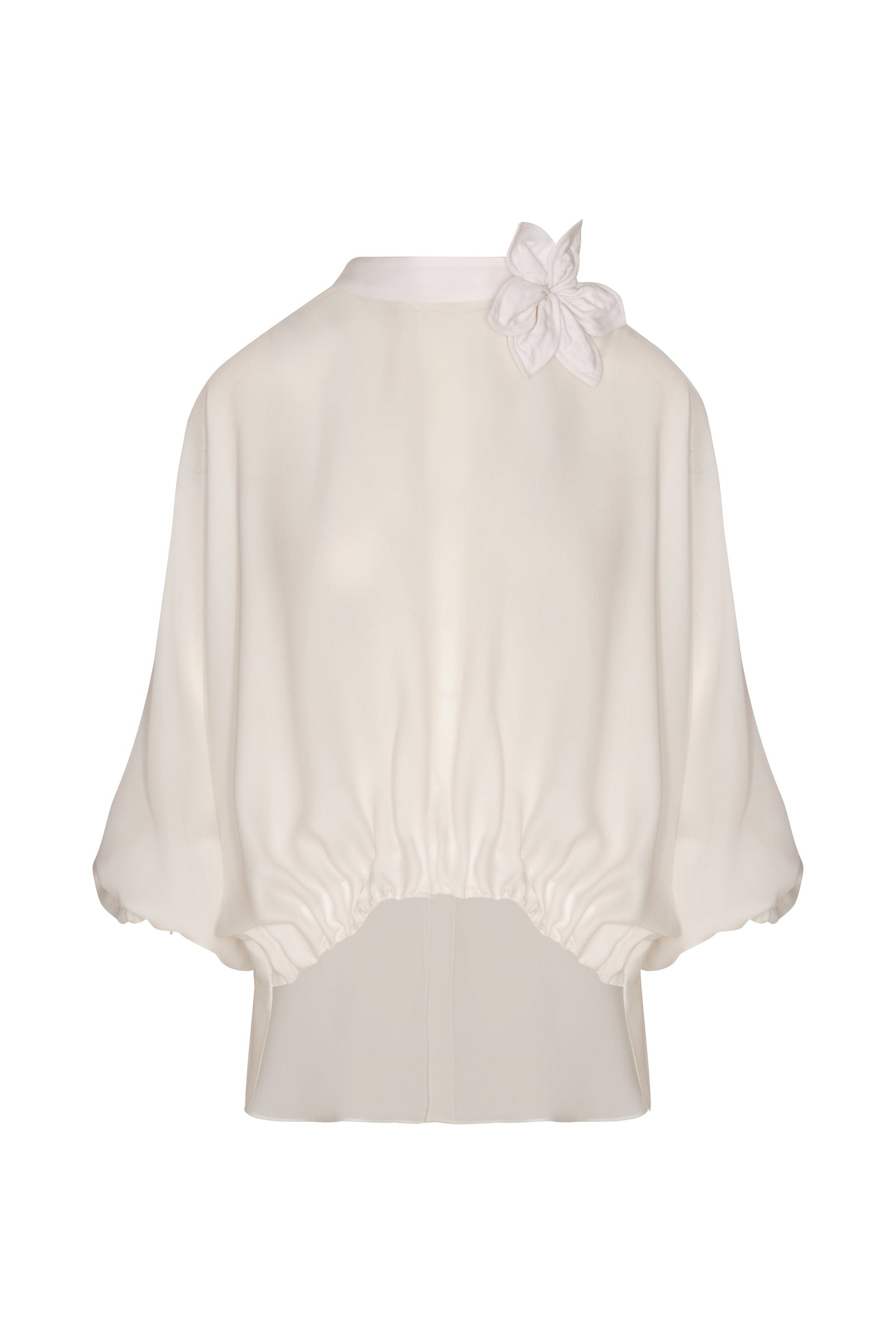 Dahlia blouse in an off-white hue, crafted from soft silk georgette. Its detachable flower adds a touch of charm to this delicate and elegant design.