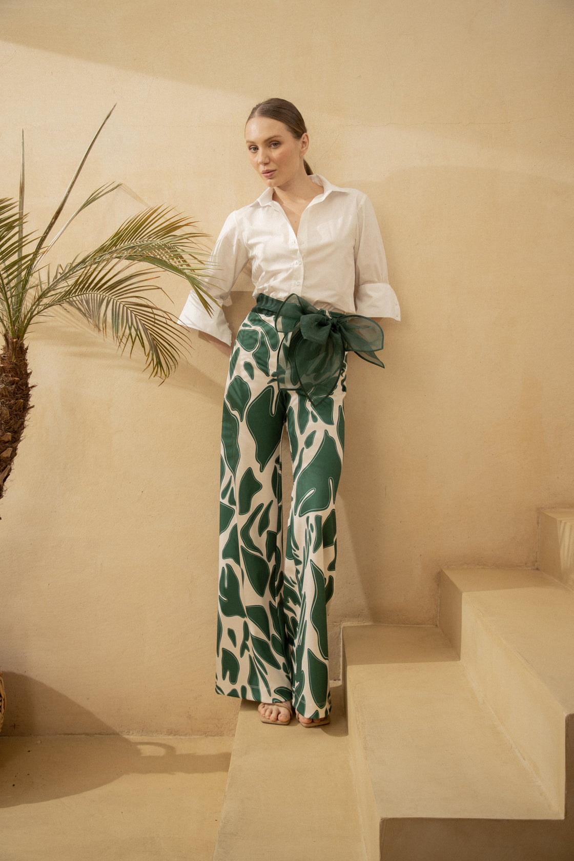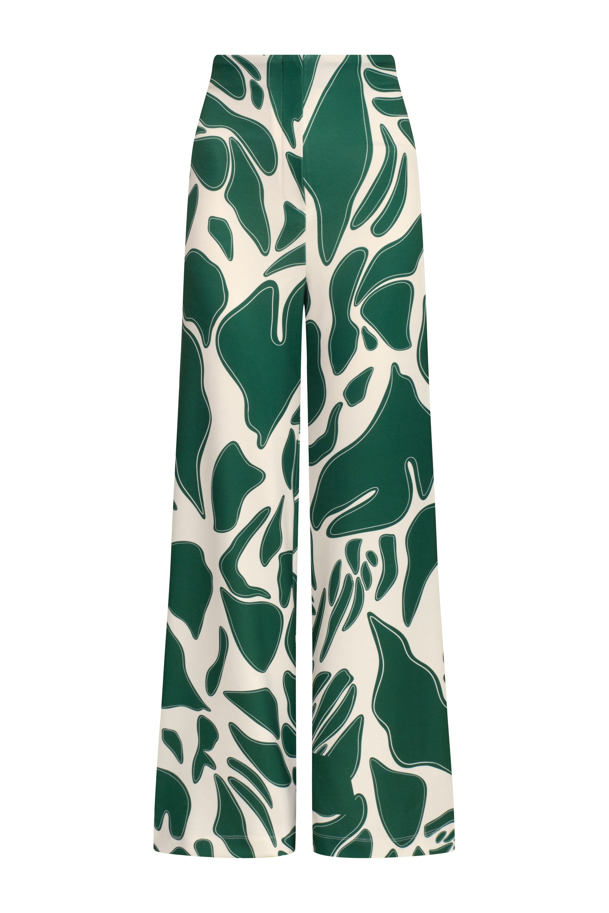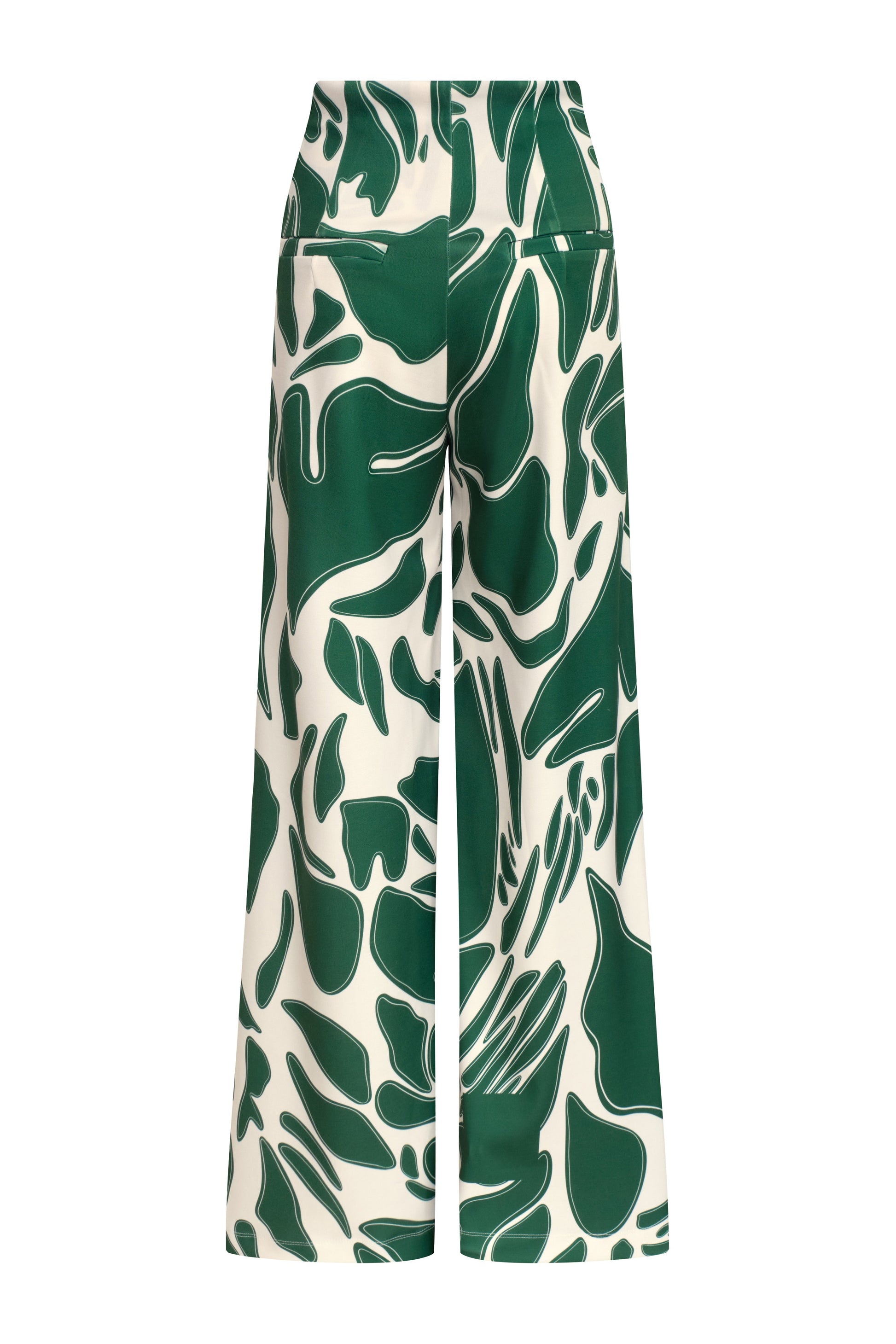 Scuba pant with an abstract print in ivory and green, crafted from a soft, structured blend. Inspired by the free forms of the garden, they add an artistic and modern touch to the silhouette.