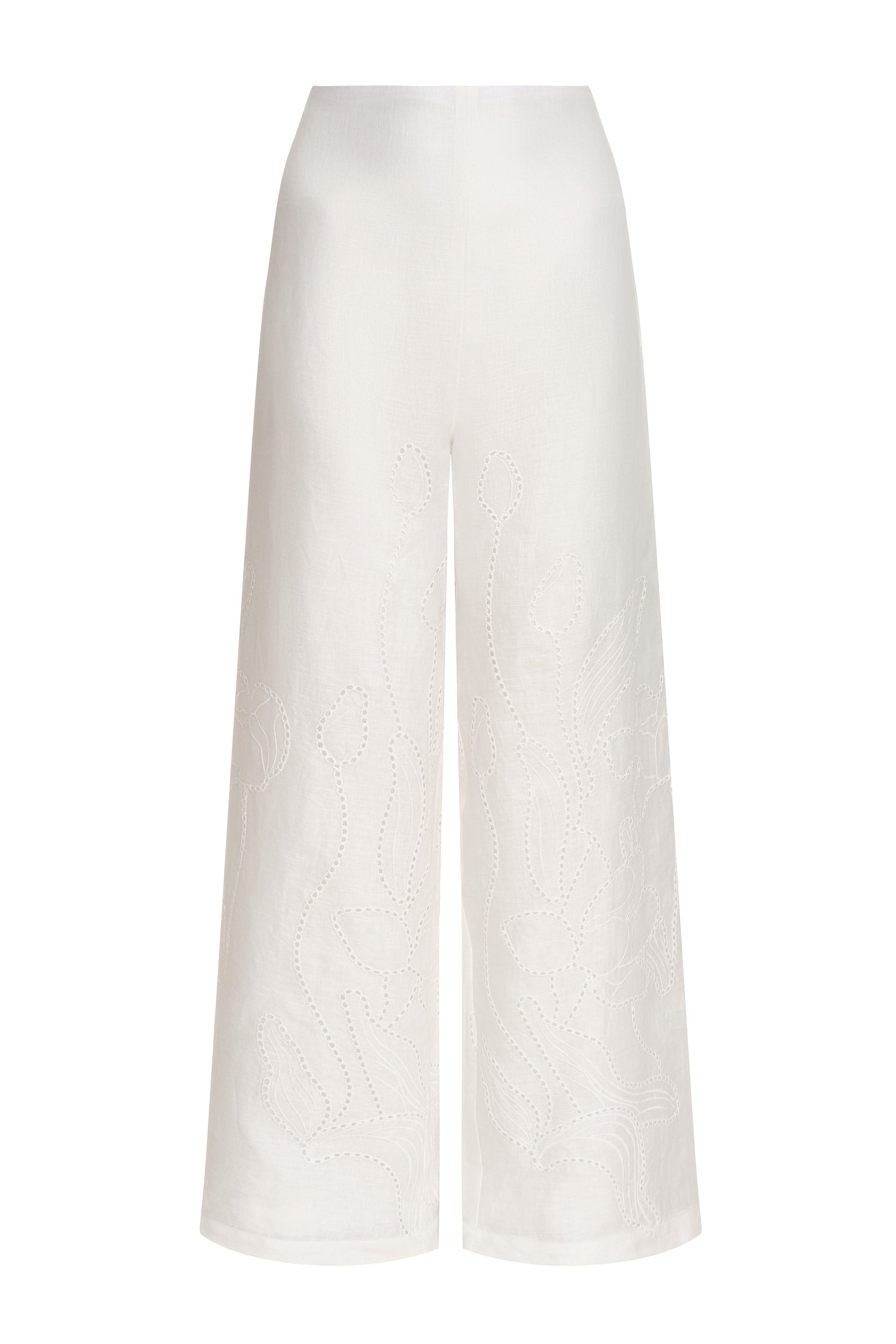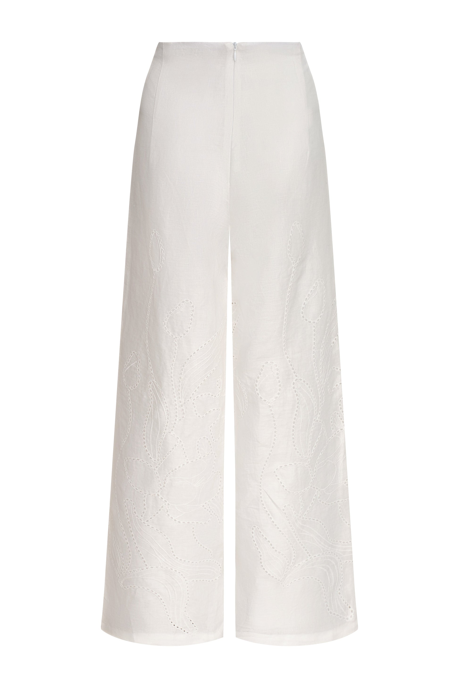 "Sueño Botanico" Embroidered pant in 100% linen in an off-white hue. Delicate details bloom on a relaxed silhouette, inspiring a natural and timeless style.