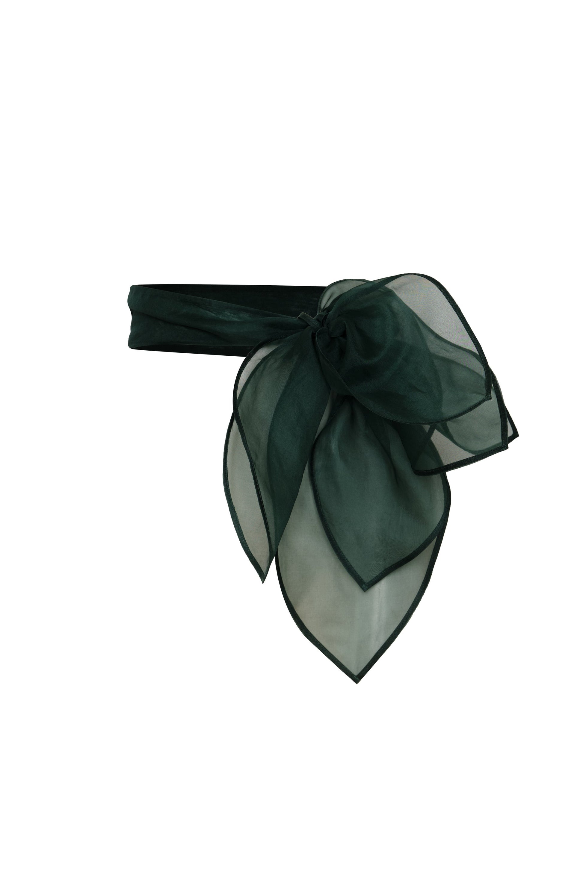 Pine-green silk organza belt. Its flowing bow evokes the lightness of a flowering garden. Pure sophistication.