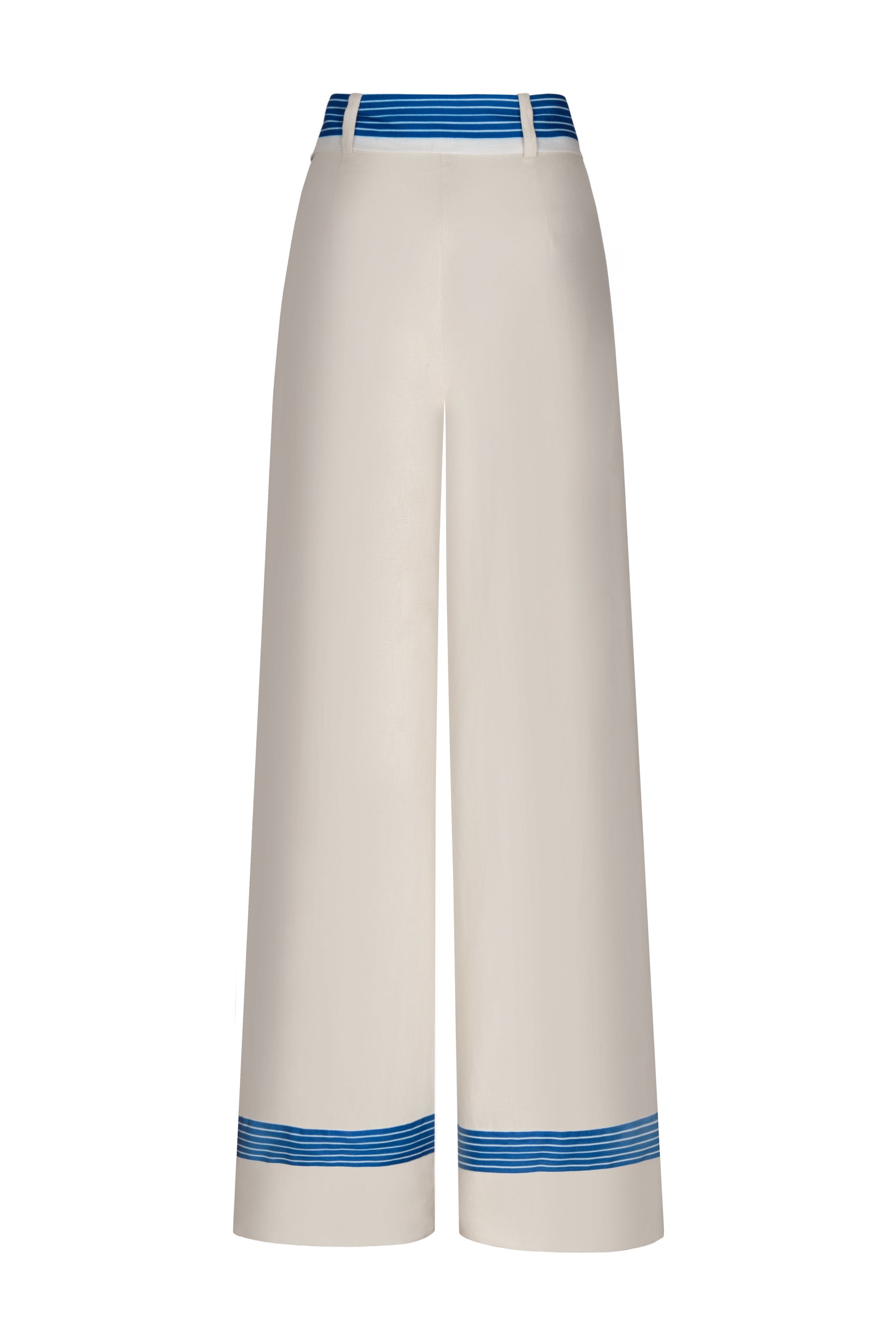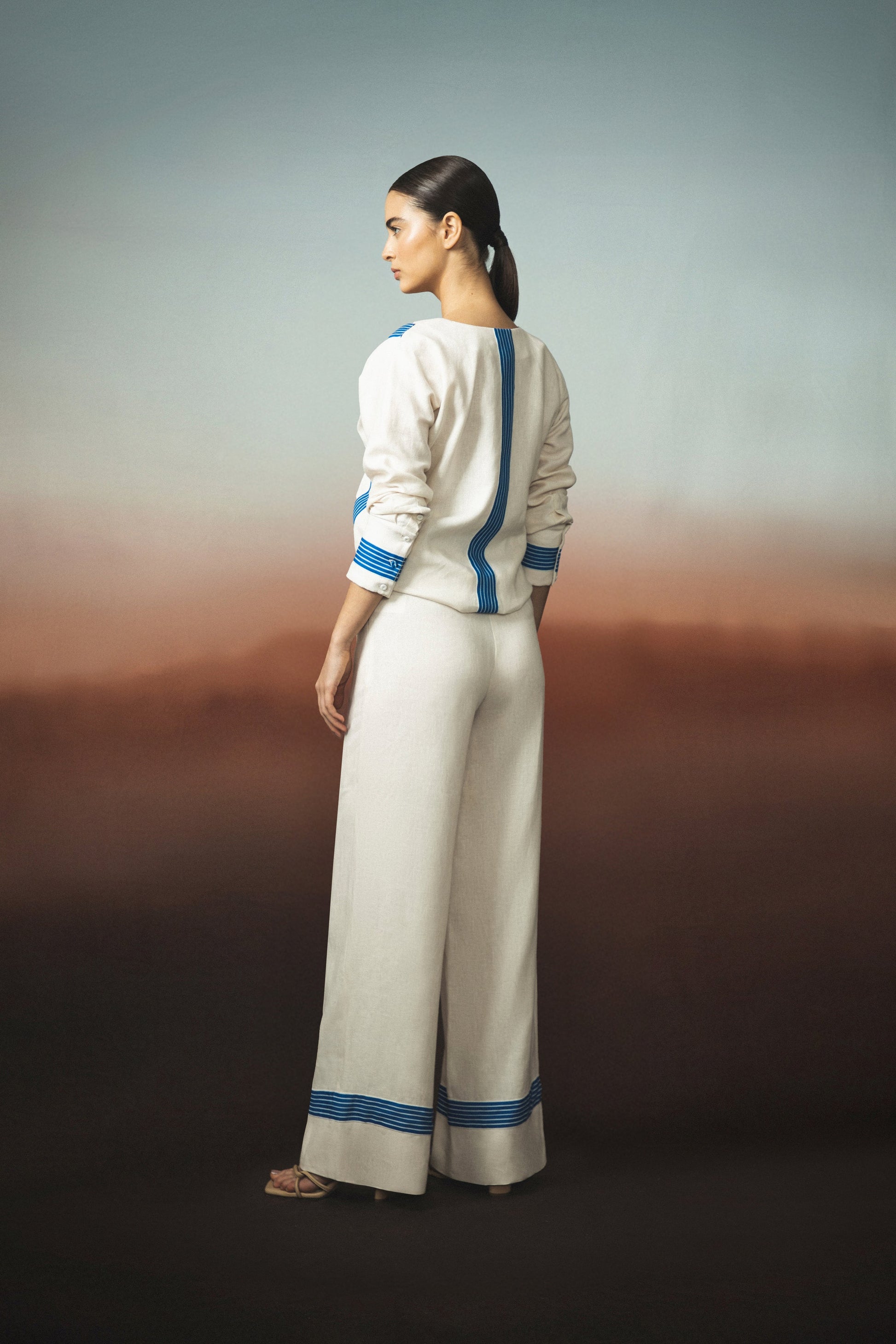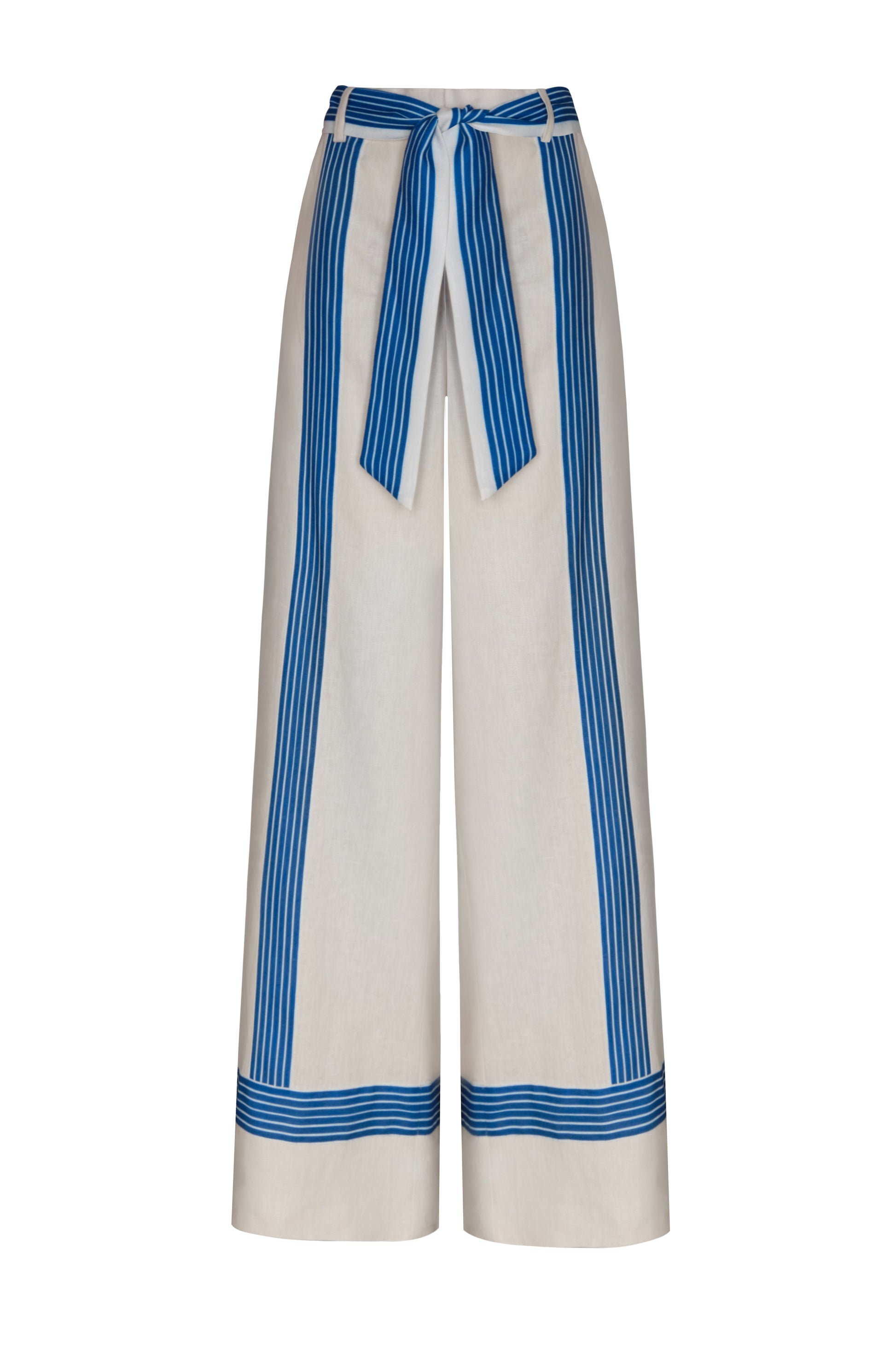Ritmo Noble is a blue pinstripe pant crafted from pure linen. Its belt adds a refined accent to the piece, while delicate details elevate the silhouette with quiet sophistication.