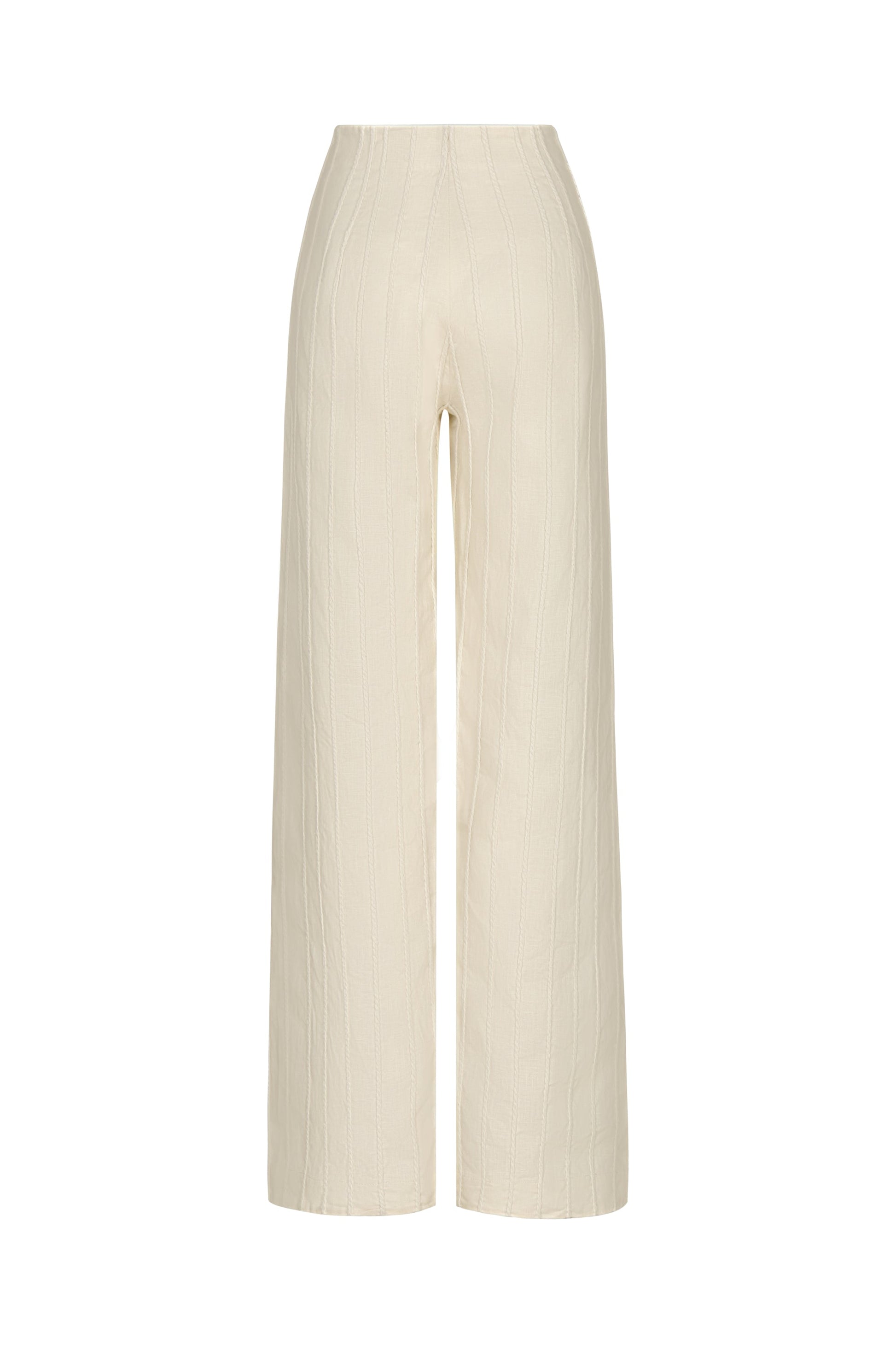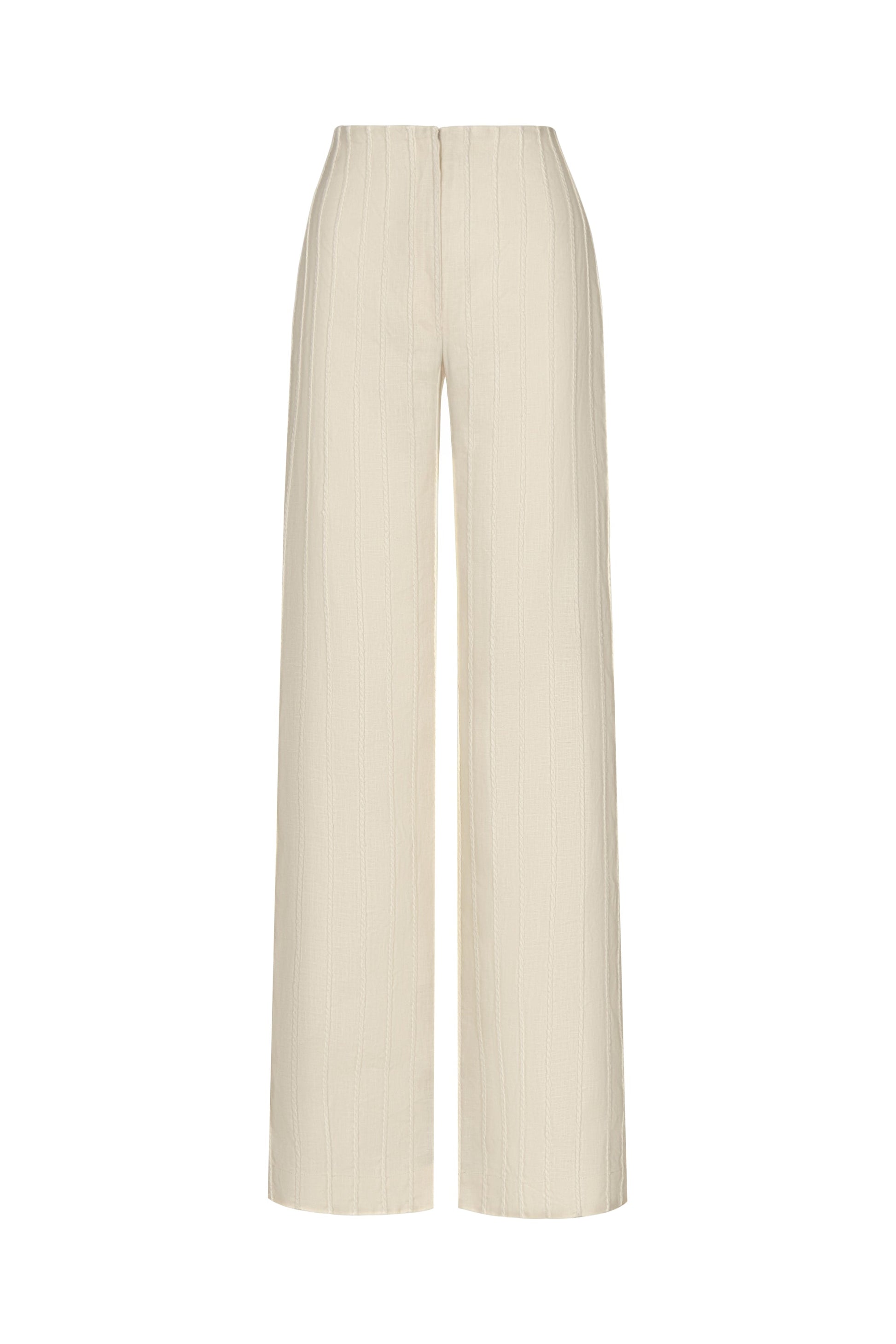 Embroidered ivory linen pants with a straight silhouette and soft drape, blending comfort and elegance.