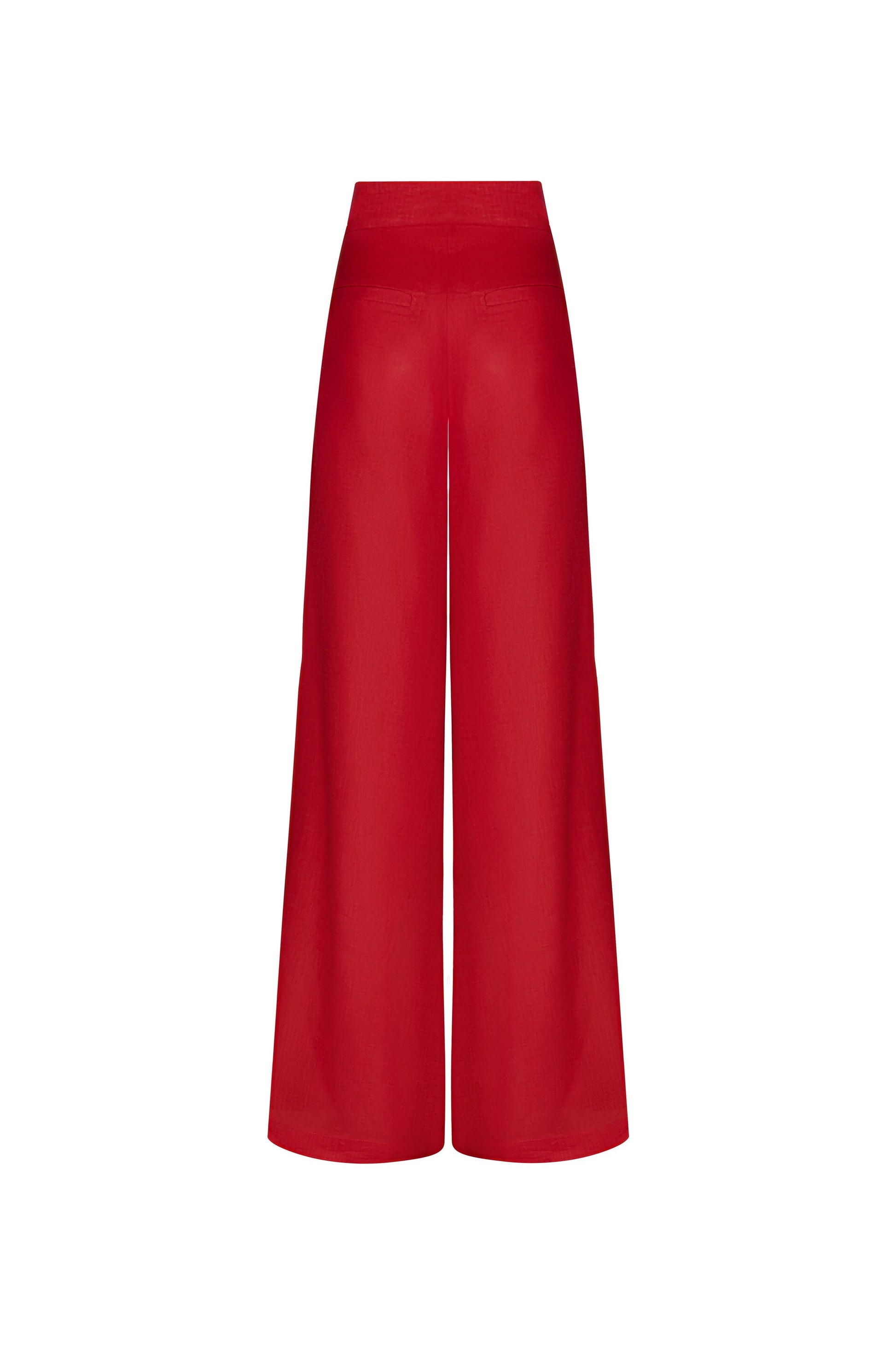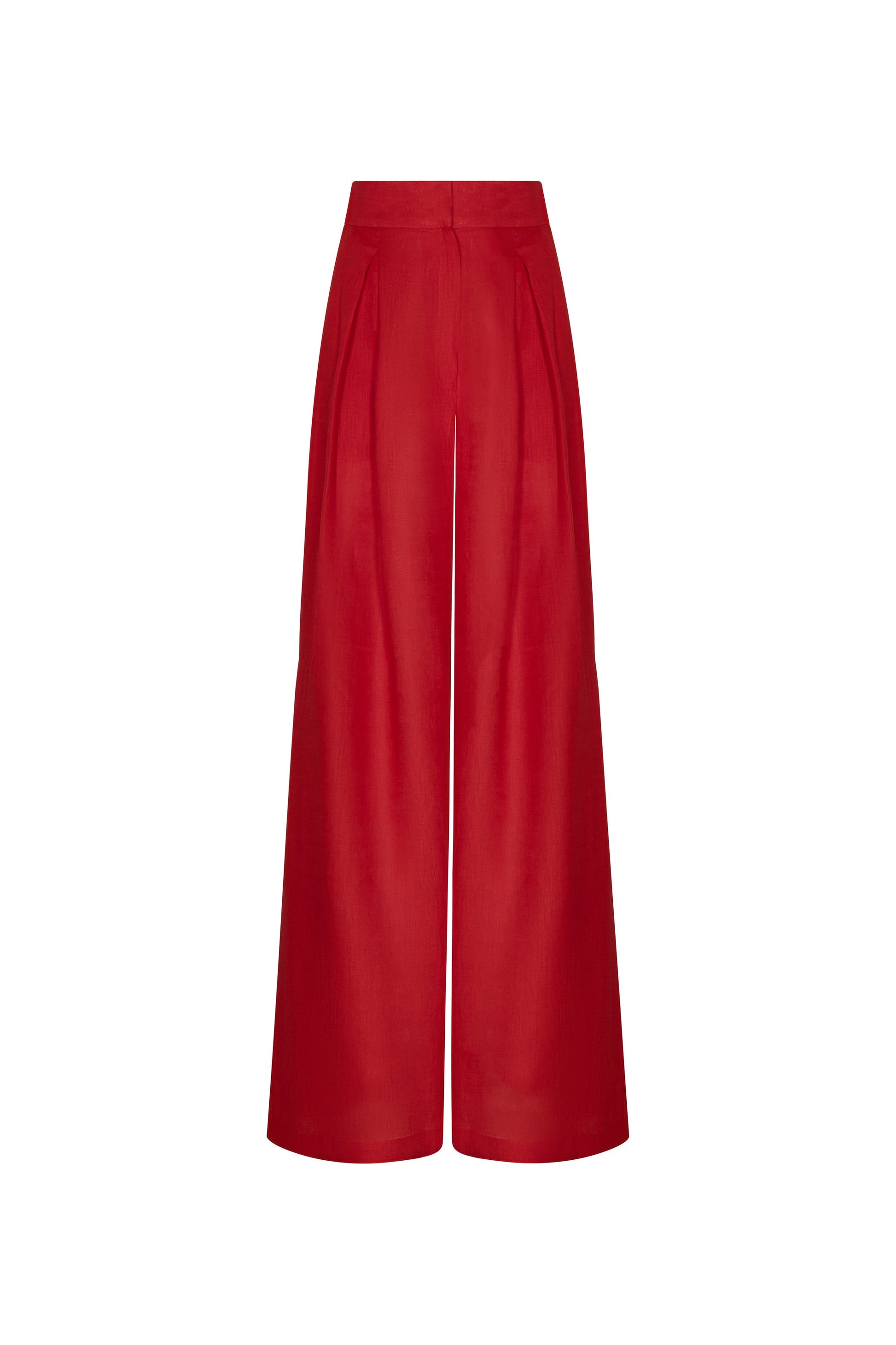 Red pant with refined front pleats, high waist, and wide-leg cut that elongates the silhouette while offering a versatile, elegant look.