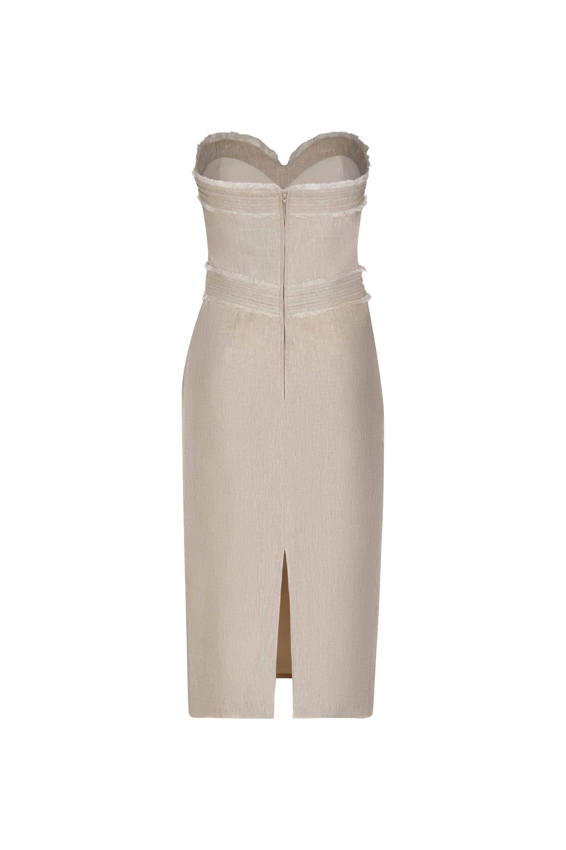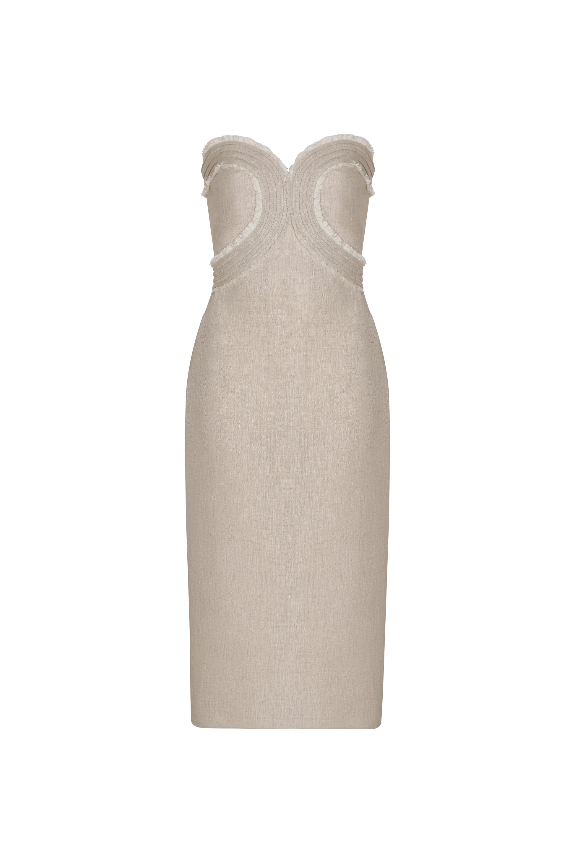 Midi dress in 100% linen with exquisite embroidery that enhances its sophisticated character. A distinctive design that blends elegance and craftsmanship, created to highlight femininity with subtlety and timeless style.