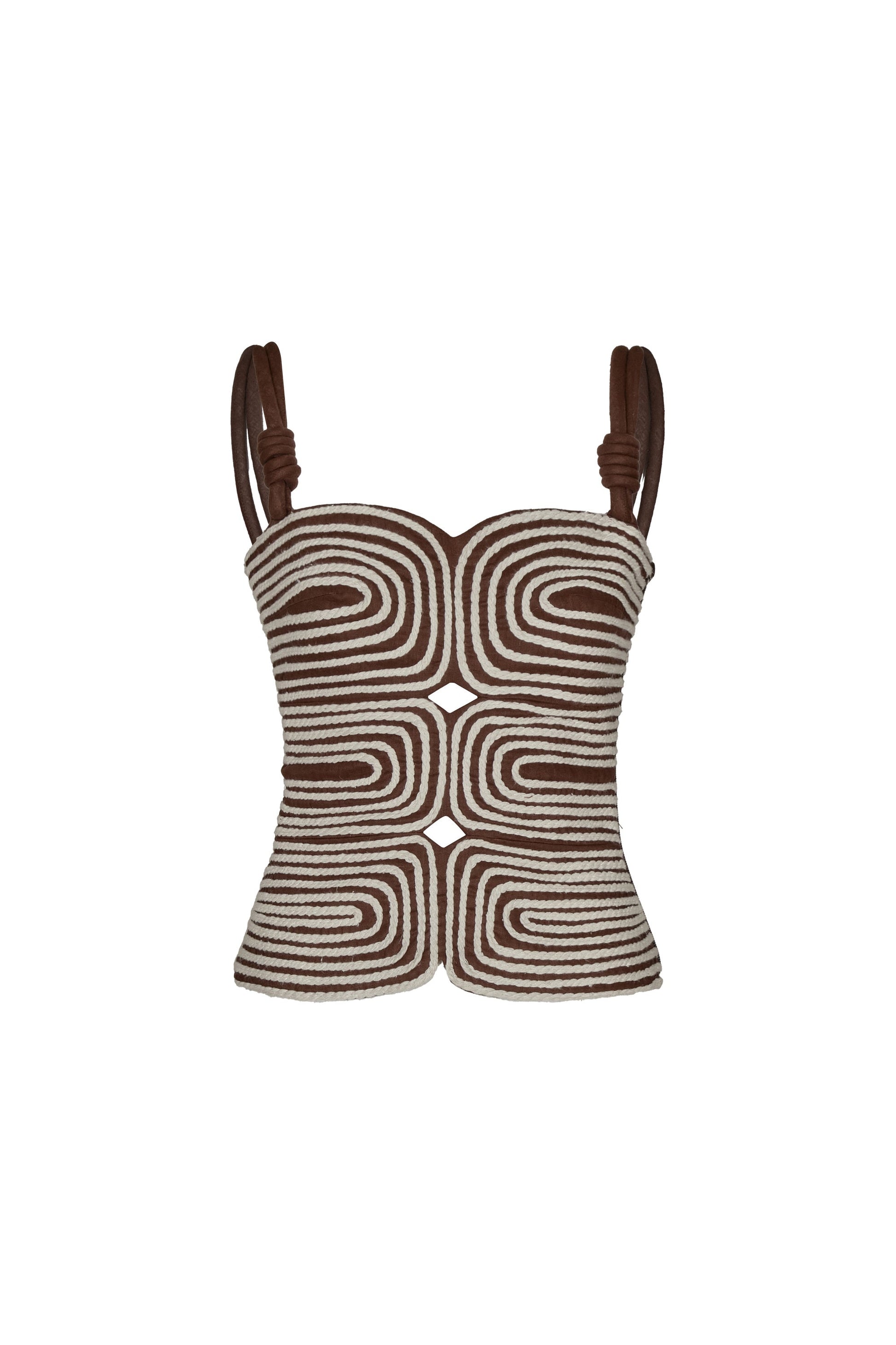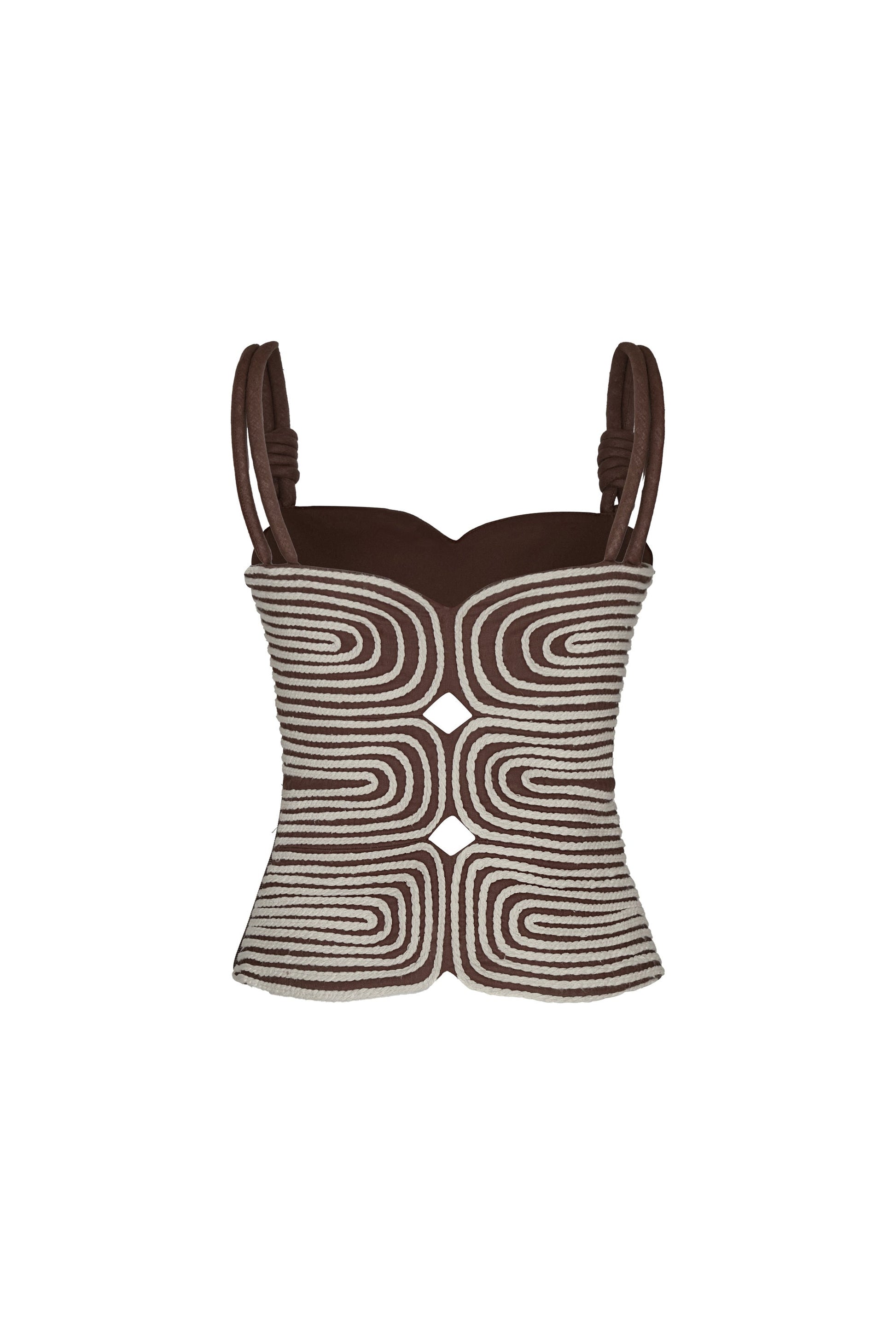 Top crafted in mocha linen, adorned with delicate embroidery that highlights its unique design. An artisanal piece that radiates freshness and elegance, made to be worn with timeless style