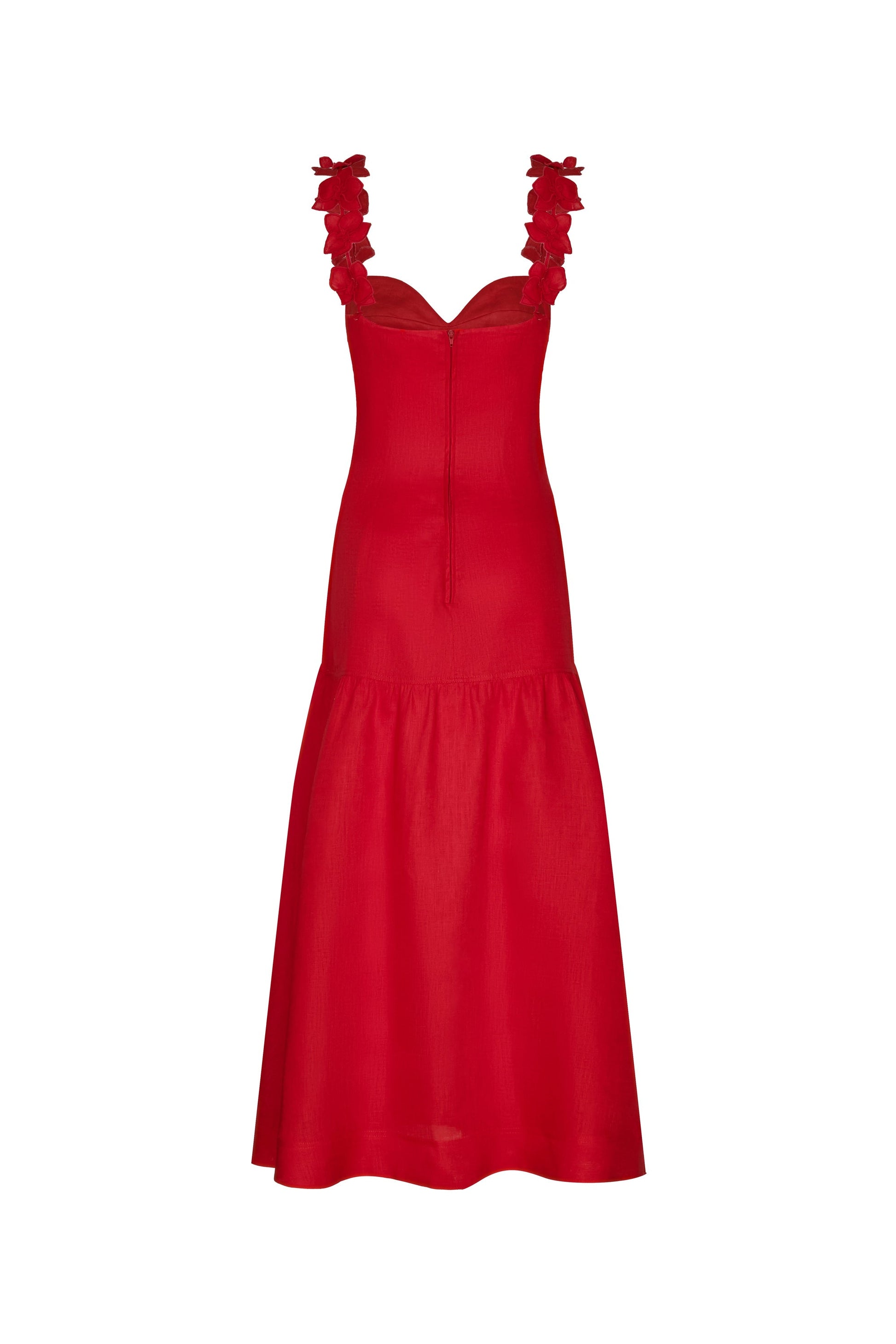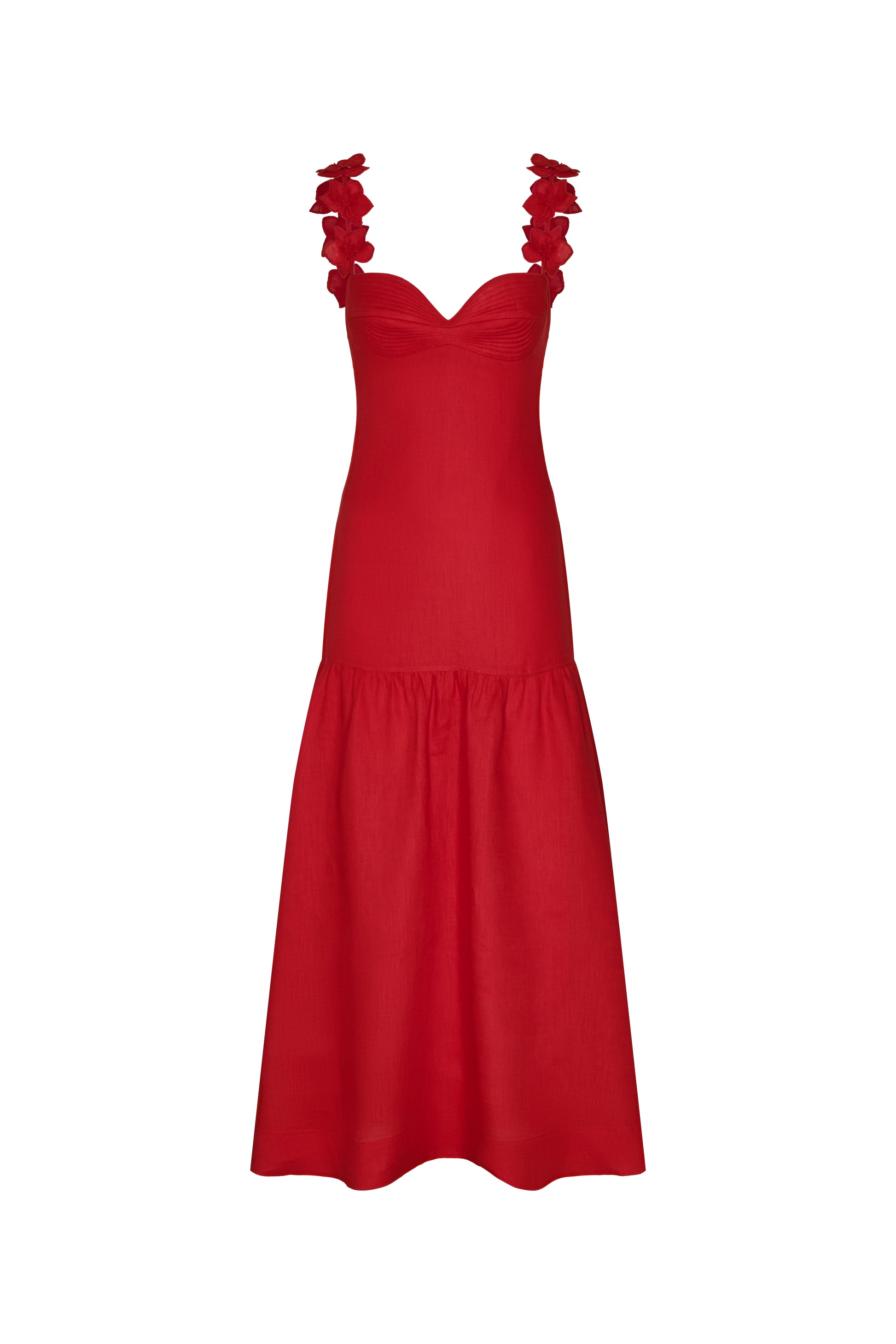 Maxi dress crafted in red linen, an elegant design that blends sophistication and strength. The delicate embellishments highlight its distinctive character, making it a piece that celebrates art in motion.