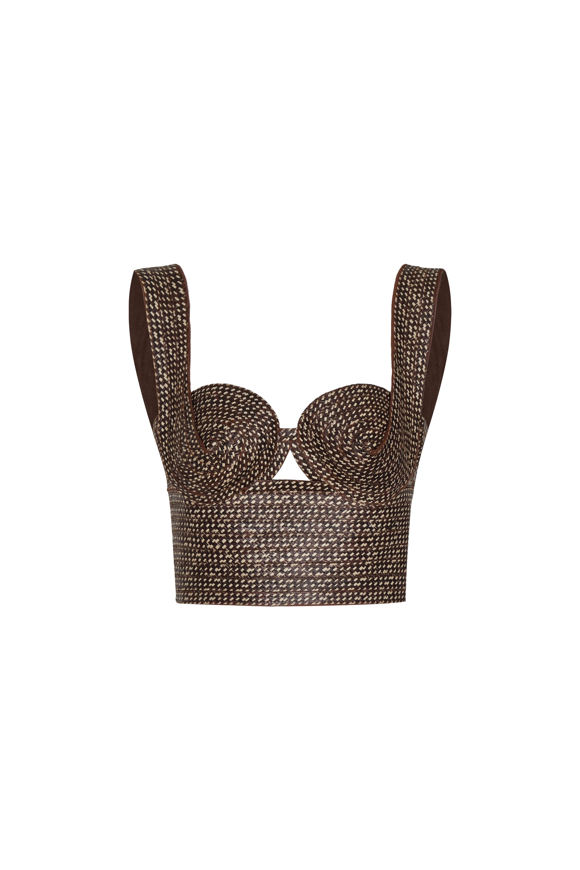 Top crafted in mocha linen, adorned with delicate embroidery that highlights its unique design. An artisanal piece that radiates freshness and elegance, made to be worn with timeless style