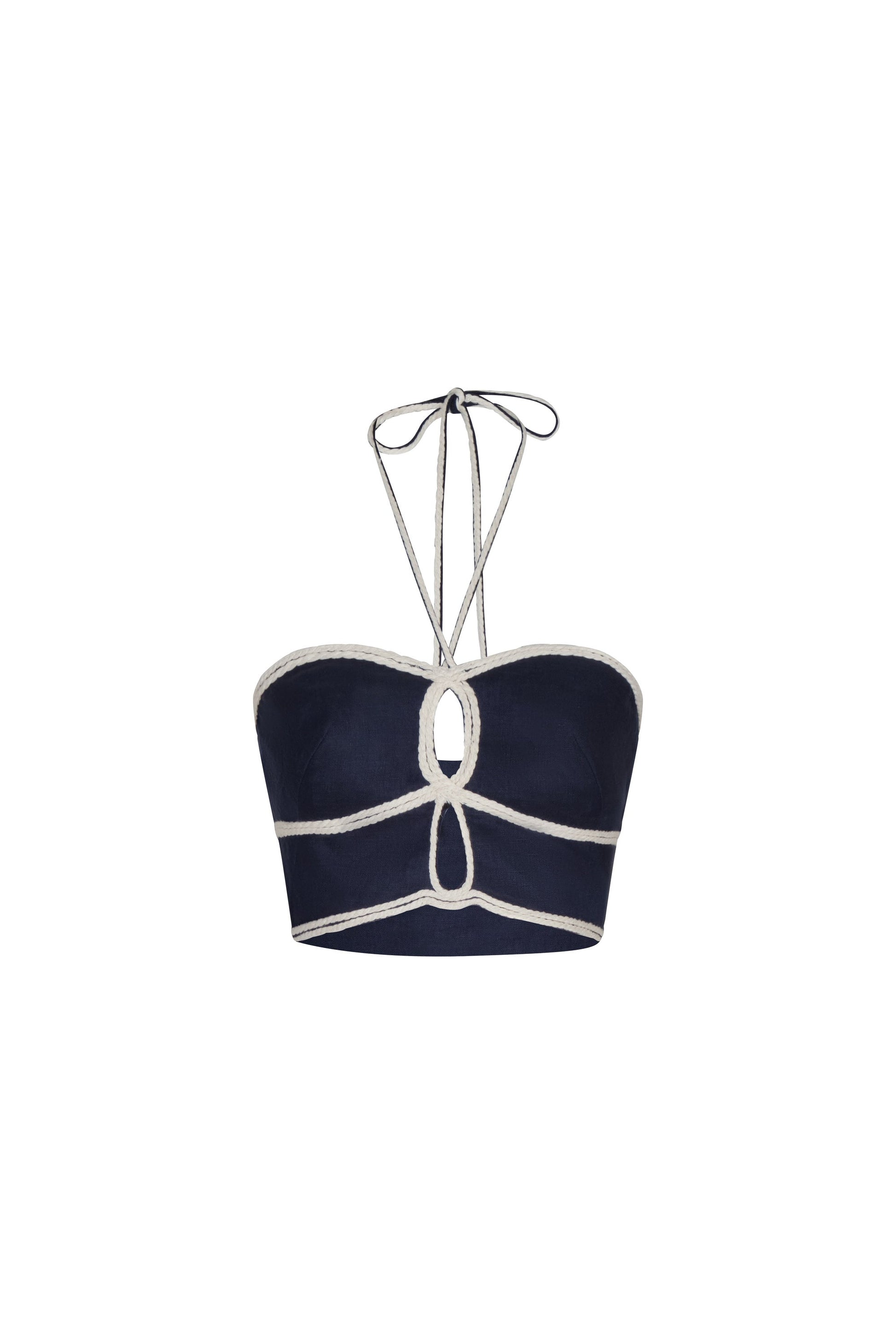 Embroidered top in 100% linen, navy color. Featuring a halter neckline with a central cut-out and delicate contrast trims, it highlights a distinctive design that blends freshness with artisanal sophistication