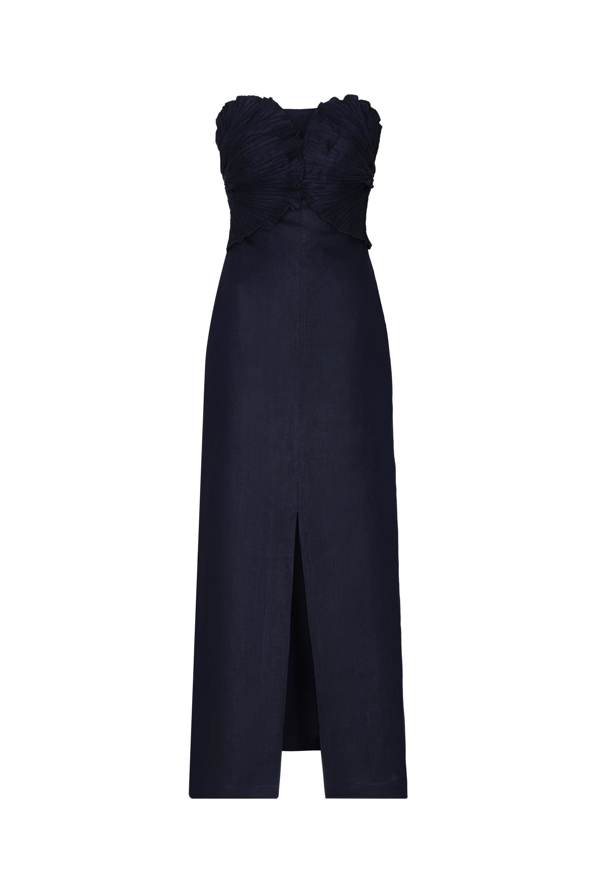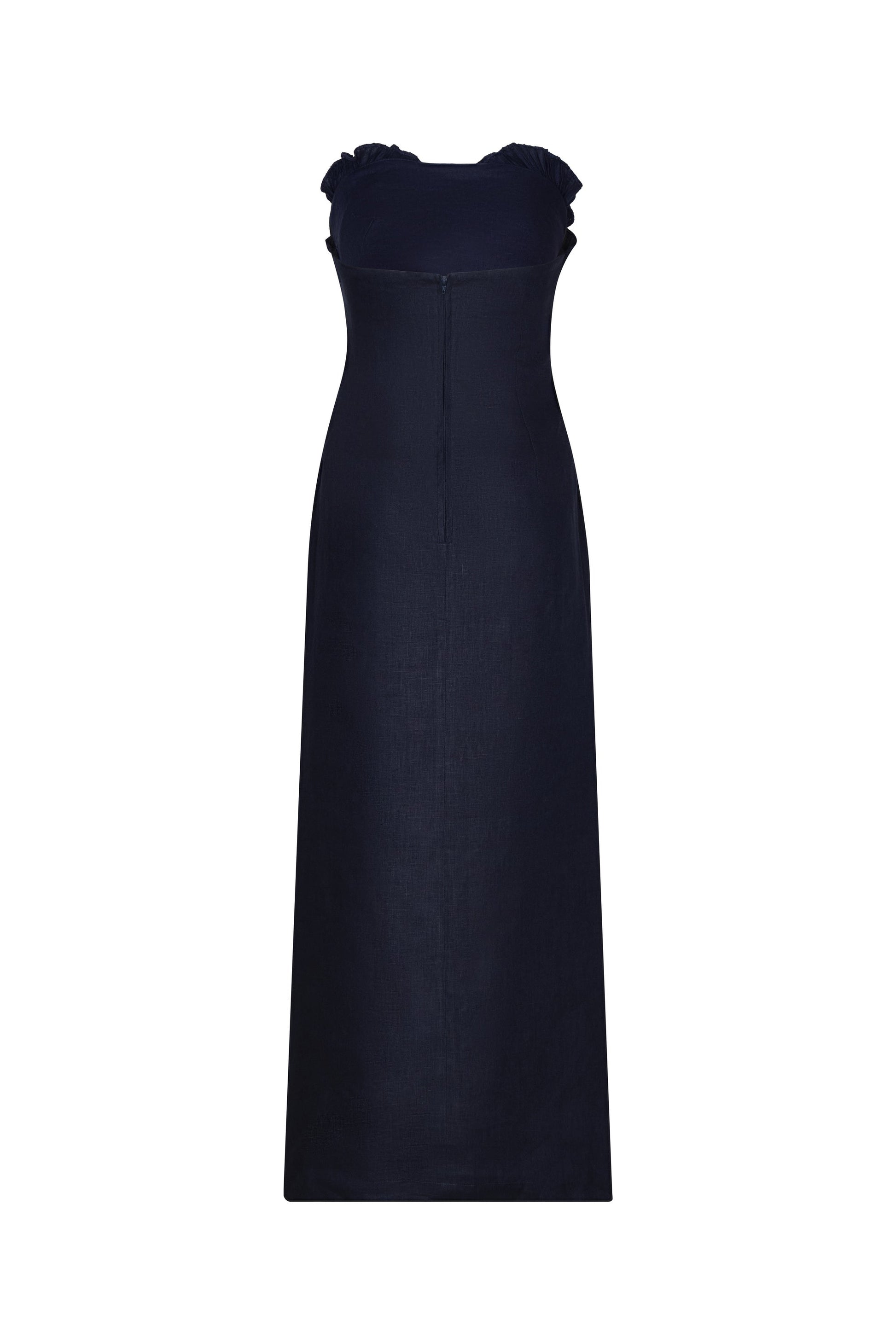 The Bajo Palmera maxi dress is a relaxed yet sophisticated silhouette. Crafted in 100% linen, it stands out with its navy tone and delicate pleats that evoke the freshness of days by the sea.